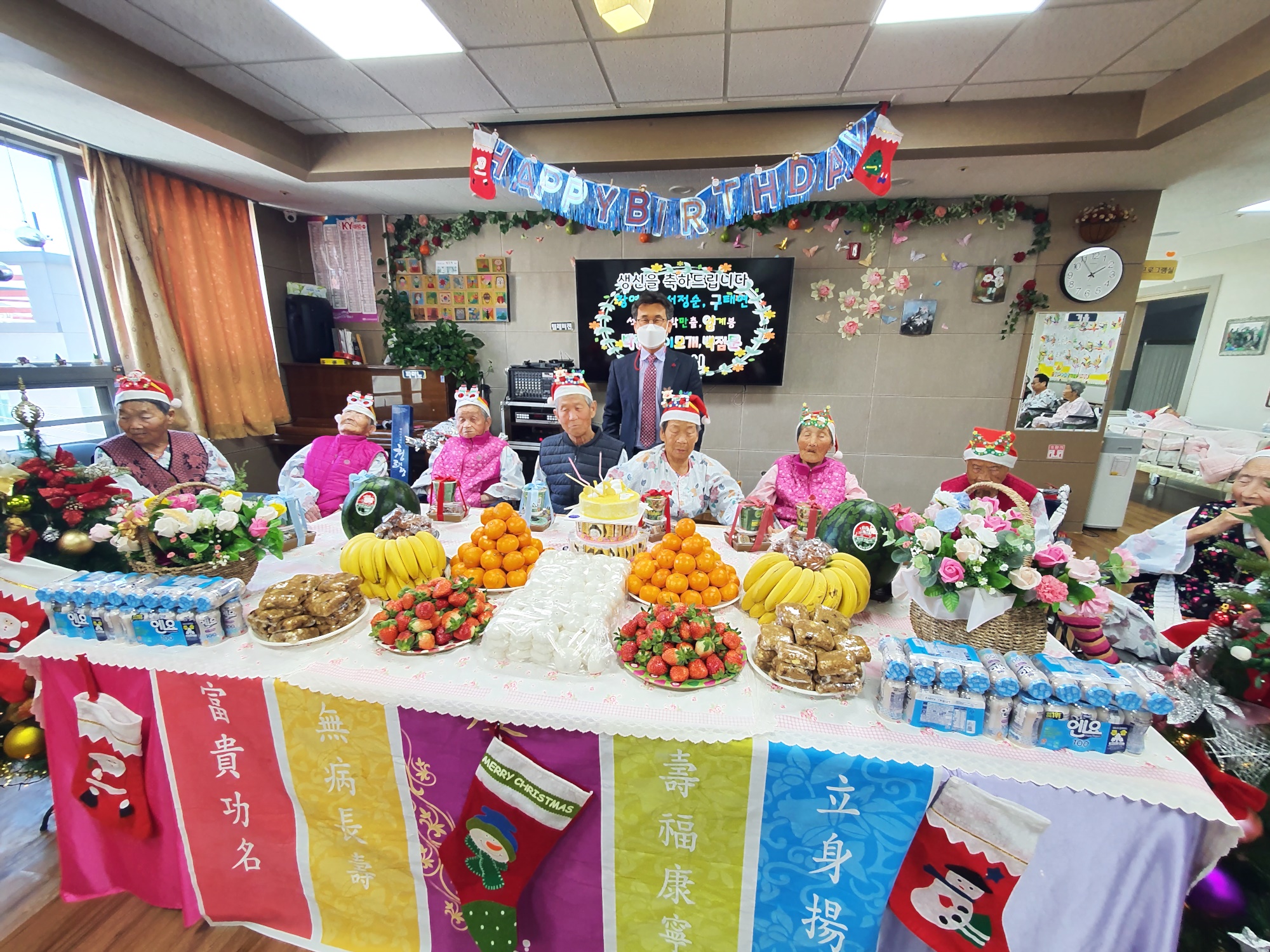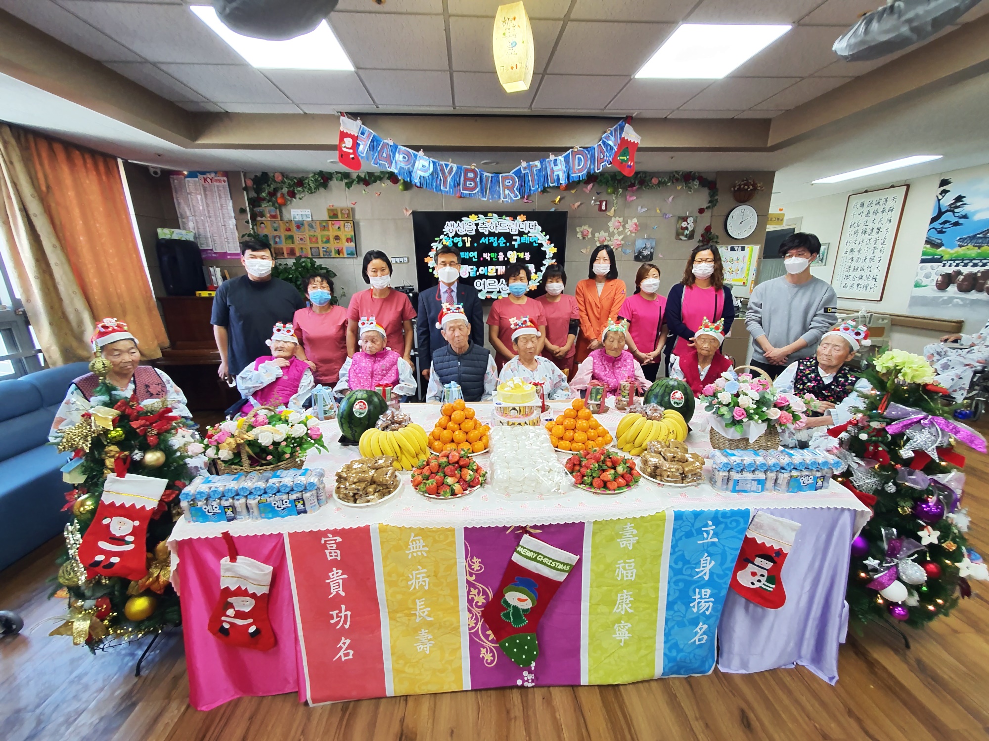 생신을 맞으신 9명의 어르신들과 함께 생신잔치 ~ 크리스마스 분위기로 생신산을 준비 했습니다. 코로나 19로 가족의 참여는 불가피해 요양원 직원들과 흥겨운 시간을 보냈습니다. 어르신 선물은조끼와 티셔츠를 선물로 준비 드렸으며 어르신 개인간식도 전달드렸습니다 박00 어르신 호적상의 100세로 김영규원장님께서 청려장을 전달해 드렸으며 공익요원이 소집해제해 패를 전달하는 시간도 가졌습니다. 생신잔치 후 노래도 부르며 여흥의 시간을 가졌으며 가족의 참석이 어려웠으나 문자를 보내드리고 행사 모습을 다시 문자로 발송드려 홈페이지를 방문하셔서 사진을 확인 하시도록 연락드립니다. 어르신들 가족을 많이 기다리십니다. 저희도 맘이 아프네요 빨리 코로나 19가 종식되어 어르신들이 가족과 함께 참여 하실 수 있기를 소망합니다. 코로나19로 보호자 참여가 힘들어 비대면 영상으로 도움드리나 보호자분들의 일정으로 잘 이루어지지 않음 |