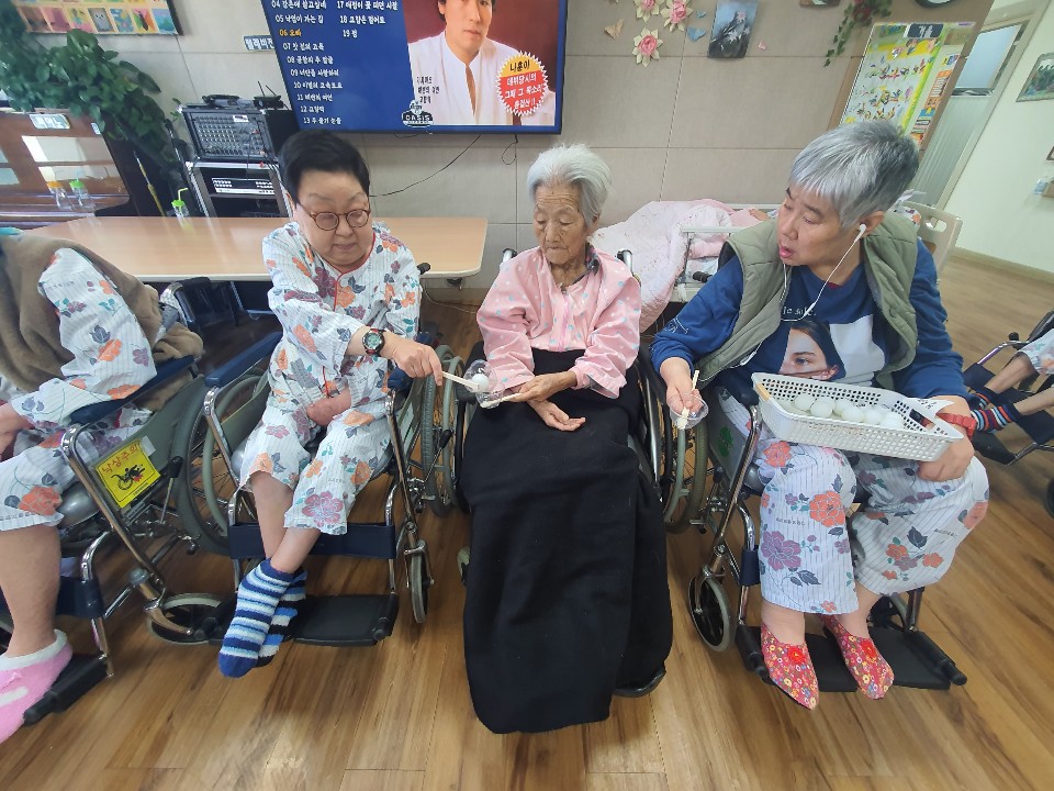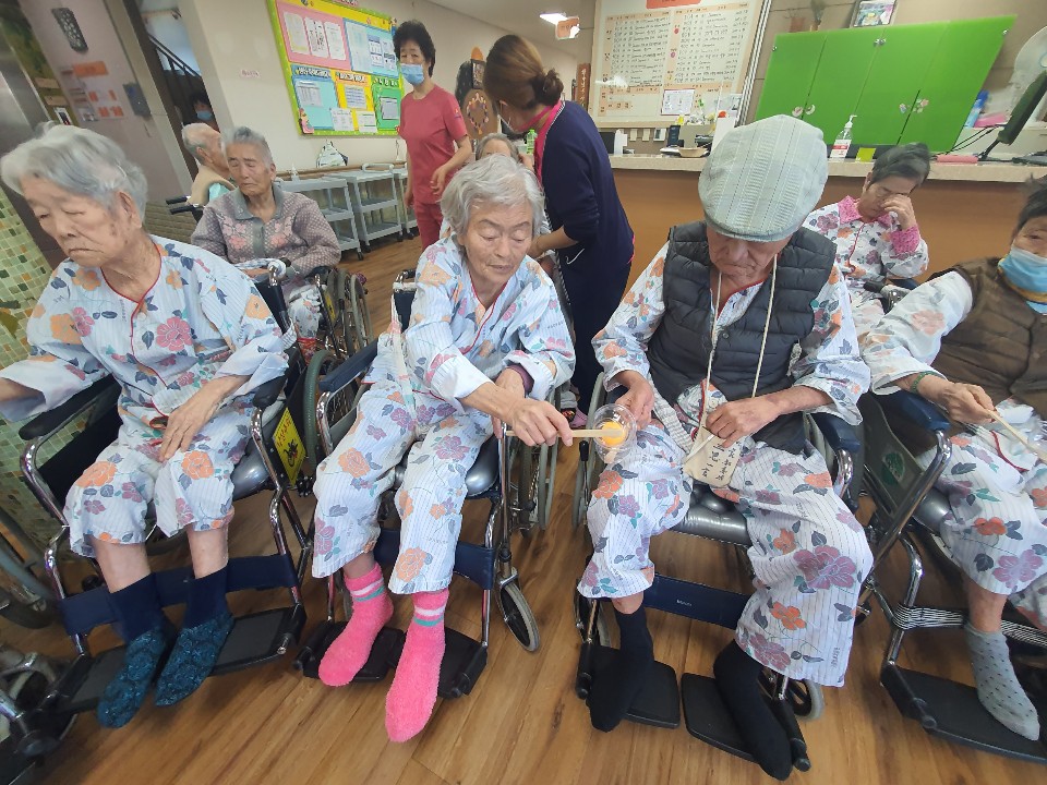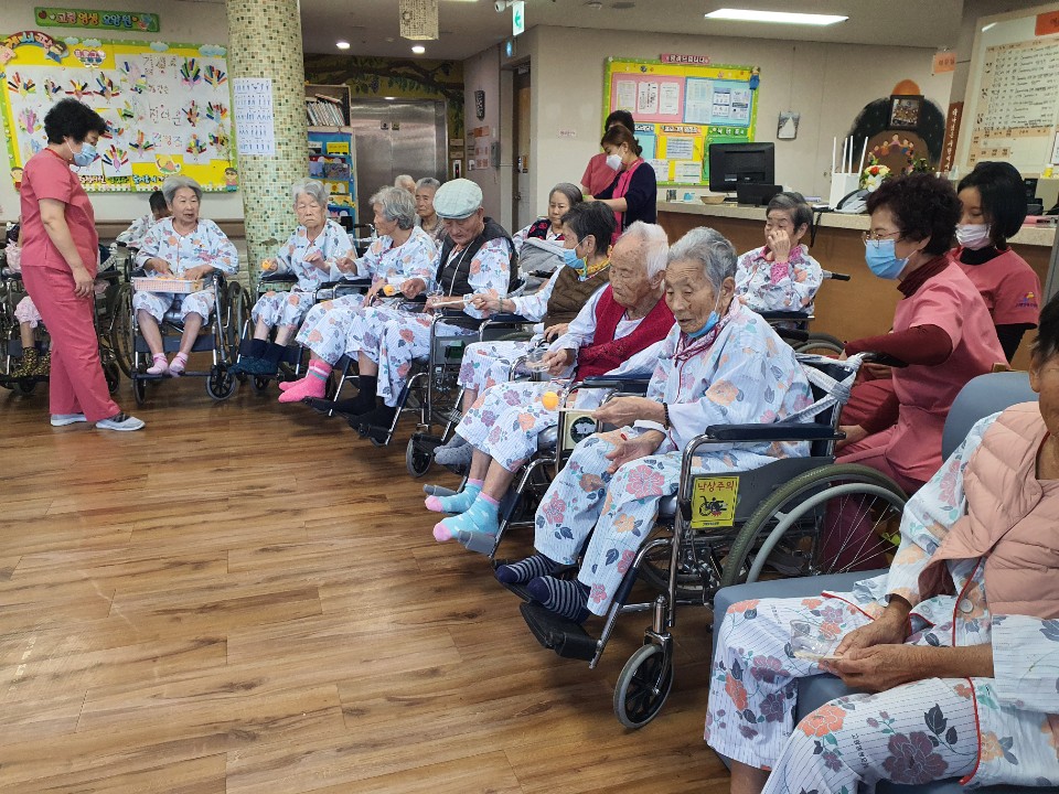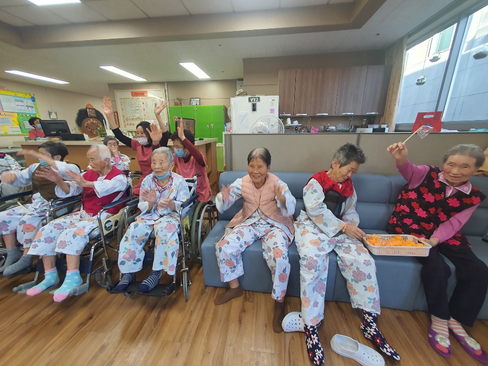 트로틋 음악을 들으며 게임을 진행 합니다. 서로 협심해서 게임을 진행하니 경쟁심과 단합을 함께 느낄 수 있습니다 . 한명은 할 수 없는 게임으로 함께 하는 것이 중요한 게임으로 집중력 있게 게임을 진행 하셨음 어르신 만족감이 높은 게임으로 경쟁심과 남을 배려하는 마음도 함께 배우시는 시간을 가져 봅니다. 이긴 팀은 환성을 지르시며 사탕을 부상으로 받고 즐거워 하심 |