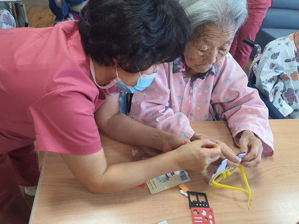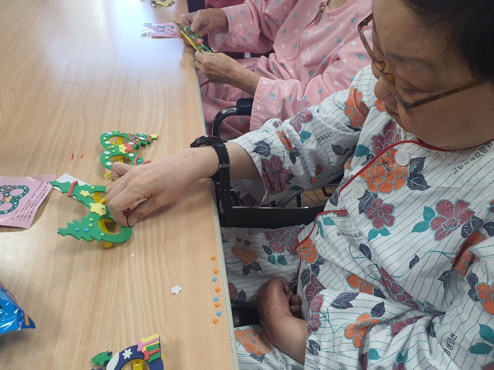 12월 크리스마스 만들기로 안경만들기를 제공드려 크리스마스 분위기를 내며 즐거운 만들기 시간을 가졌습니다. 스티커로 붙이며 소근육활동 색감을 모시며 인지 활동!! 어르신 마다 독특한 스타일로 안경을 만드시고 찰칵~~ 인증샷 남겨봅니다. 수행후 사탕 드시고 손주들 오시면 드린다고 챙기셨습니다. 자식 사랑은 ~~ 자녀 사랑 |