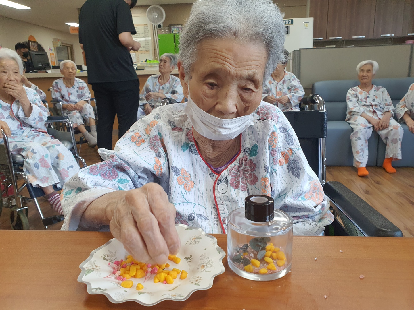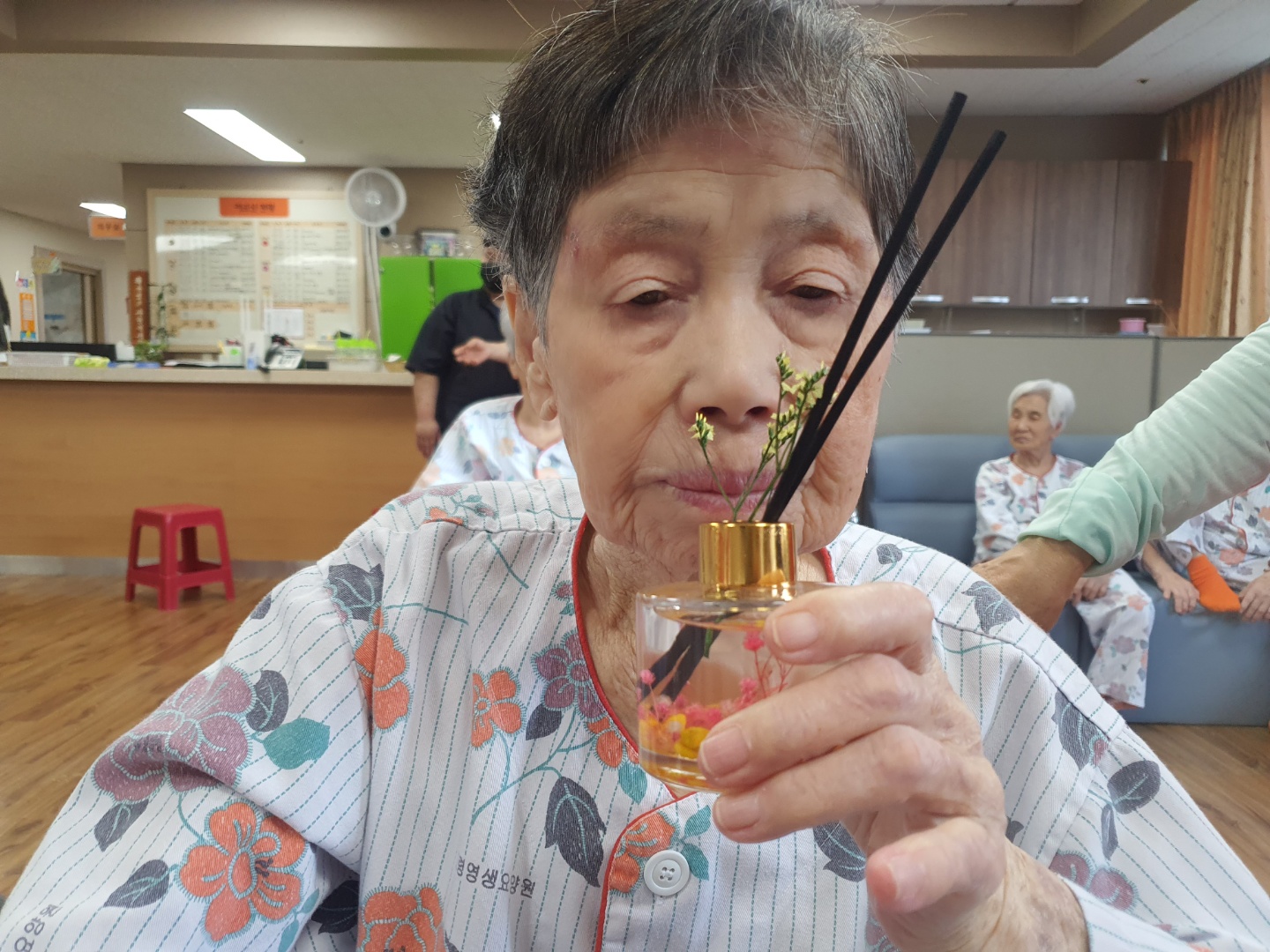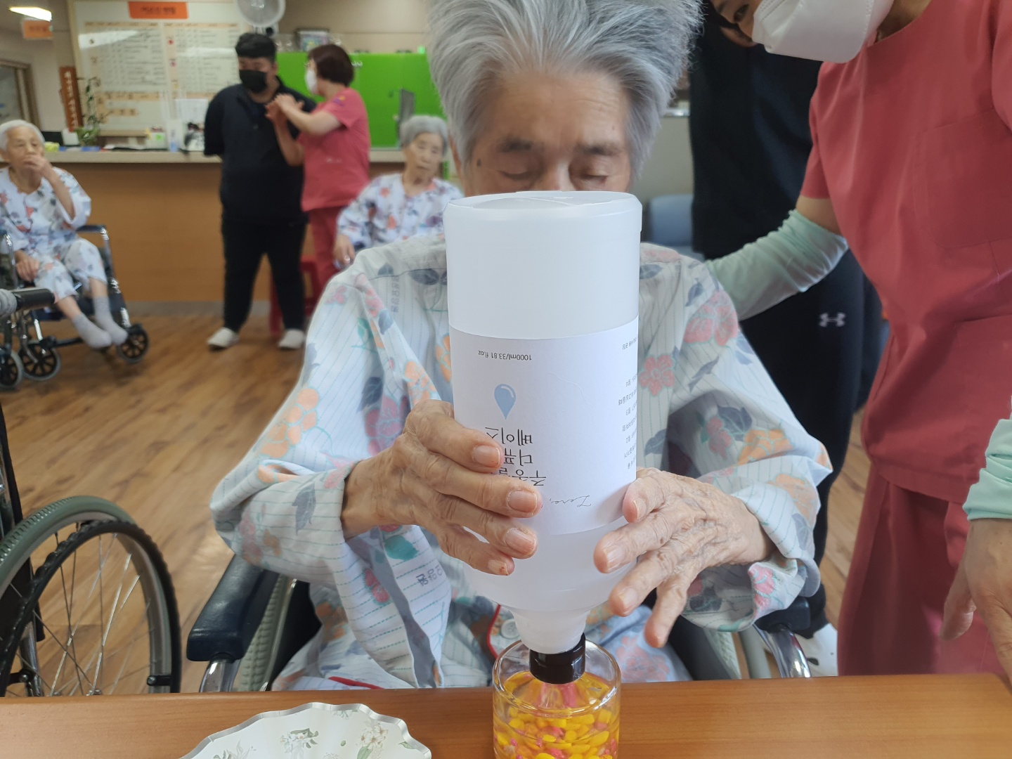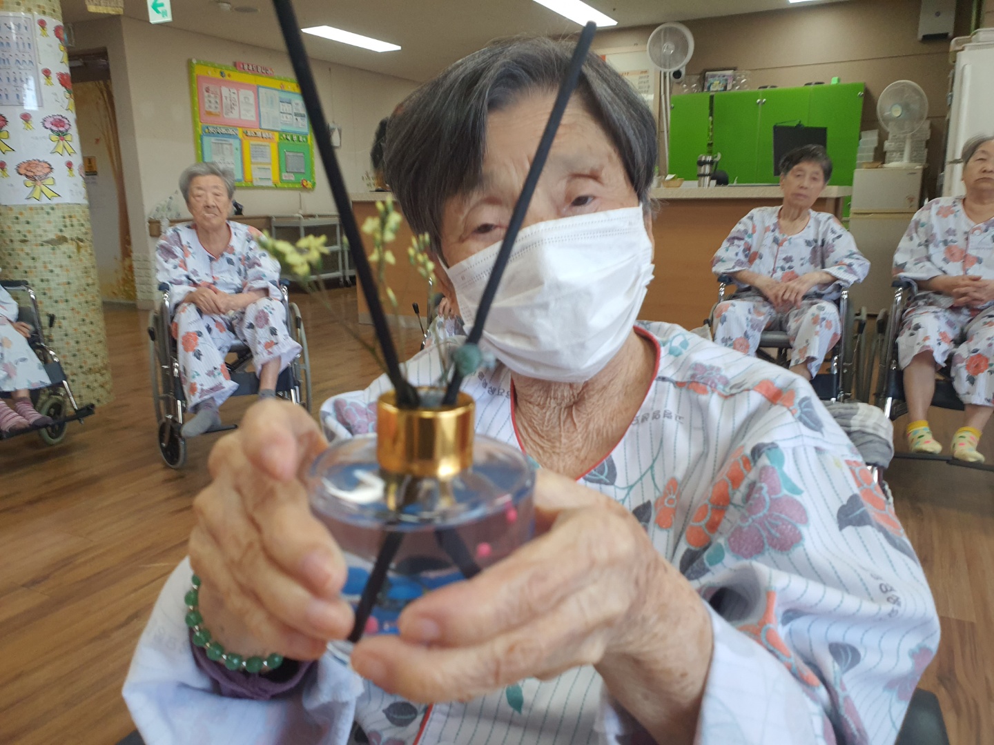 향기 테라피 어르신들과 디퓨저 만들기 체험을 준비했습니다. 블랙체리, 피치 , 레몬등 향끗한 향을 맡으시며 디퓨저 만들기를 진행했습니다. 한분씩 진행드리며 천천히 기다려 주시는 모습들~~ 향기 맡으시고 상큼하다고 하셨습니다. 은은한 향이 요양원 전체에 쏙쏙 어르신들 향끗한 향 맡으시고 안정감 있는 생활 하시기를 바랍니다. |