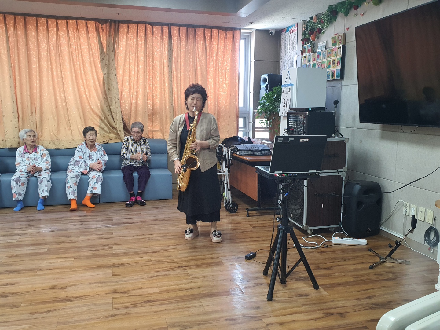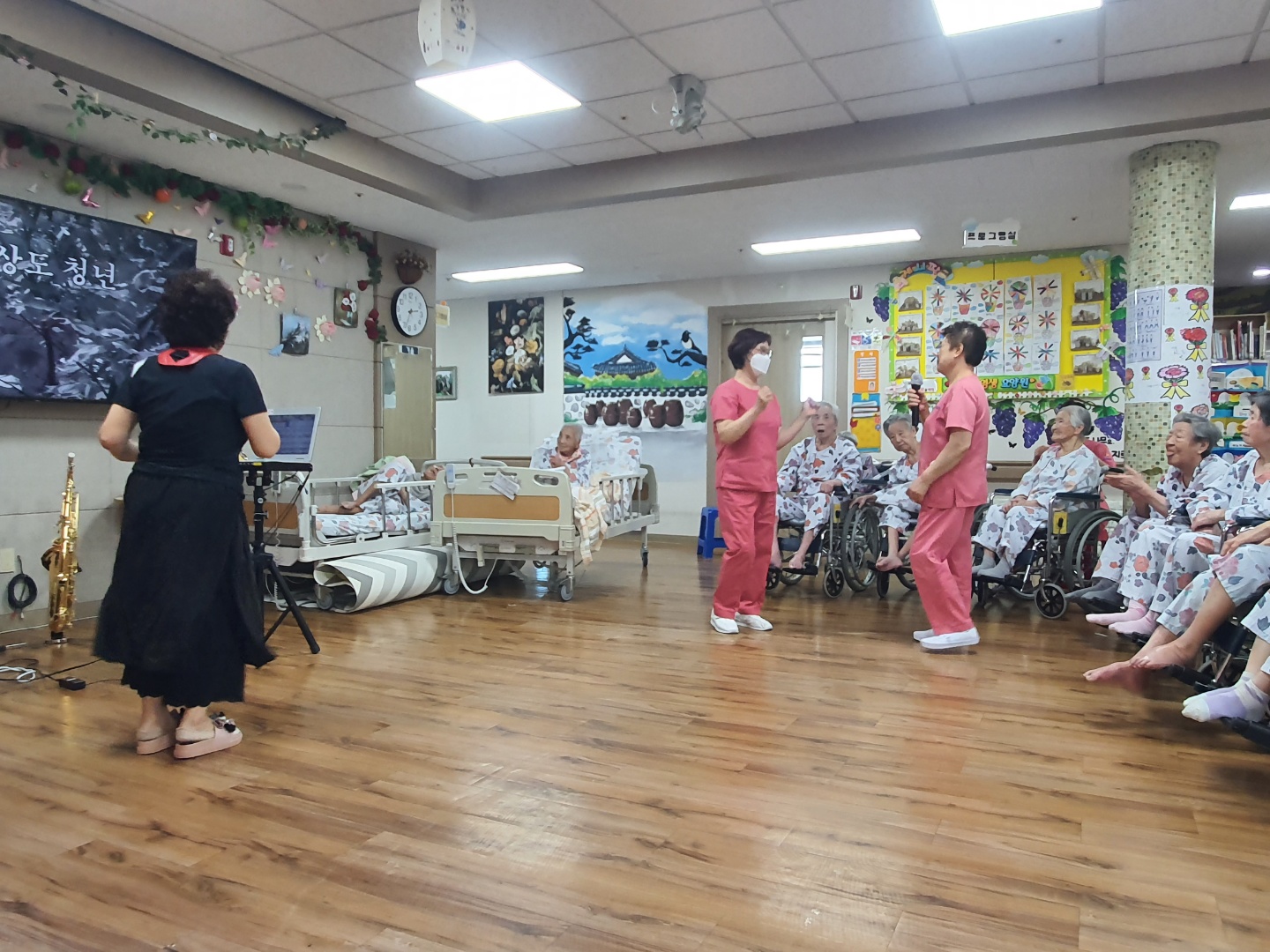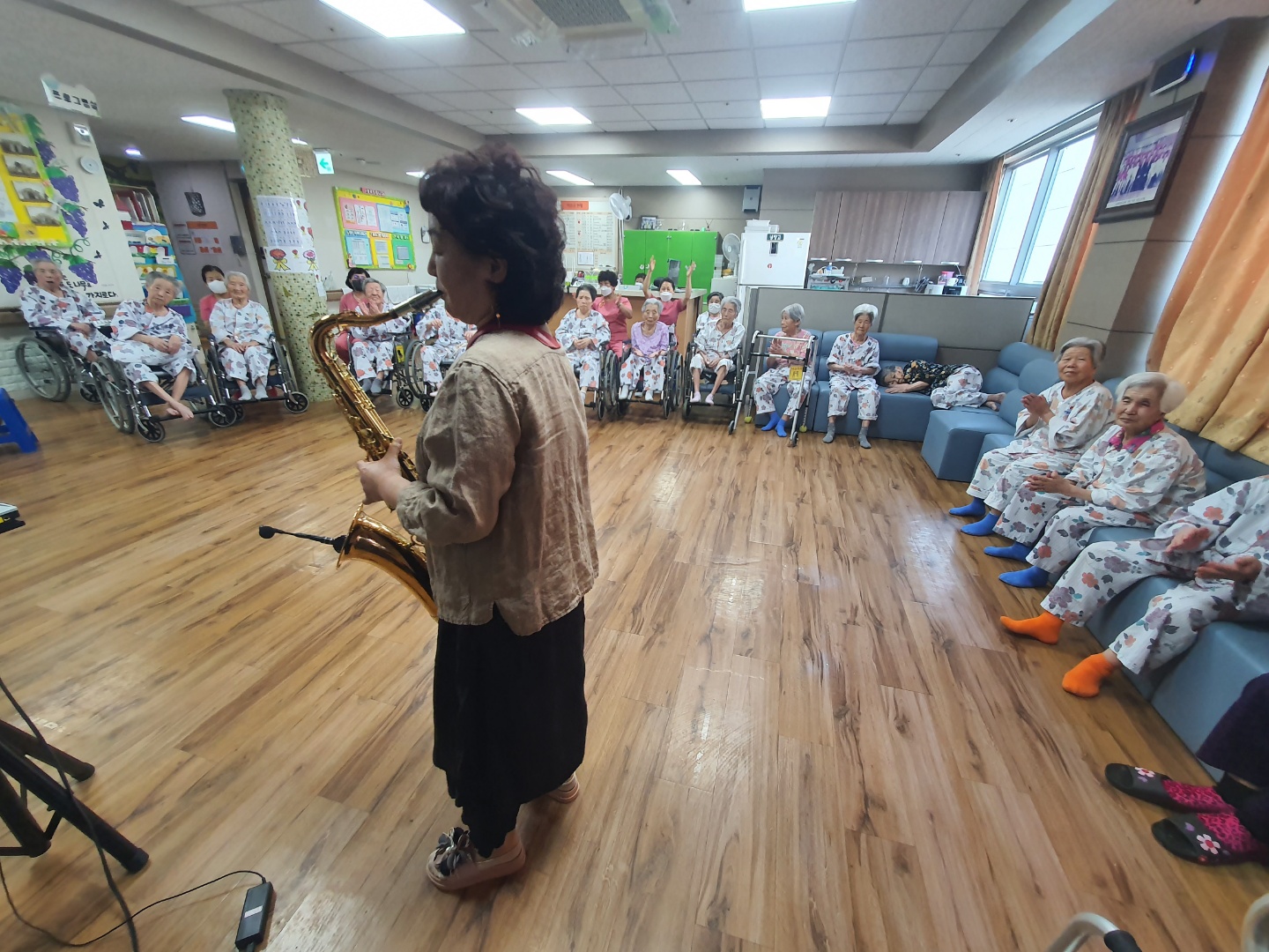 오랜만의 색소폰 연주에 어르심들 흥이 나셨습니다. 어르신들이 좋아하시는 곡으로 공연을 진행 해주셨고 신나게 춤도 추시며 노래도 따라 부르셨어요 요양보호사 선생님들도 노래도 부르시고 공익의 노래도 흥겨우셨는지 어르신들 무대로 나오셔서 춤도 추시며 흥겨운 시간을 보냈습니다. |