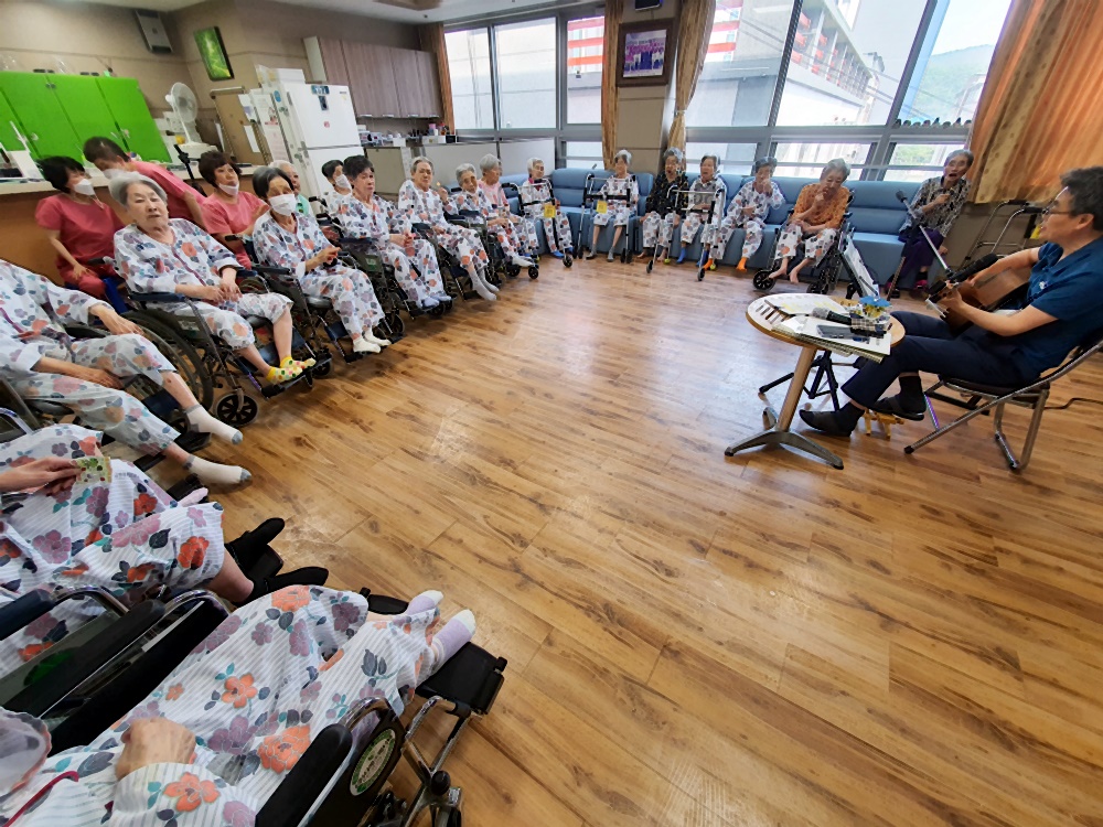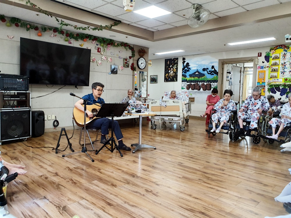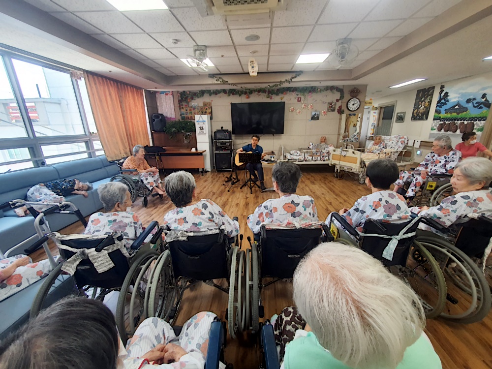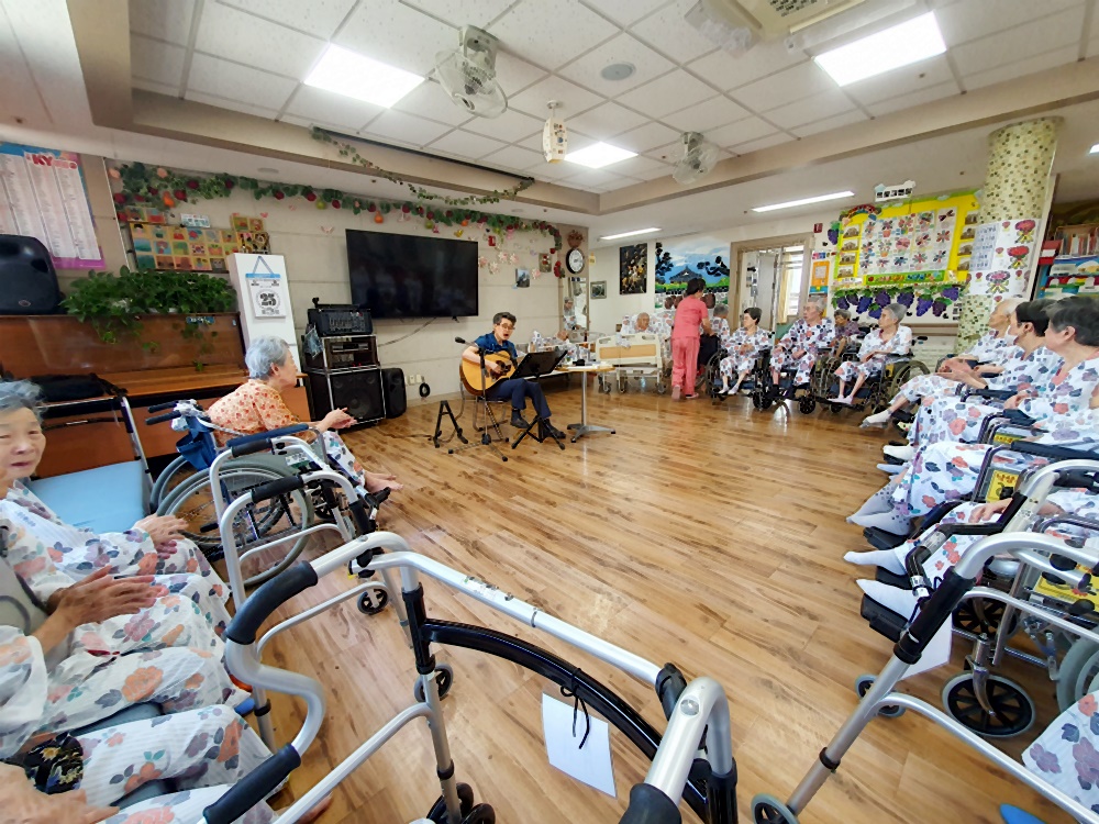 고령영생요양원 김영규 원장님은 어르신에게 추억의 통기타 공연을 준비해 주십니다. 흘러간 옛노래 어르신들이 좋아하는 노래로 추억의 시간을 회상하며 정겨운 시간을 보내십니다. 재미난 입담과 함께 ~~ 귀도 즐거운 시간 추억의 통기타 음악시간으로 들어가 봅니다. 보호사 샘들을 위한 7080 노래 와 개나리총각.섬마을 선생님 노래를 통기타 반주에 맞추어 따라 부르시며 즐거워하셨습니다. 심 |