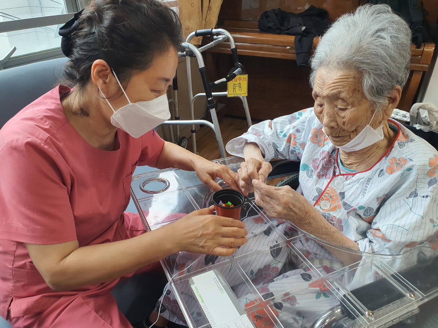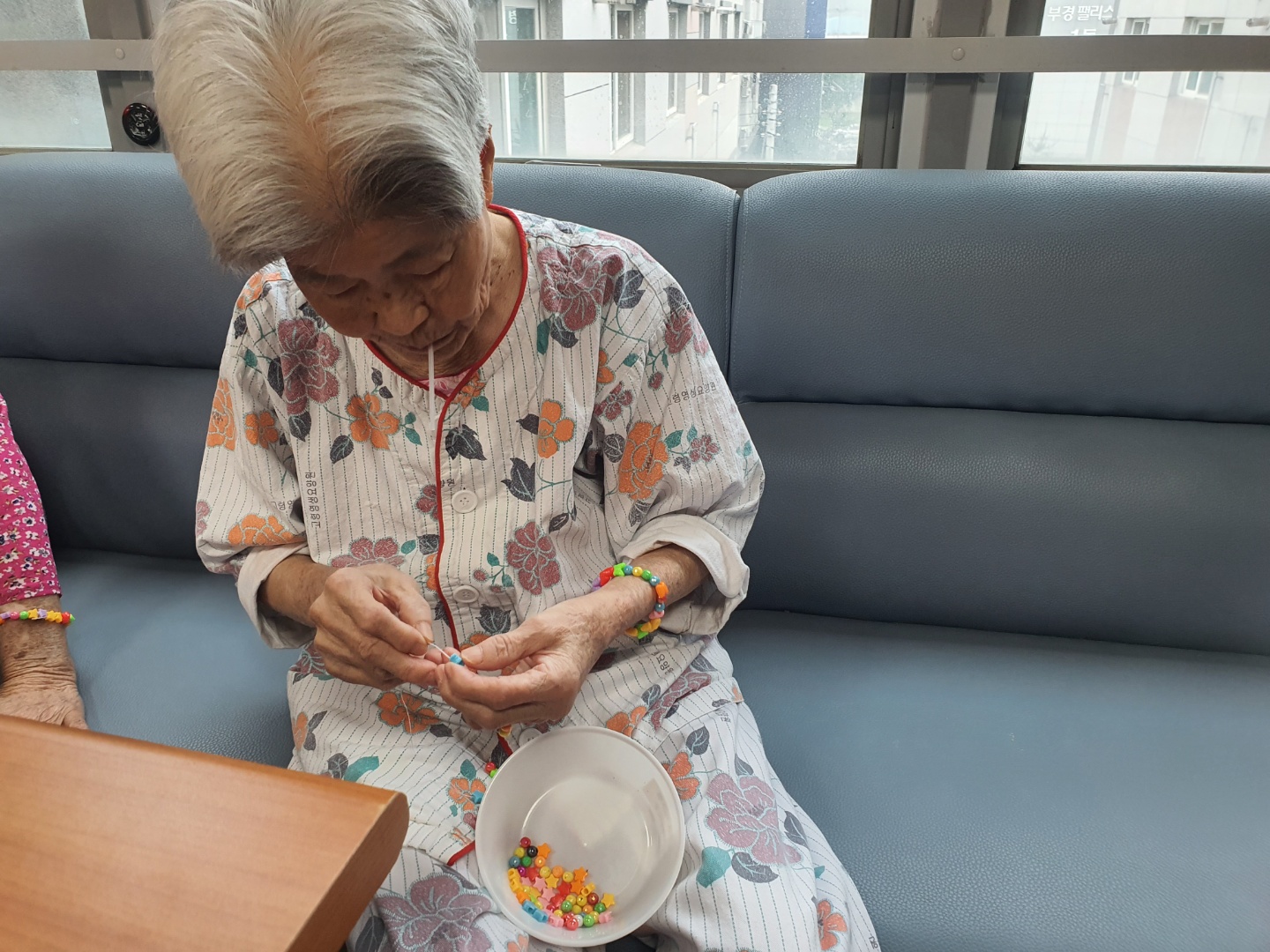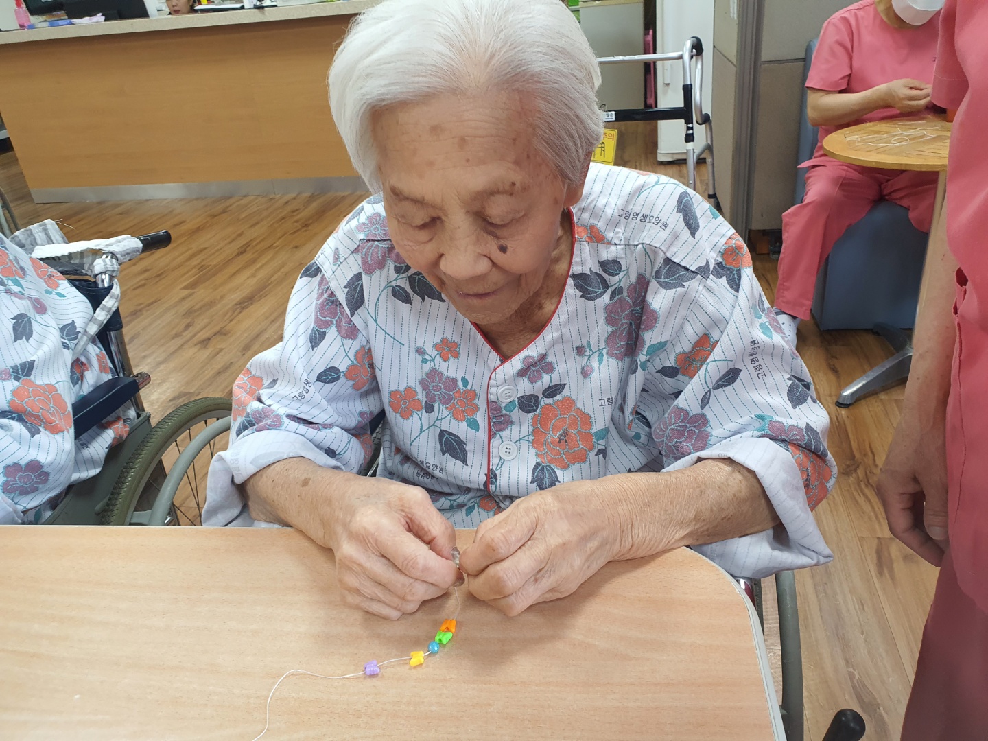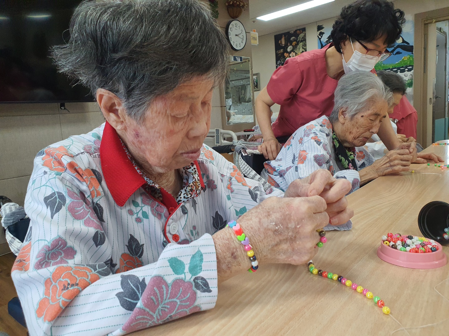 작은 구멍속에 팔찌 실을 끼워 자기만의 개성있는 팔찌를 완성하는 작업입니다. 다 만든 팔찌를 " 에구 머리야: 하시며 팔에 차시고 손을 이마에 붙여~ V 하셨어요 |