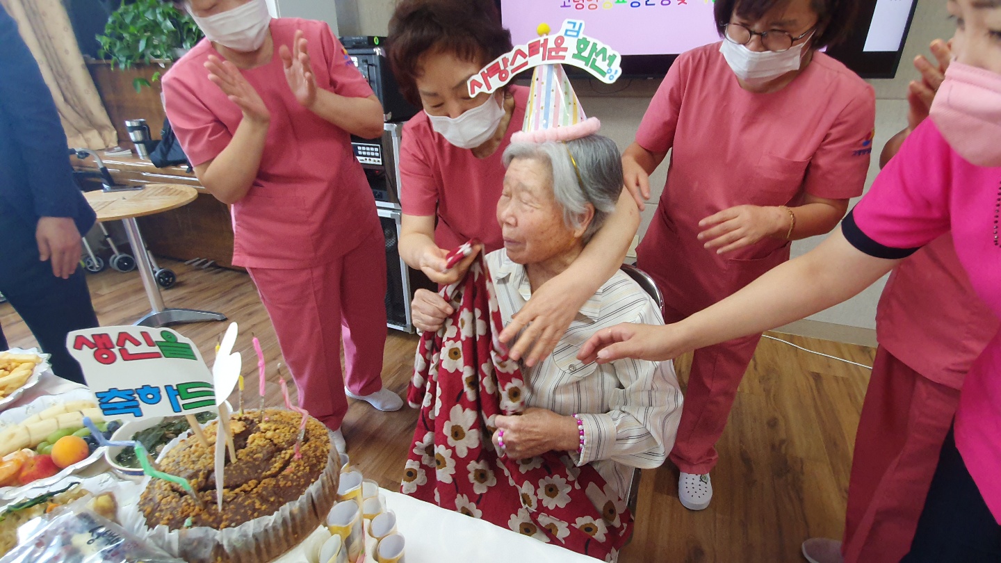 어르신 생신날 가족분께서 떡과 미역국 잡채 과일등을 한상 차려주셔서 멋진 생신을 준비했습니다. 어르신 친구분들과 음식 나눠 드시면서 아들과 며느리가 해온거라고 인사하시면서 뿌듯해 하셨어요 빨간색 옷을 선물로 드렸는데 너무 화려하다고 부끄러워 하셔서 파란색으로 바꿔 드렸는데 빨간색옷이 더 예쁜것 같아 다시 권유드리니 마음에 드신다고 다시 빨간색으로 선물 받으셨습니다. 자녀분과 영상통화도 하시고 찍은 사진을 보여드렸더니 행복해 하셨습니다. |
