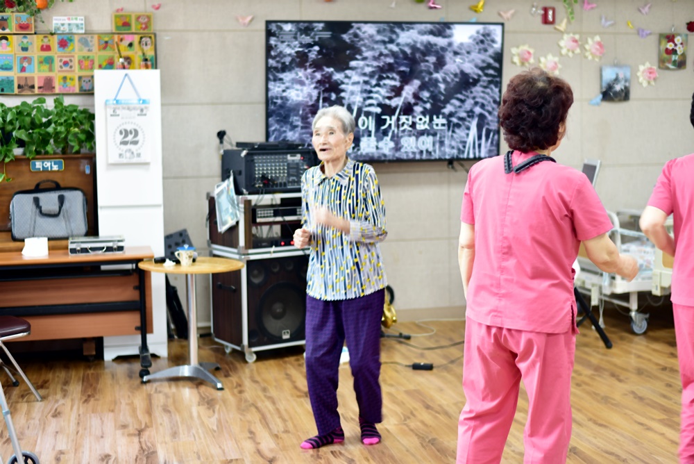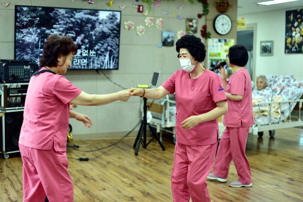 보호사 선생님께서 색 소폰을 배우셔서 어르신을 위해 공연을 준비해주셨습니다. 실력이 전문가 수준으로 어르신들이 좋아하시는 곡으로 공연을 진행 해주셨고 신나게 춤도 추시며 노래도 따라 부르셨어요 요양보호사 선생님들도 노래도 부르시고 공익의 노래도 흥겨우셨는지 어르신들 무대로 나오셔서 춤도 추시며 흥겨운 시간을 보냈습니다. 보호사 샘들의 노래와 춤으로 보행이 가능하신 어르신이 나와서 춤을 추기도 하시며 즐거운 시간을 보내심 |