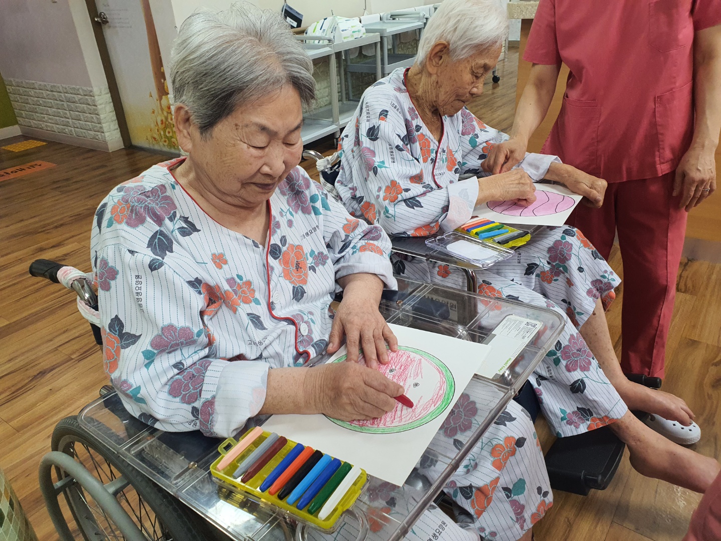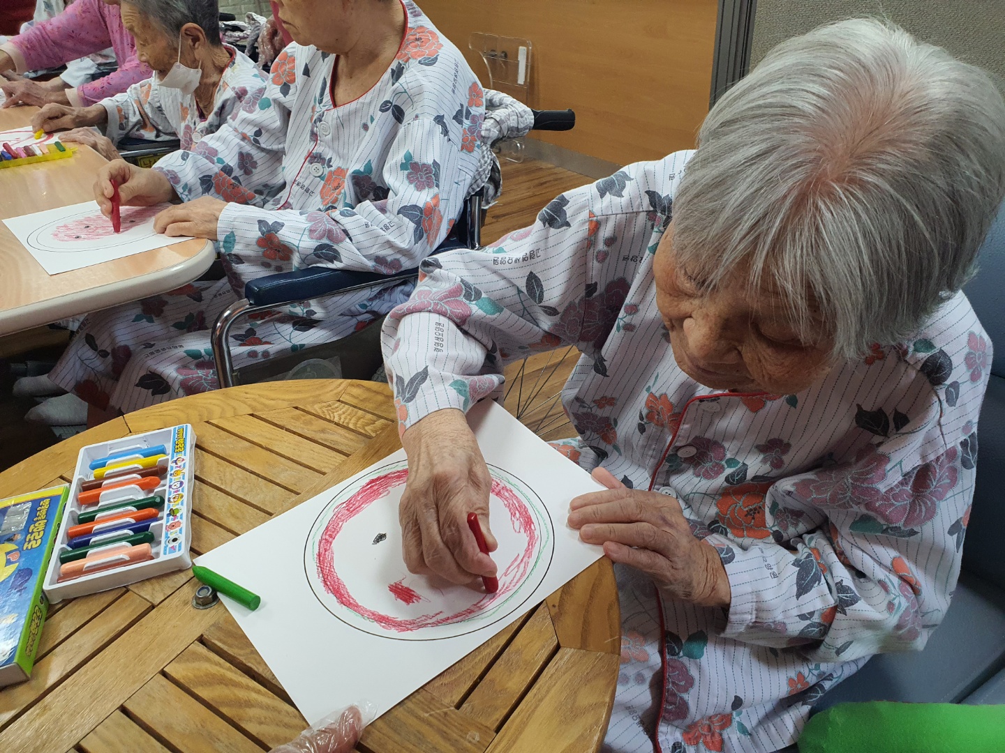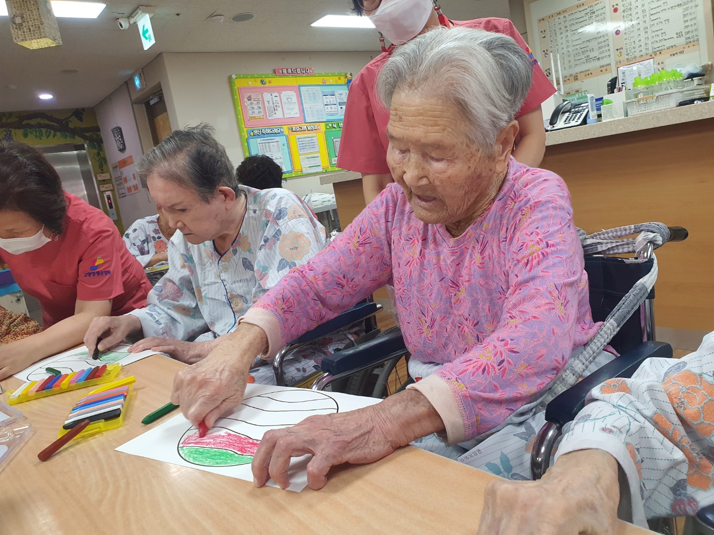 여름철 시원한 수박 모양의 도안을 이용해 색칠을하고 잘라서 둥근 부채를 만들었습니다. 수박이 꼭 빨갛지만 않다 요즘은 노란색 수박도 나온다 하시면서 노란색으로 속을 꽉 채우고 수박의 겉도 노란색을 채색을 하기도 하셨습니다. 어르신 이름을 하나하나 적어 세상에 하나뿐인 부채를 만드시며 뿌듯해 하셨어요 색칠한 후 코팅지를 이용해 코팅을 해 전달 드리니 시원하다 하시면 잘 사용하셨습니다. |