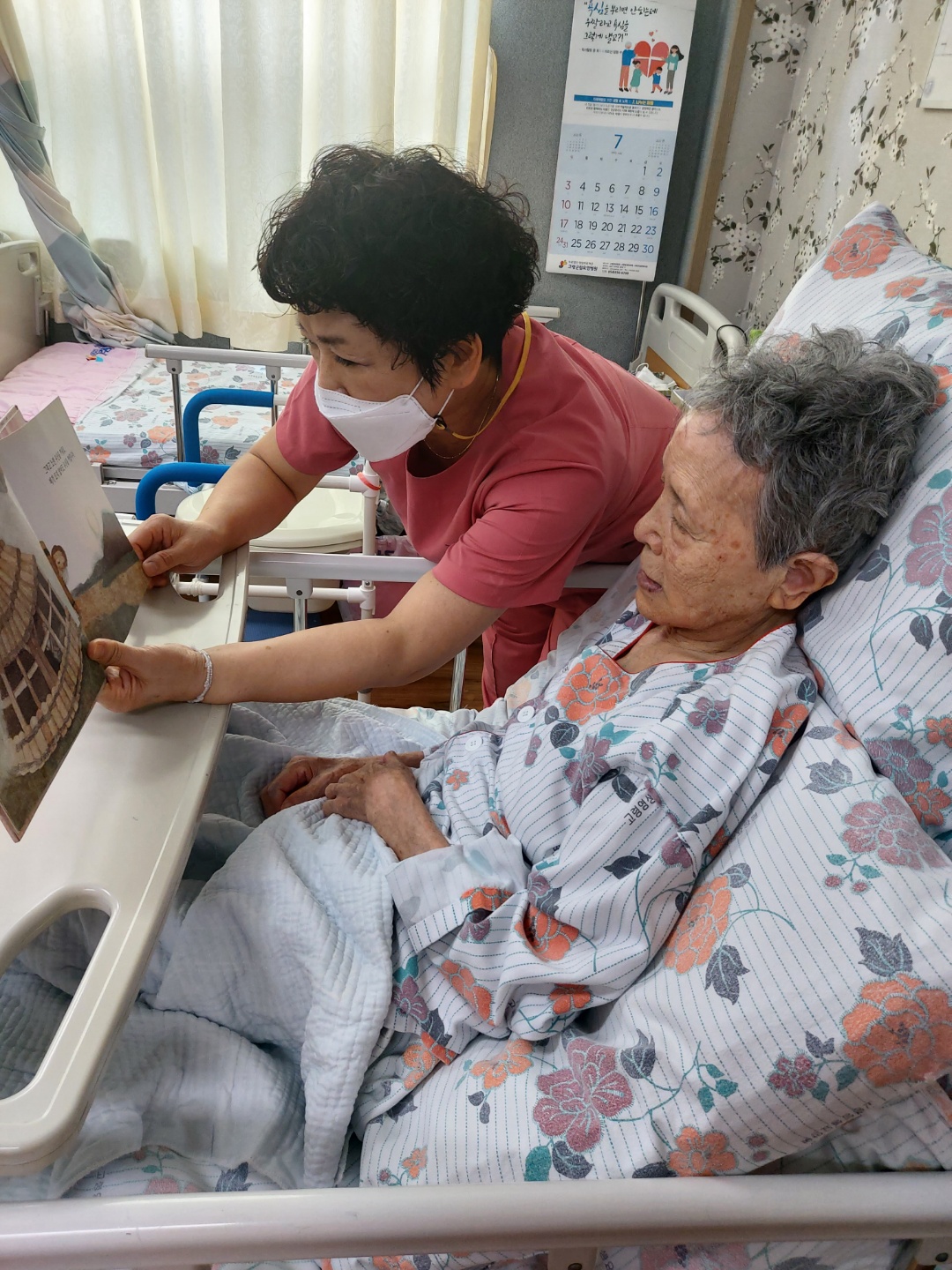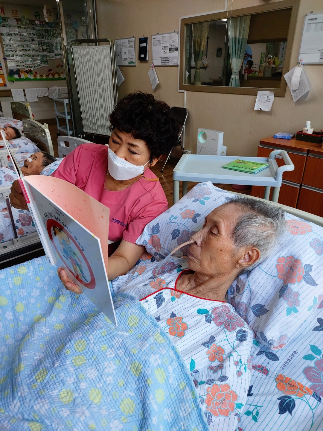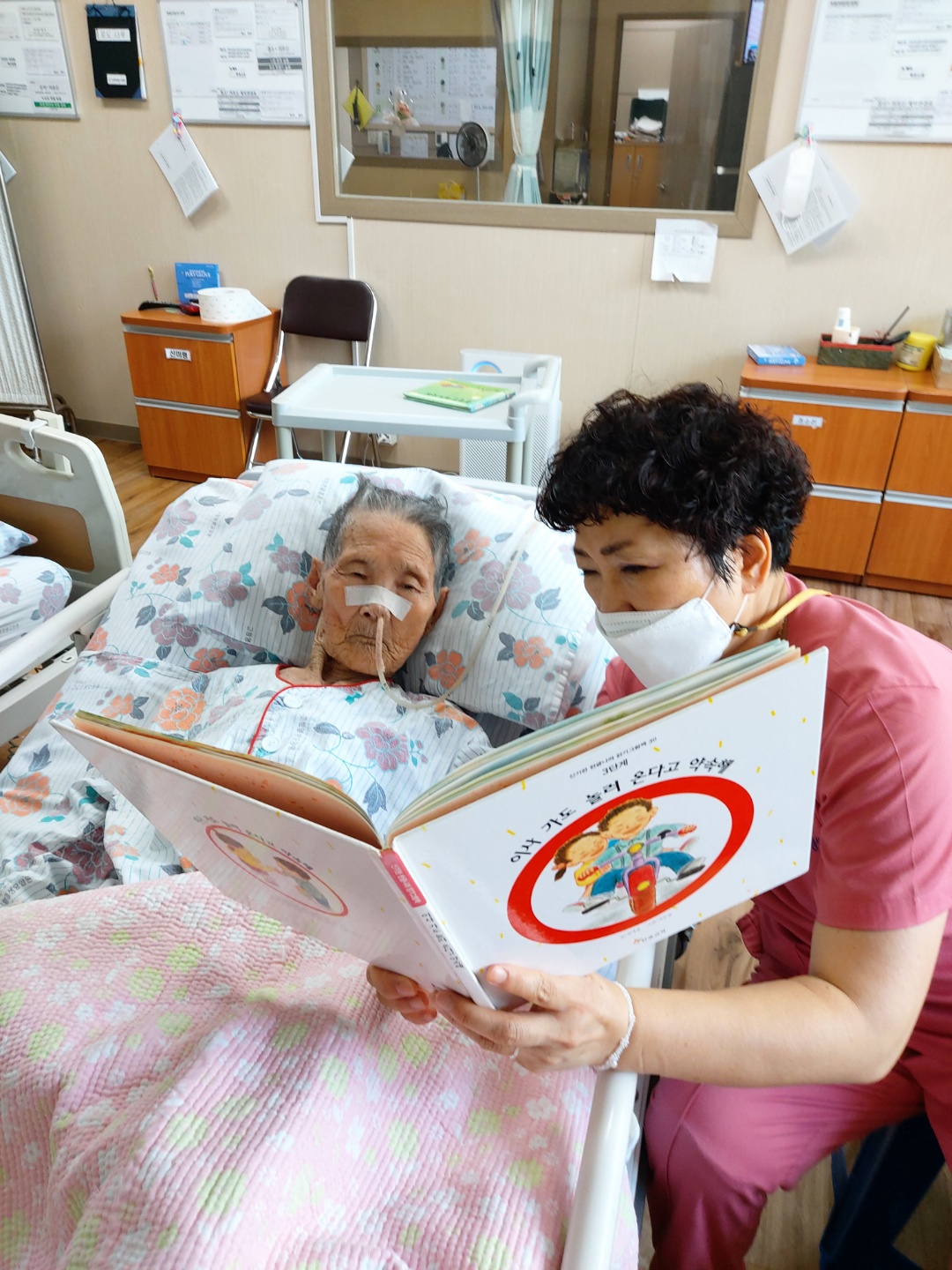 기력이 저하되시고 수행이 어려운 어르신들 침상에서 제공드리는 프로그램 동화책 , 시집등을 읽어드리는 시간입니다. 오전 목욕후 힘드시지만 요양보호사 선생님들 어르신 손발톱 손질 해드린 후 말벗 도움과 함께 책읽기 도움주시고 계십니다. 늘 수고해주시는 보호사 선생님들께 감사드려주세요 |