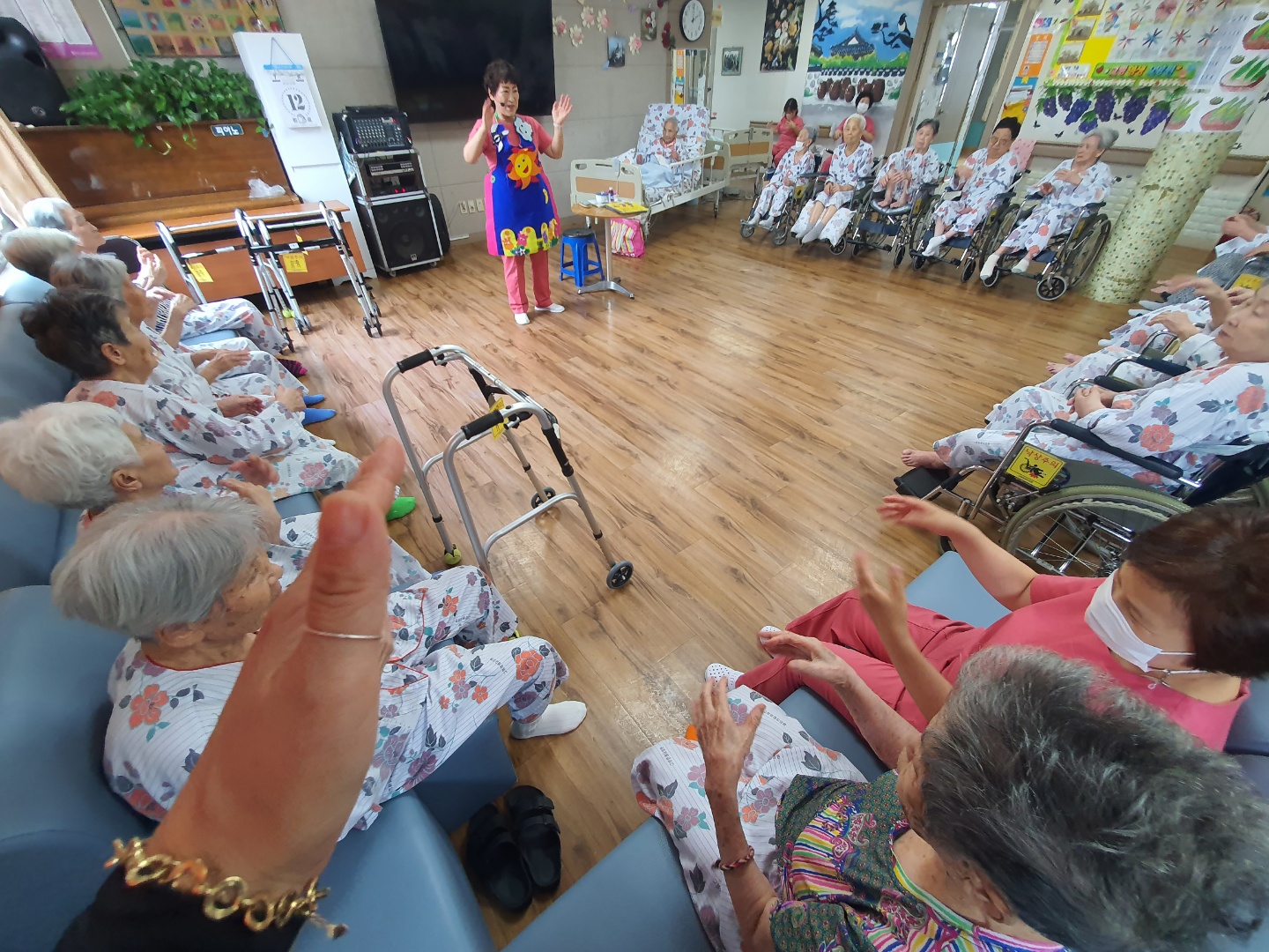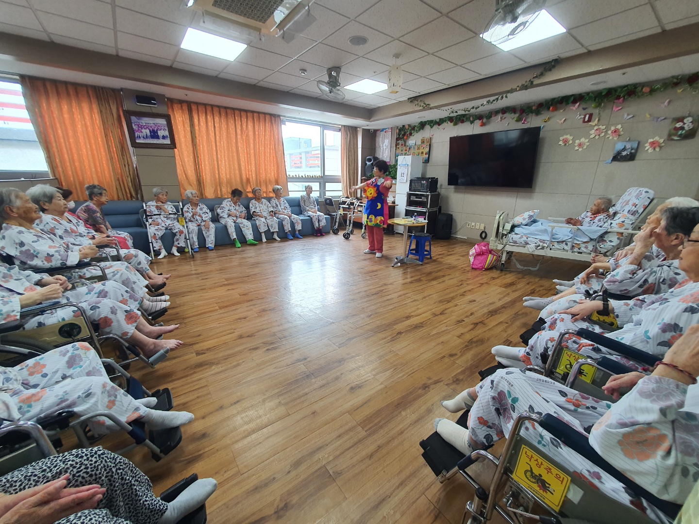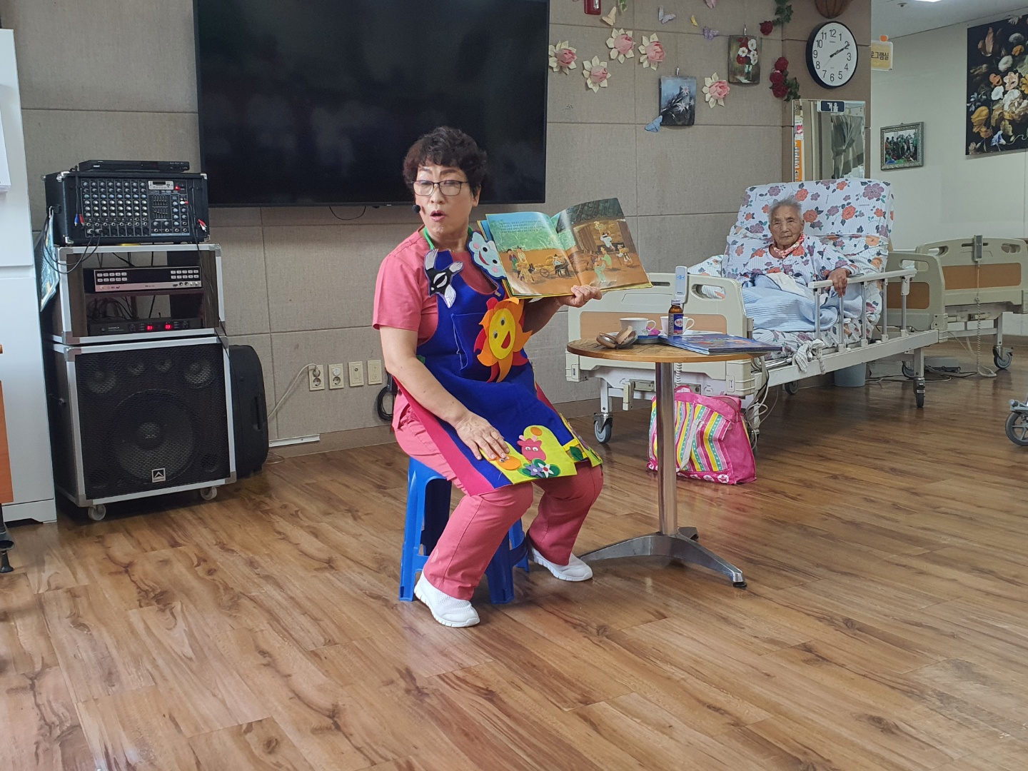 짐승말을 알아듣는 신부와 금덩어리와 바꾼 삼천냥 동화책을 2권 읽어주시고 손유희와 어르신들 인지력 쑥쑥 올려 주시는 시간을 주셨습니다. 동화구연시간 정말 좋아하십니다. |