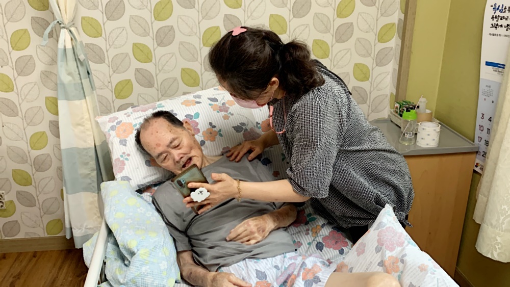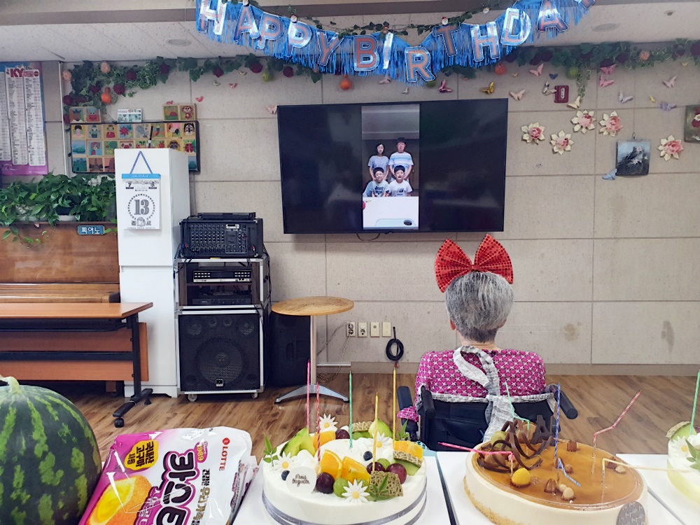 생신잔치 가족들이 보내주신 영상을 보여드렸더니 반가워하시고 눈물도 살짝 흘리셨습니다. 생신날 코로나로 가족이 함께 하지 못하지만 영상을 제공받아 어르신에게 제공드리고 있습니다. |