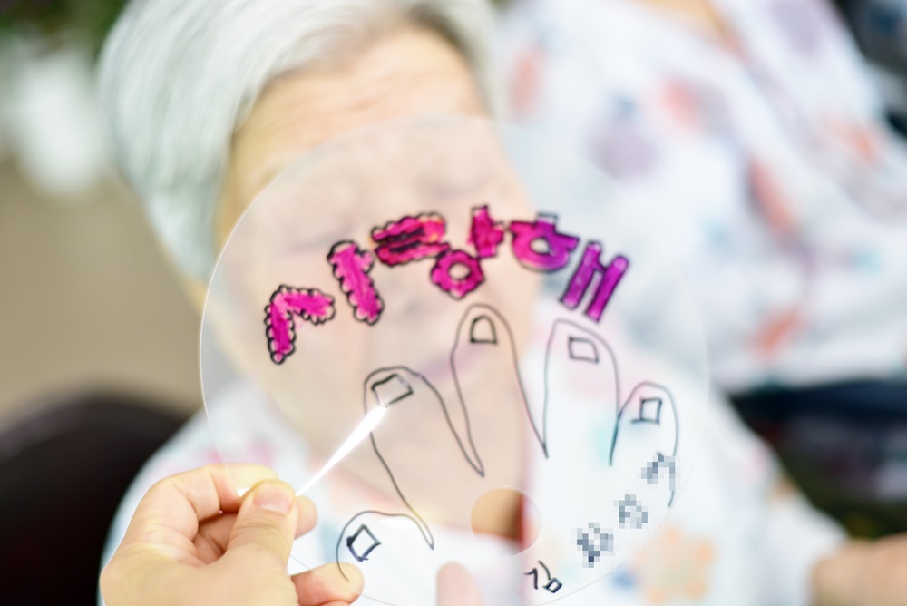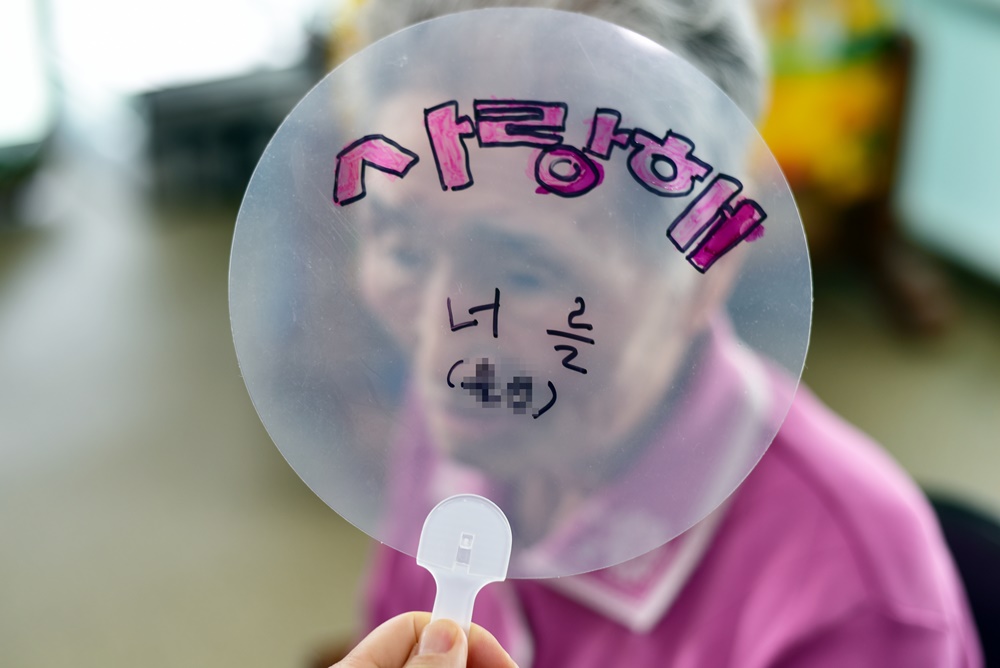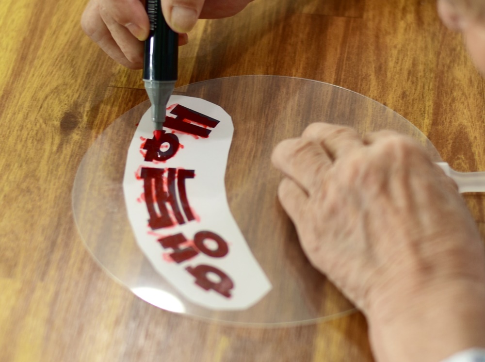 투명한 부채에 캘리그라피 부채를 만드는 시간입니다. 어르신 몇분만 모시고 진행드렸으며 나머지 어르신은 책읽기를 진행 드렸습니다. 행복해 사랑해 글씨를 따라서 이쁜 캘리그라피 부채를 만드셨습니다. |