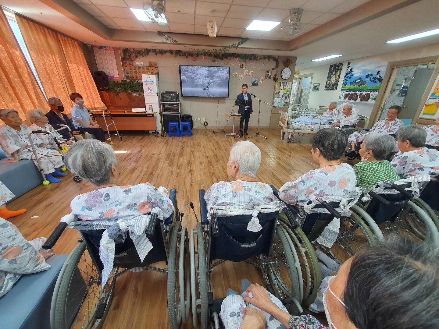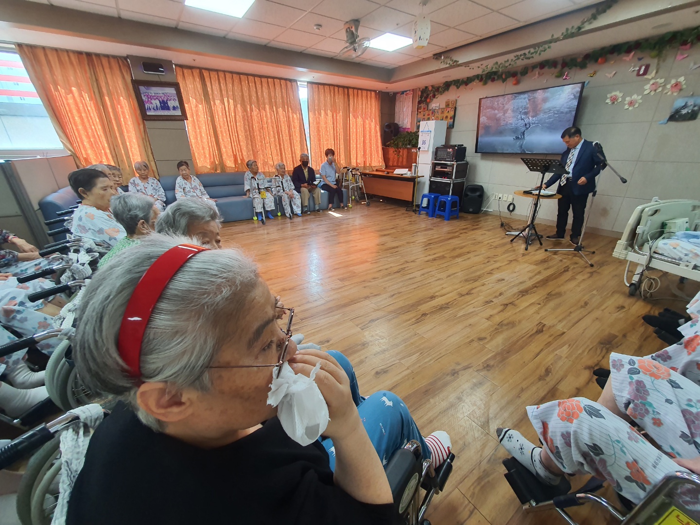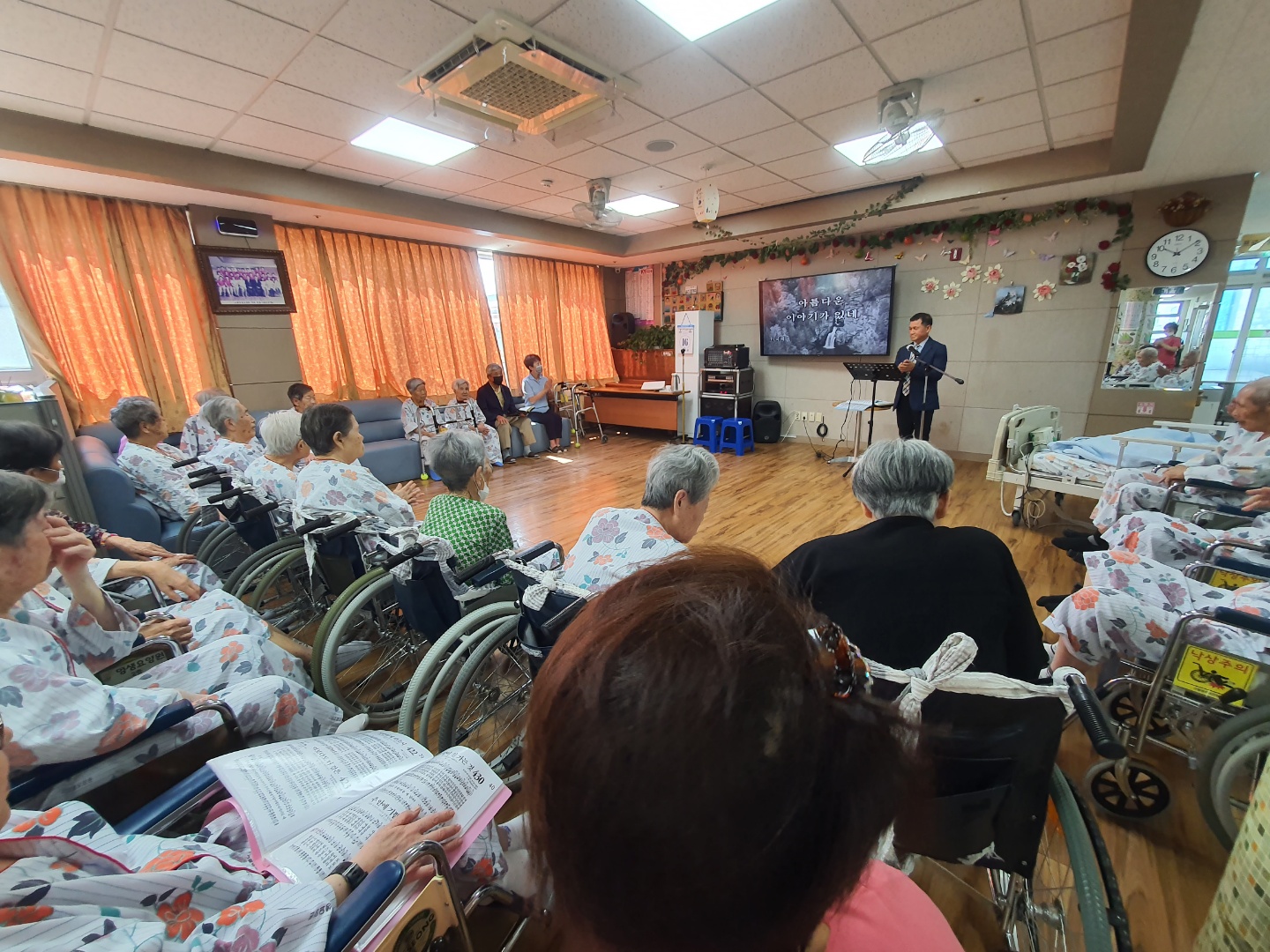 예배활동으로 어르신들 정서적 지지와 안정감을 드리고 있습니다. 종교를 떠나서 어르신들에게 마음에 위안이 되는 시간 함께 찬양도 하시면서 좋은 말씀에 감동도 받으시며 눈시울도 훔치시는 모습~ |