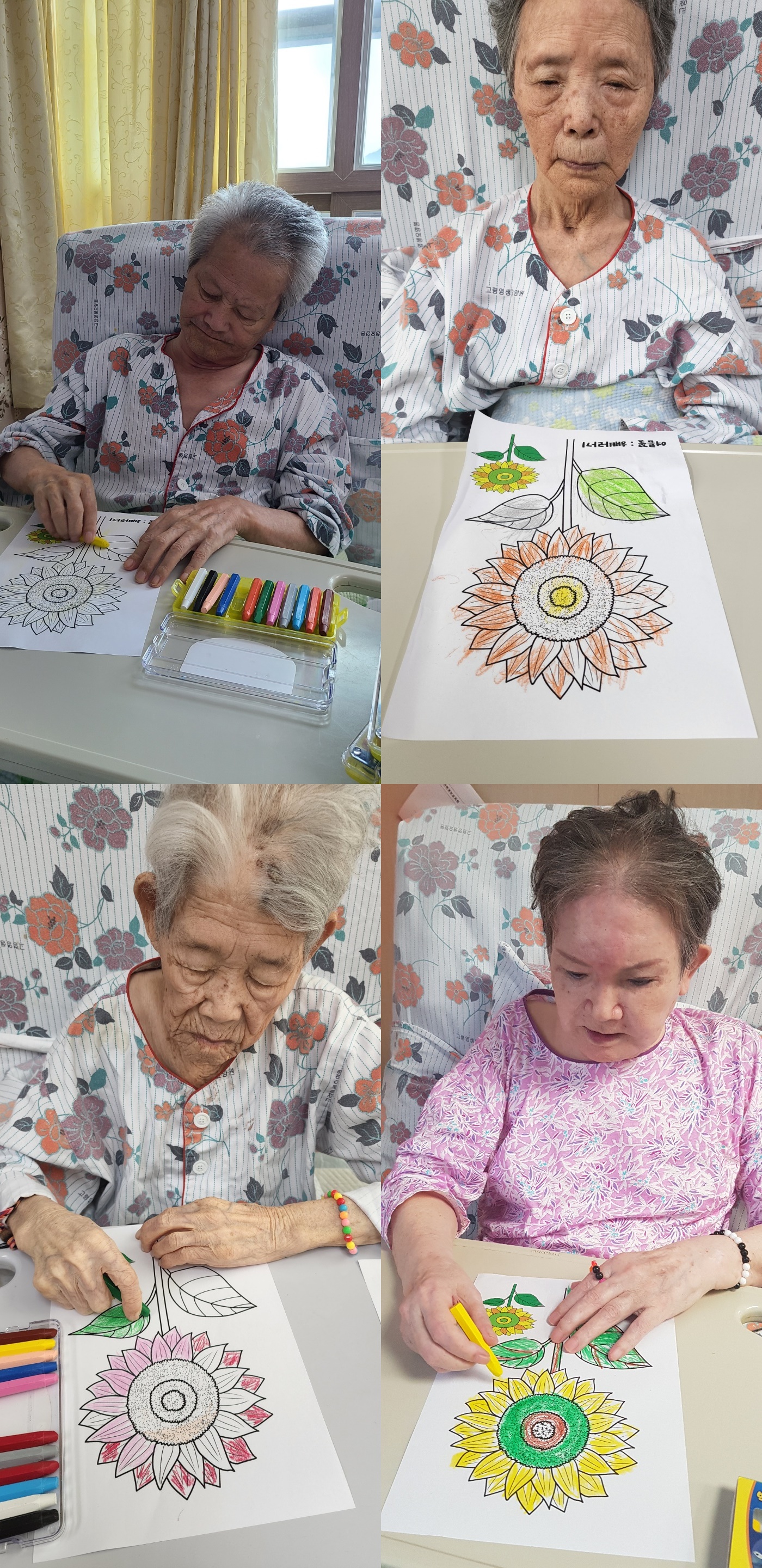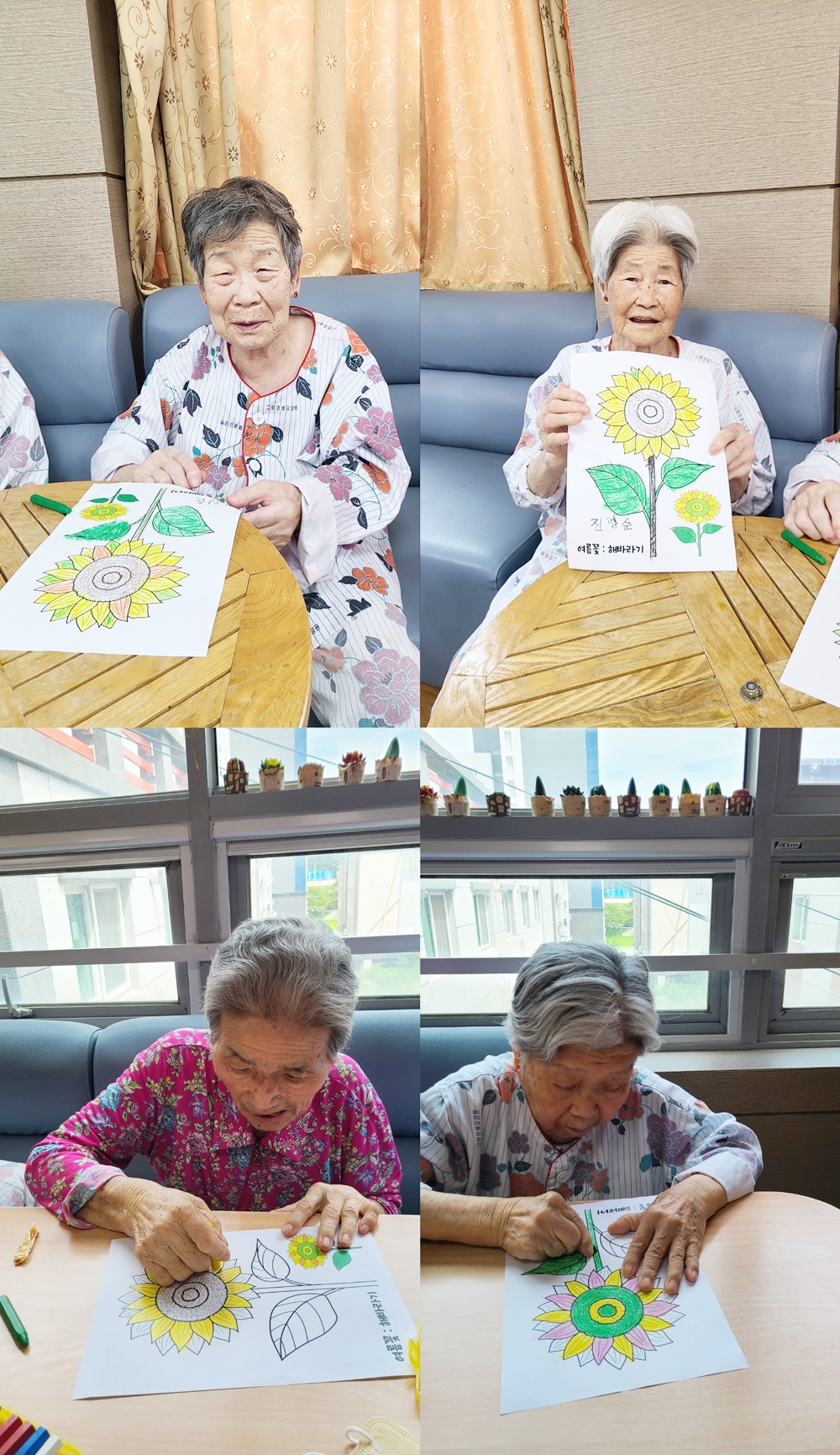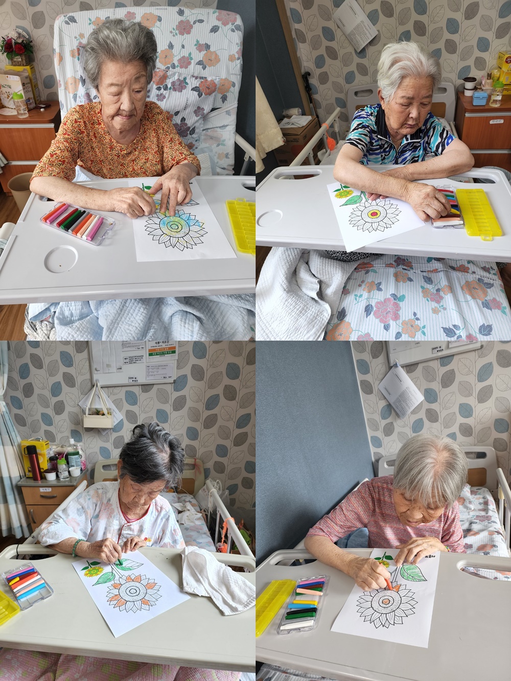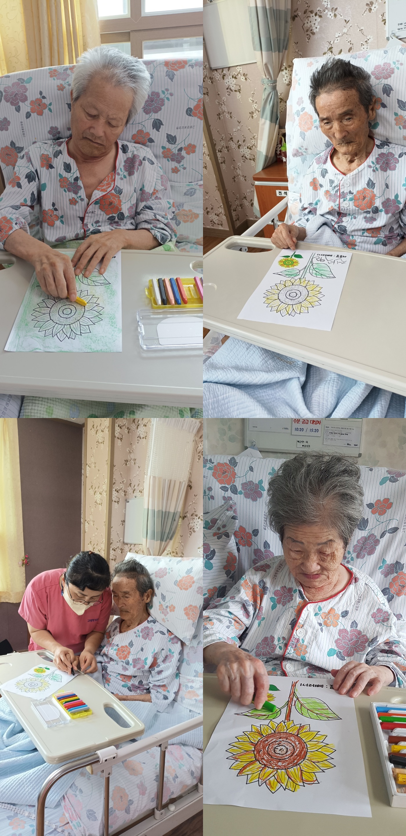 여름꽃 화사한 해바라기를 색칠하시면서 소근육 활동과 화사한 색감에 마음도 힐링하는 시간입니다. 코로나 확산으로 프로그램실 진행이 당분간 어려워 생활실에서 프로그램을 진행드리고 있습니다. 어르신들 솜씨 구경하세요 |
