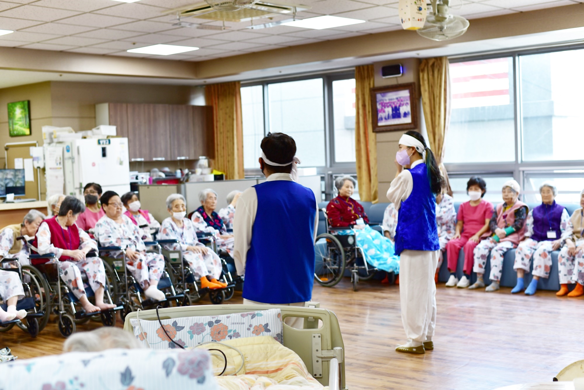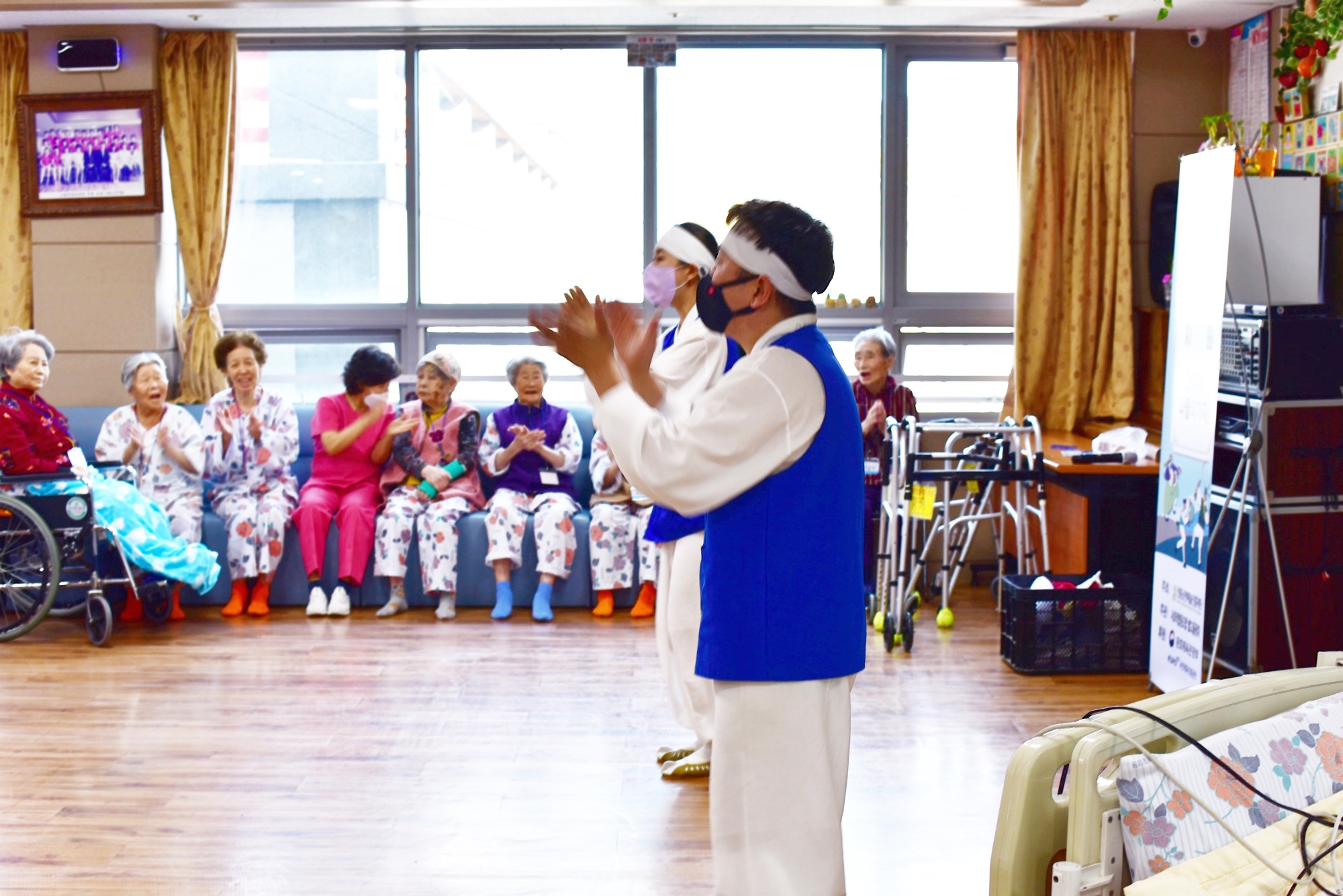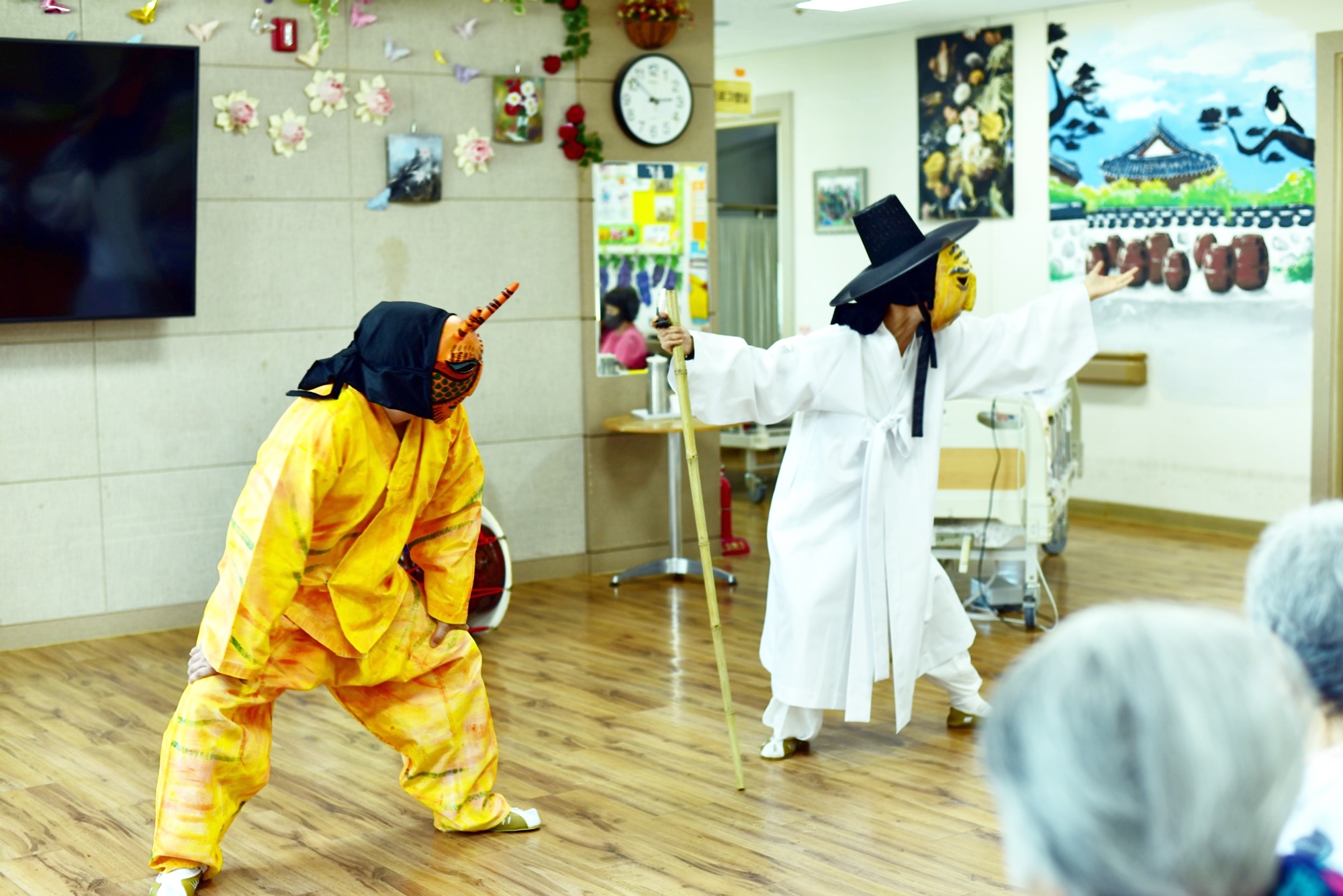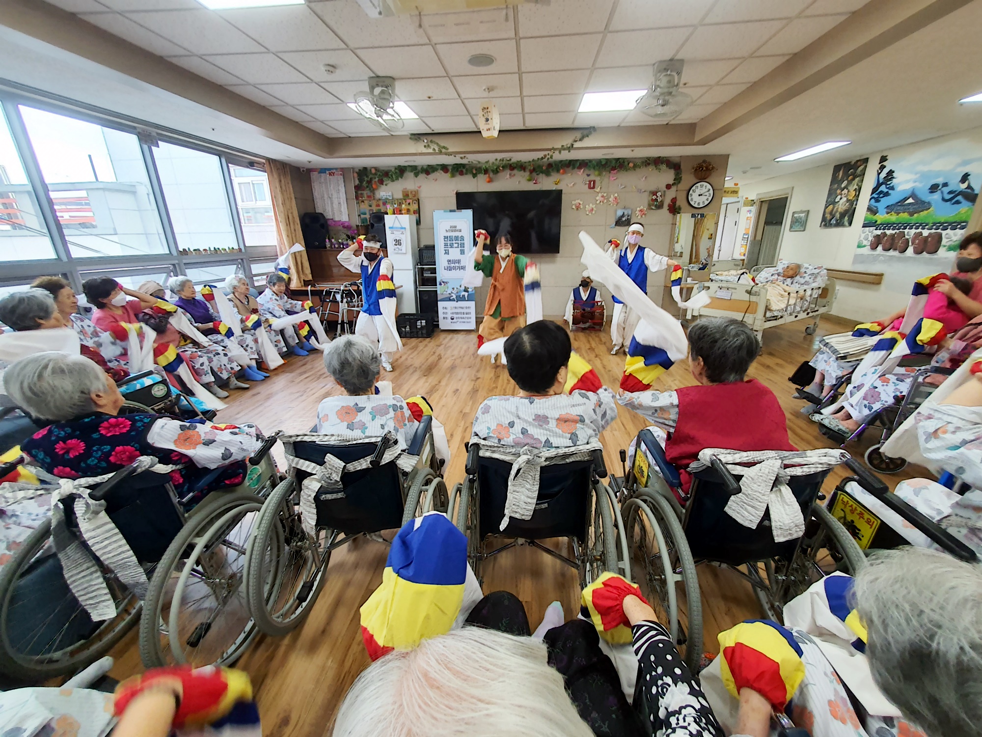 노인전통예술프로그램 사업 지원으로 성주군에서 사회적협동조합 별고을광대께서 오셔서 흥겨운 시간을 함께 해주셨습니다 두번째 시간으로 탈춤 공연을 보여주시고 어르신들도 팔에 한삼을 끼워 함께 소근육 활동을 하는 시간도 마련해 주셨습니다 신명나는 하루 보내시며 오늘도 즐거운 하루 ~~~ 보내셨습니다. |