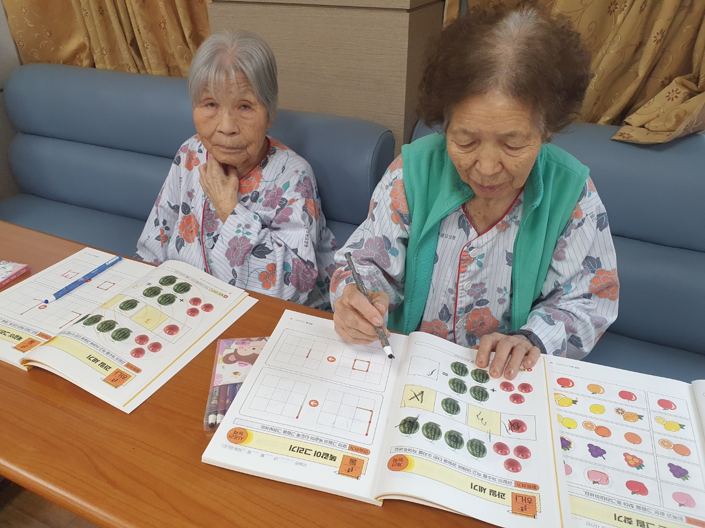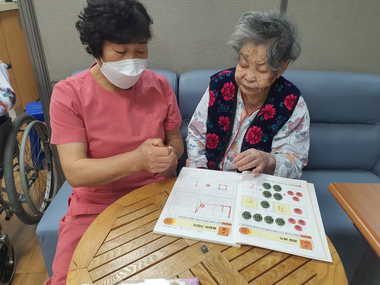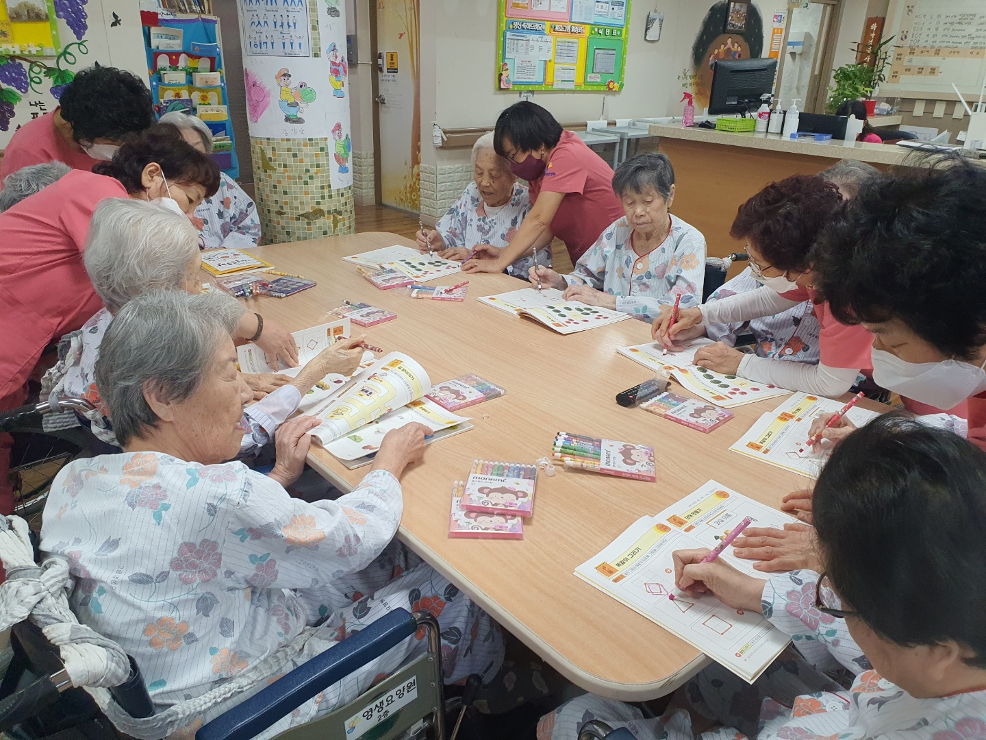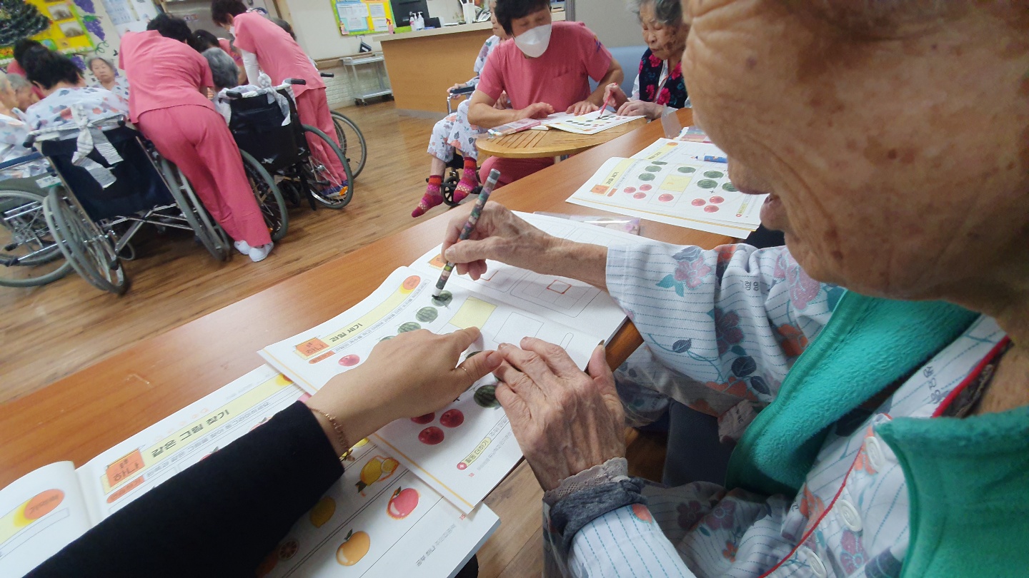 싱싱생생두뇌학교 책을 이용해 어르신들과 인지활동을 진행드렸습니다. 개인 책에 어르신 이름을 적어드리고 진행을 드렸습니다. |