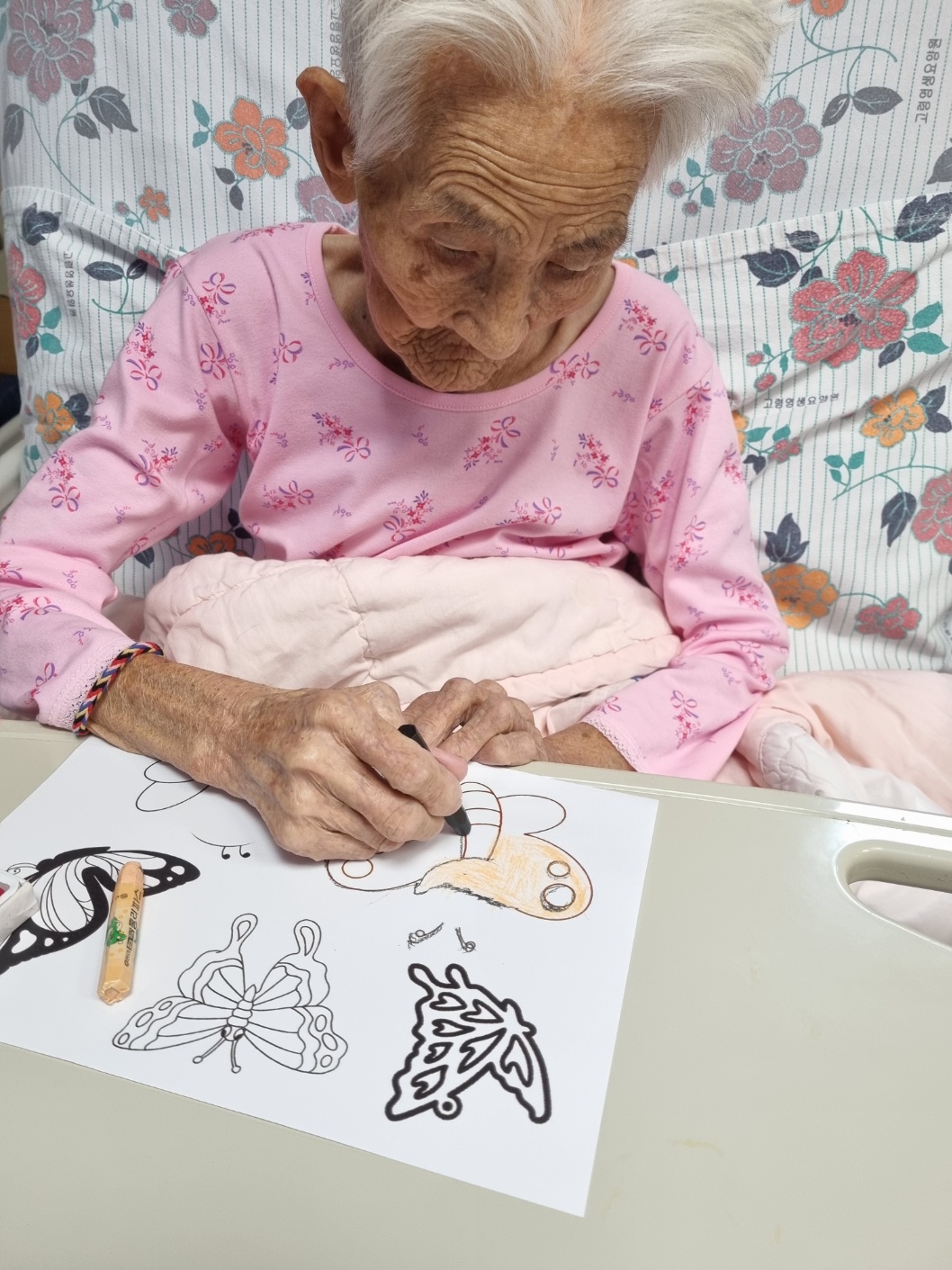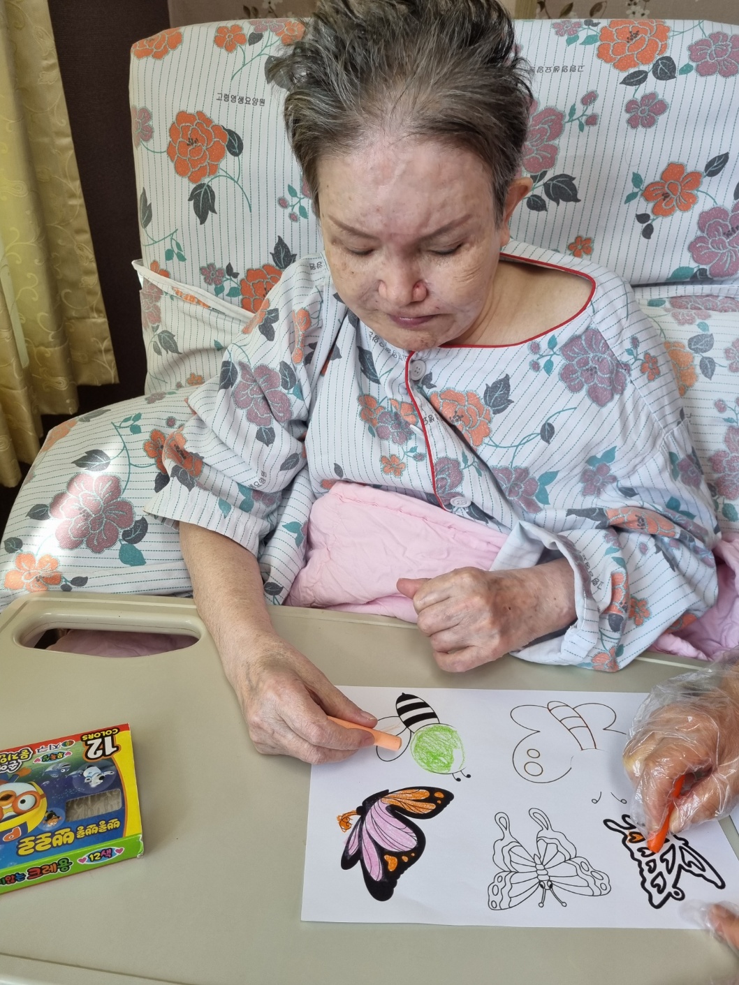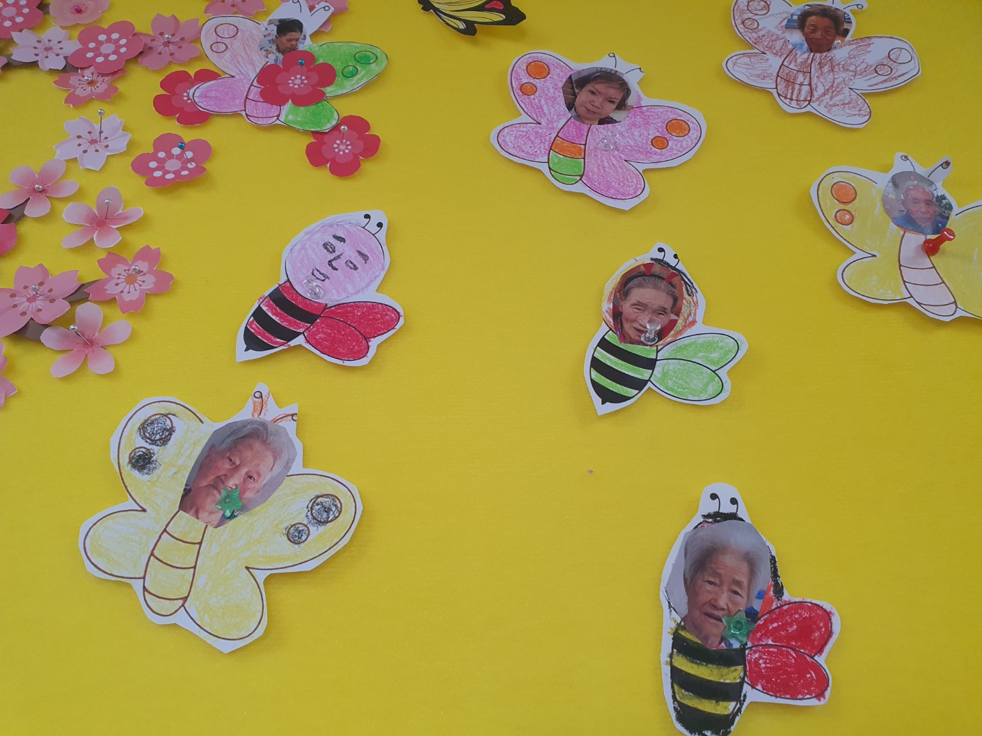 1월에 만나는 봄 고령영생요양원에는 벚꽃이 만개 했습니다. 어르신들이 직접 색칠한 나비와 벌로 꾸민 봄환경판 코로나로 외부 자유롭지 못한 어르신들의 마음을 벌과 나비로 변신해 가고 싶은 곳으로 훨훨 날아다니는 상상을 해 봅니다 화사한 벚꽃나무의 꿀도 따 드시며 자유를 누리시는 모습 벌과 나비 그림에 어르신들 얼굴을 넣어 만족감을 느껴봅니다 |