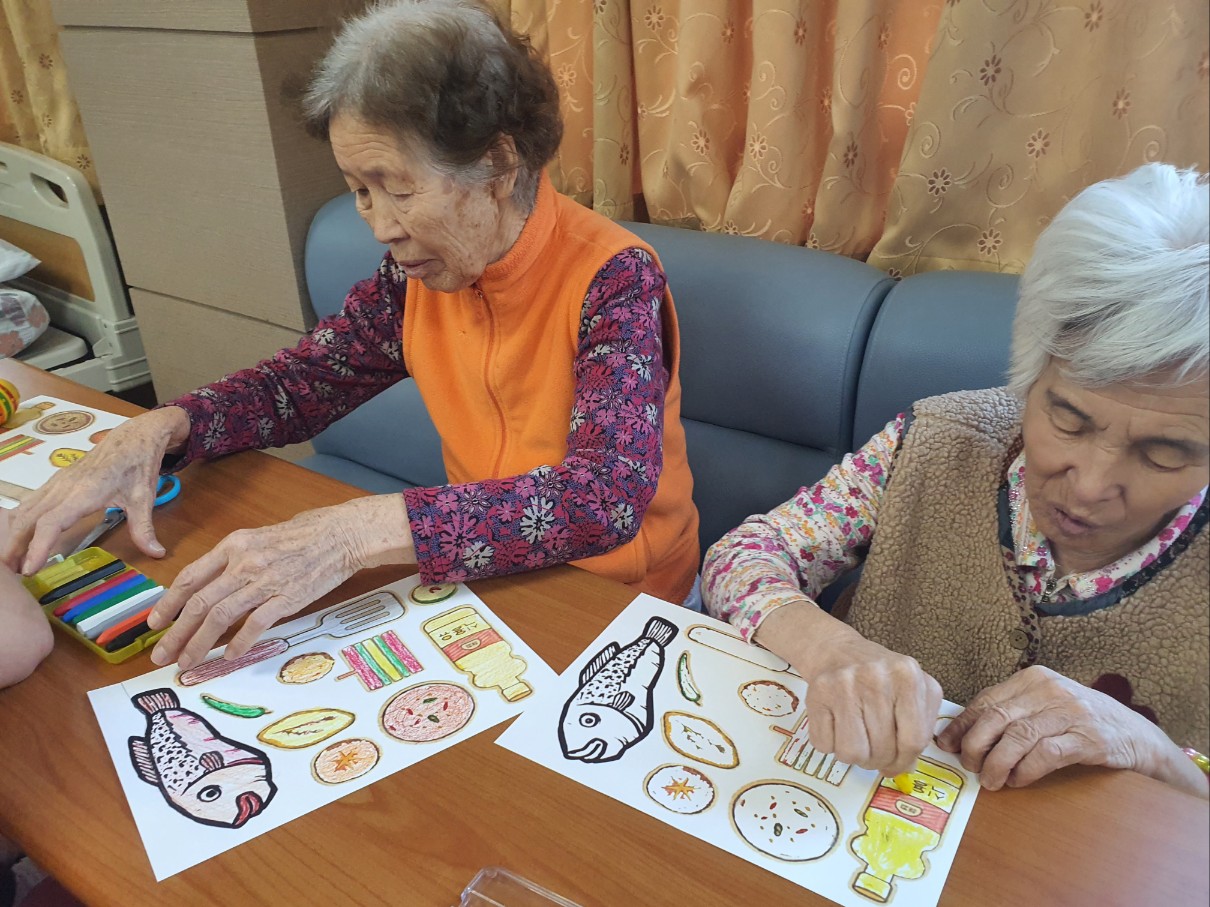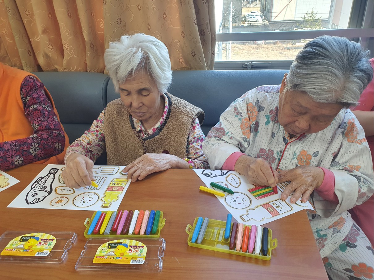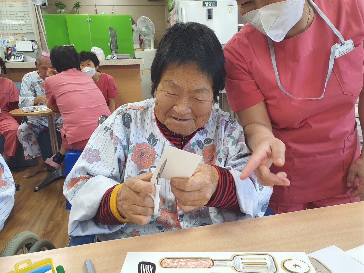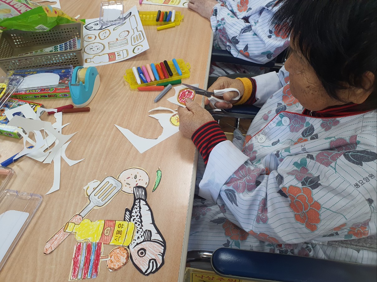 어르신 원하시는 색상을 선택해서 도안에 이쁘게 꼼꼼하게 색칠하시는 시간입니다. 인지 향상에 색칠하기 도움이 되시길 바라는 맘으로 1인 1 크레파스를 제공드려 원하시는 색상을 선택해서 묘사 할수 있도록 제공드립니다. 명절 앞 요리 활동으로 전붙이기전 모형에 색칠을 하고 색칠한 모형을 잘라서 전을 붙여 보는 소근육활동도 함께 진행했습니다. 동그랑땡도 굽고, 산적도 굽고, 버섯, 조기까지 식용유도 그리고 뒤집기도 그려 잘라서 직접 구워보는 모습도 재연해 본 시간을 가졌습니다. |