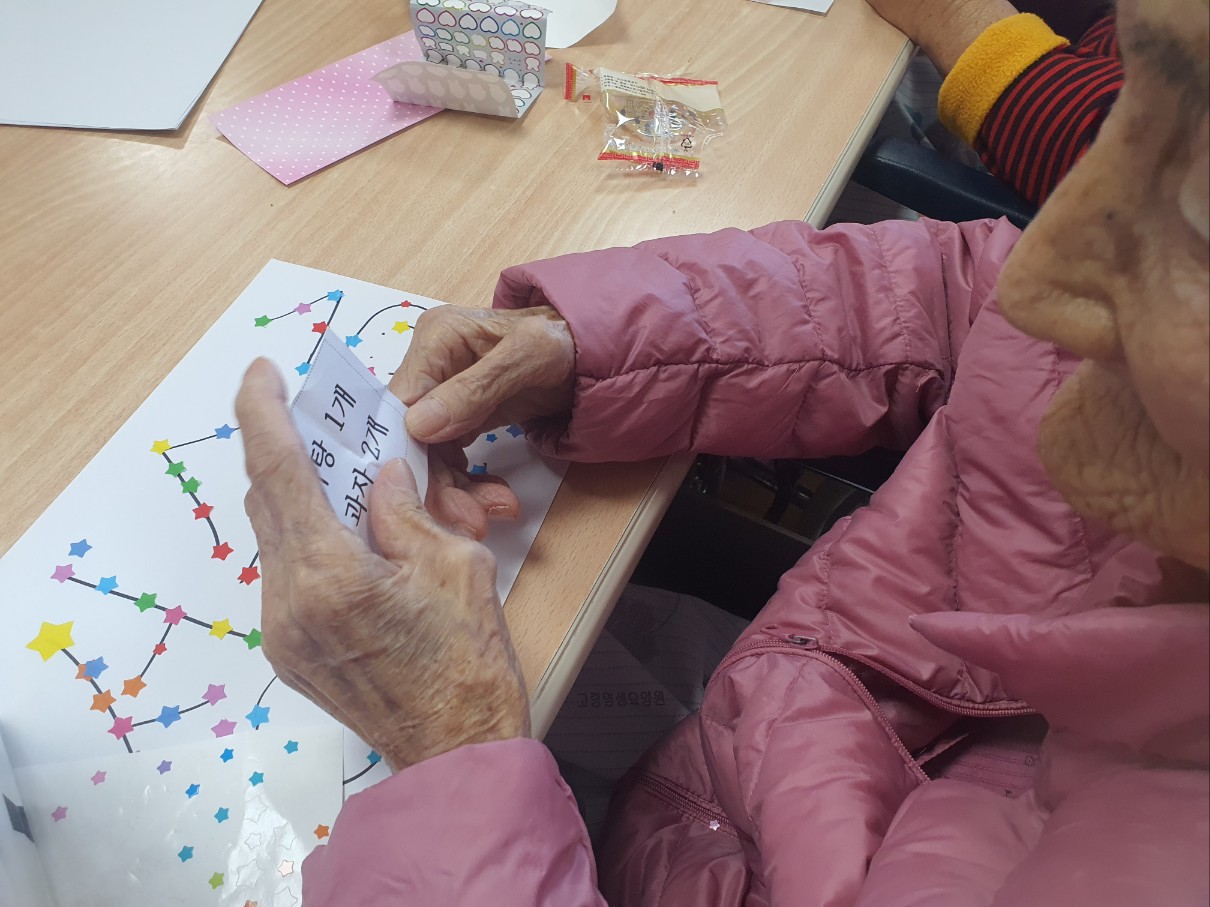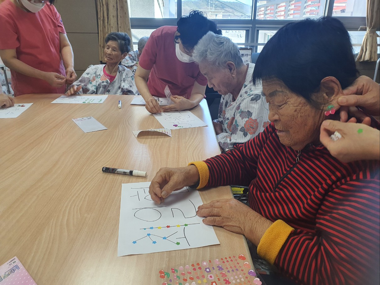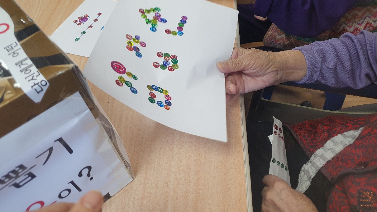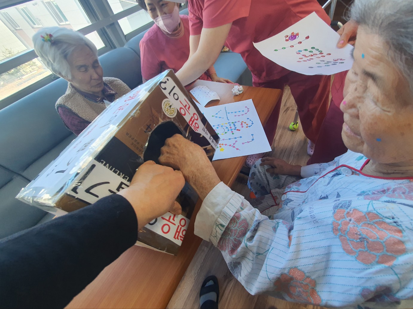 동요 "당신은 누구십니까 나는 000이 그 이름 아름답구나 멋지구나" 등으로 어르신의 이름을 부르는 시간 늘 누구댁, 누구 엄마로 불리면서 어르신의 이름을 잊어 버리면 사신 세월~ 부모님께서 아름다운 '미' 구슬 '령' 아름다운 구슬처럼 되어라 하고 지어 주신 이름을 생각하며 부모님이 주신 사랑도 느껴보는 시간을 가지며 이름을 부르고 적어으며 스티커를 붙여 소근육활동을 하는 시간을 가졌는데요 어르신들 이름을 불러드리고 이름의 뜻고 이야기 하며 즐거운 시간을 가졌습니다. 미술 프로그램 후 행운의 뽑기 프로그램을 진행드려 뽑기 하시며 노래도 하시고 과자랑 사탕도 챙기심 |