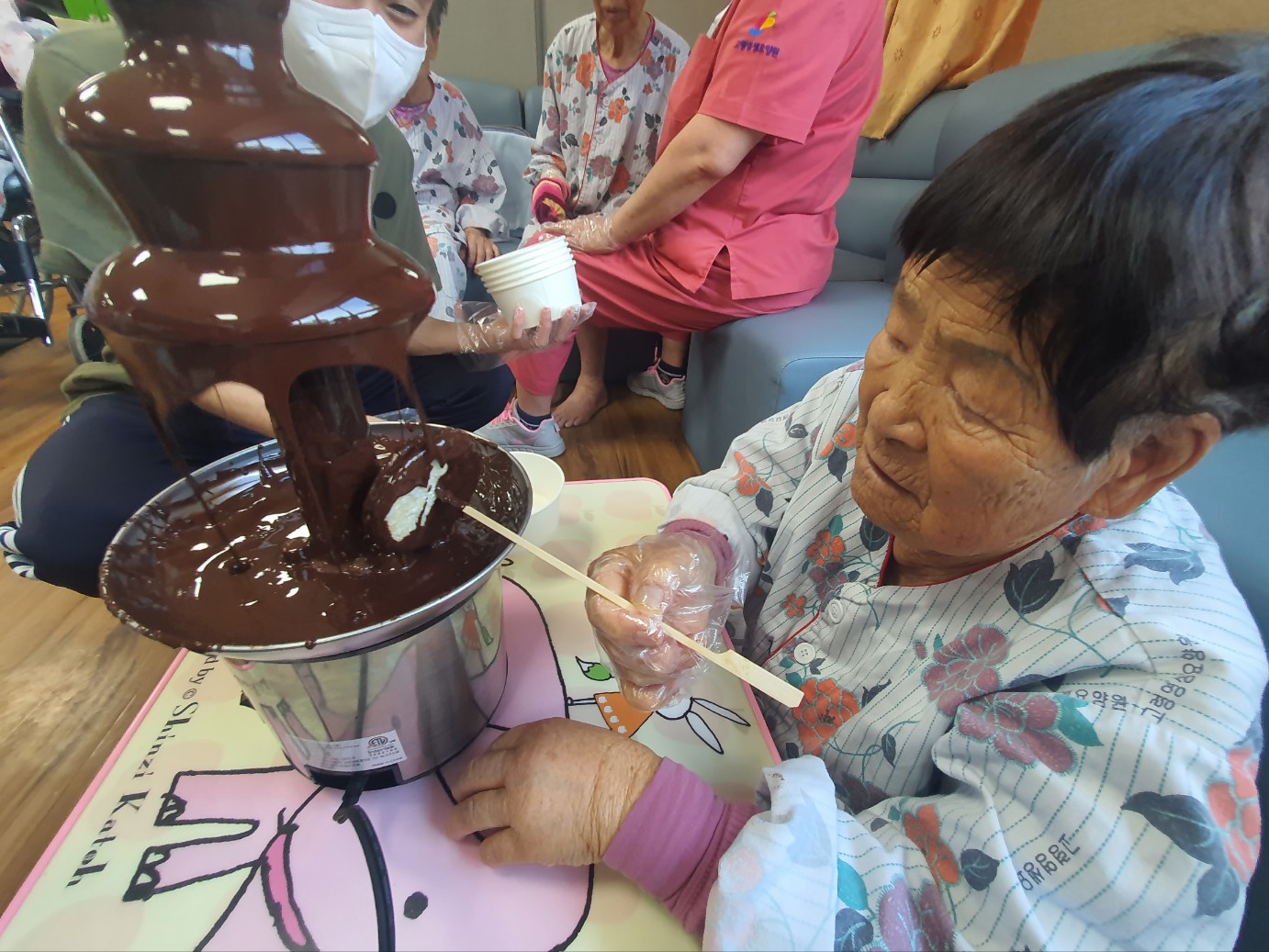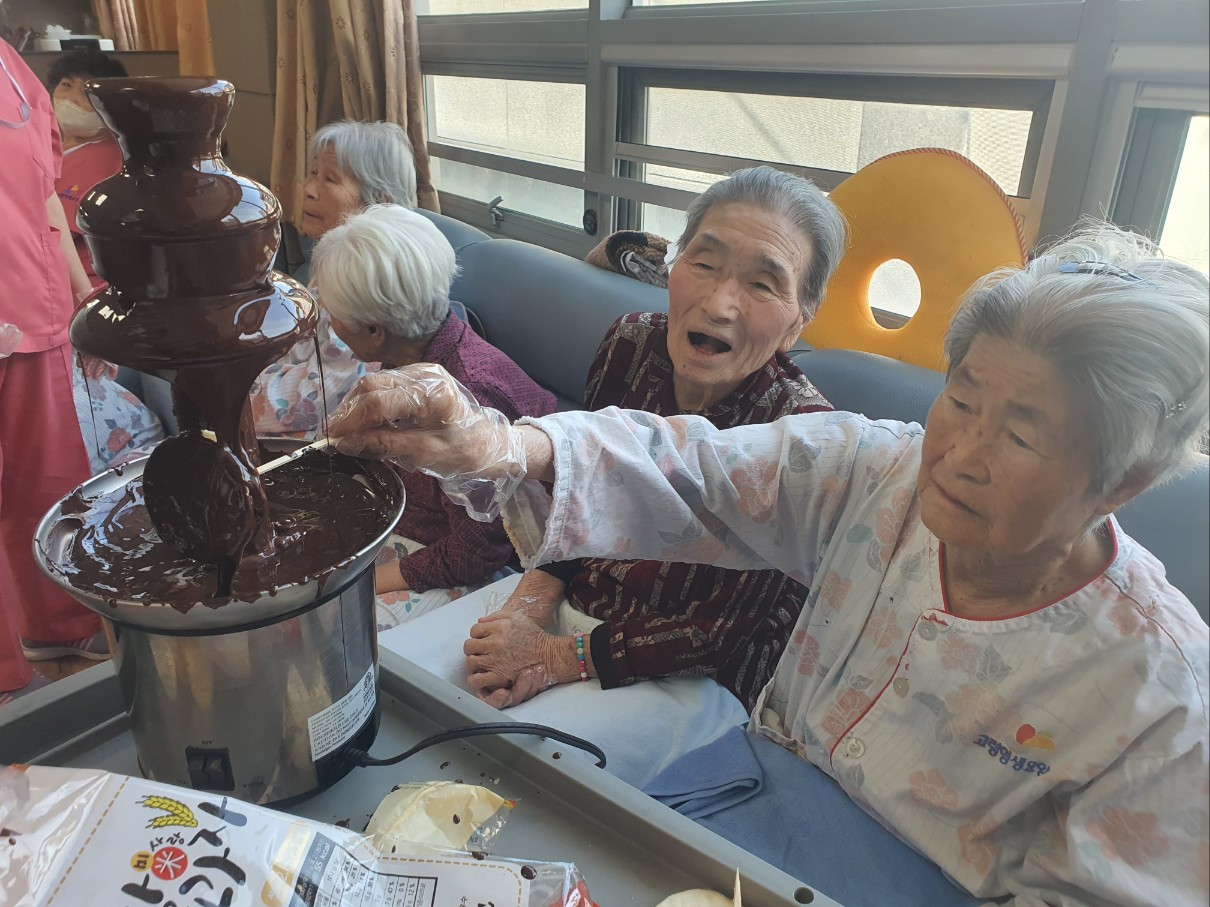 달달한 생초콜렛 드시는 날~ 어르신 초콜렛 폭포수 분수 보시고 신기하다고 하시며 쌀과자를 이용해 초코파이를 만드는 즐거운 시간을 보내심 |