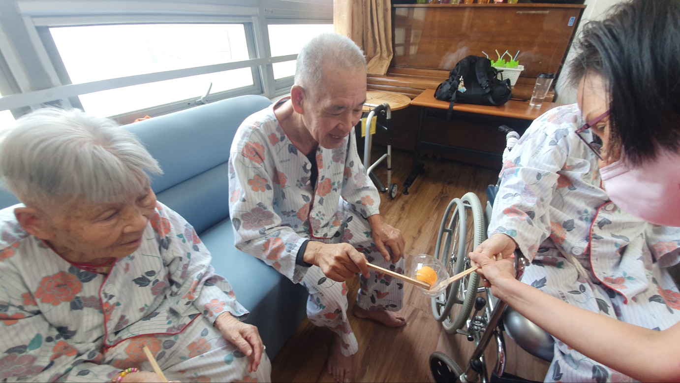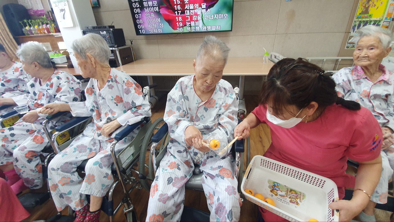 경쟁심을 가지고 탁구공 옮기기를 하셨는데 서로 편을 갈라 재미있게 경쟁력 있게 수행하셨음 잘 안되는 어르신은 선생님들께서 옆에서 도움드리며 잘 수행하셨습니다 이긴 팀은 과자와사탕으로 만족감 드렸습니다 ( 진팀도 당연히 드렸습니다 )