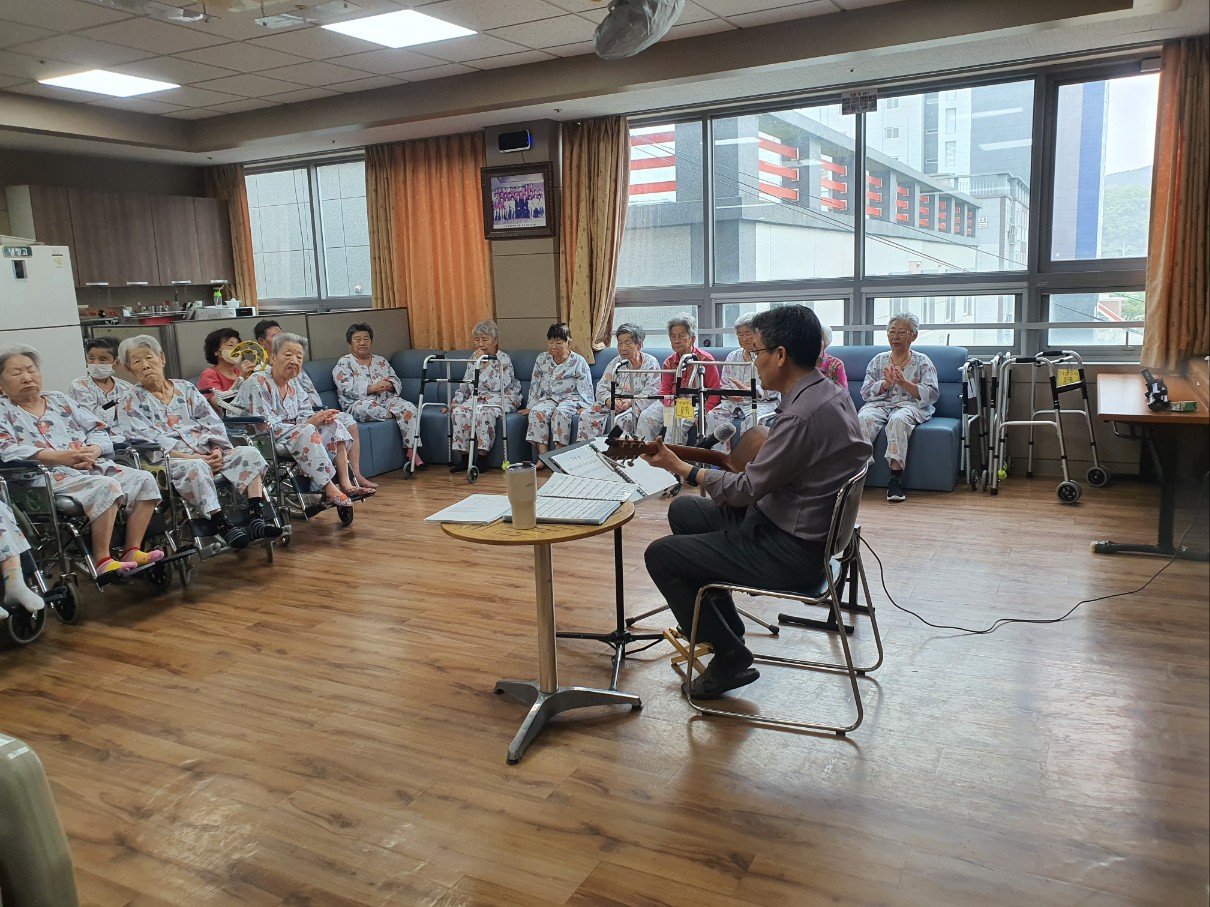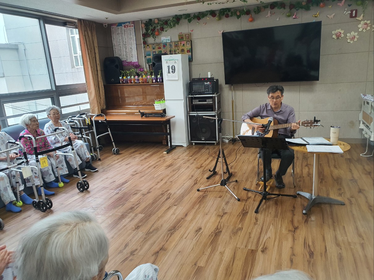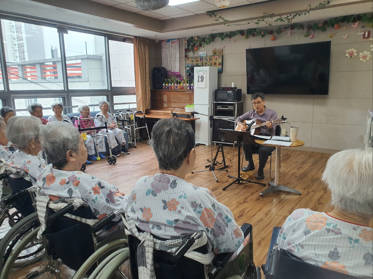 어르신을 위해 통기타 해주시고 노래도 하시며 재미있는 멘트까지 즐거운 시간을 되셨습니다 어르신들 좋아하시는 노래 위주로 들려주셨습니다