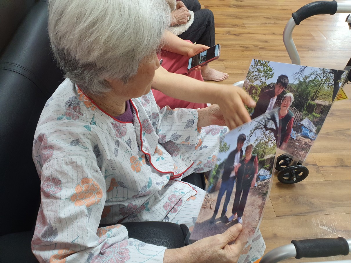 어르신과 보호자의 욕구를 충족시키는 프로그램으로 방문을 원하시는 보호자와 집으로 가고 싶은 어르신이 욕구를 도움드림 어르신 배회와 집으로 가고 싶은 욕구를 충족드리기 위해 같은 방향에 계신 어르신 집을 방문하고 아들과 만나 다과도 즐기며 마음의 안정감을 드림 집을 둘러보시고 옛날 기억도 간간이 회상하시는 시간을 가지심 다녀오셔서 손주와 찍은 사진을 인쇄해 드렸더니 즐거워 하심