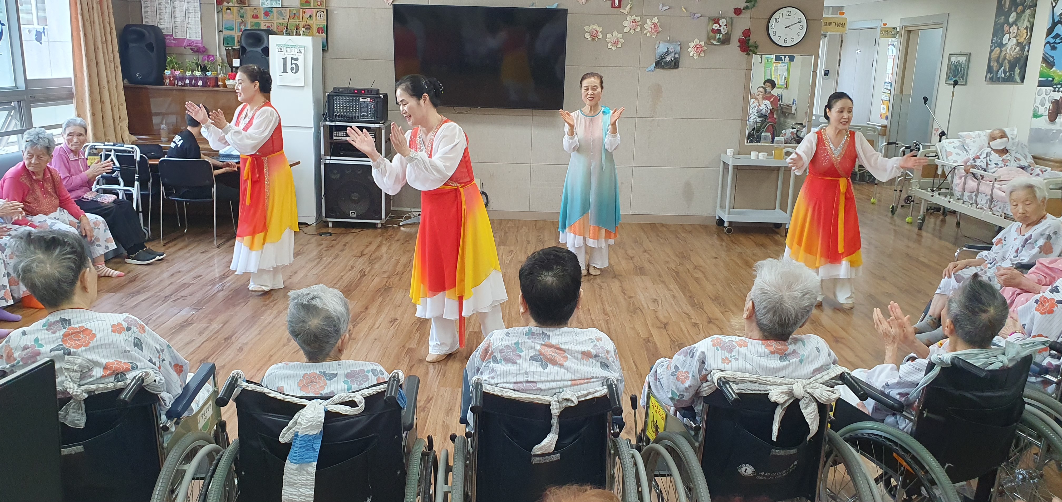 율동과 노래 손유희로 어르신들을 찾아 오시는 헤세드워크샵 찬양단은 매달 셋째주 월요일 어르신을 찾아 뵙고 즐거움과 활력을 주십니다. 매달 요양원을 방문하셔서 새로운 율동을 준비 해주시는데요 오늘도 어김없이 공연을 구상해 오셔서 즐거움을 주고 레크레이션을 따라하도록 해 주셔서 어르신 인지력도 쑥쑥 올려 주시고 계십니다 늘 어르신의 마음 안정과 몸과 마음을 건강하게 챙겨주시는 헤세드찬양단 체조와 아름다운 율동으로 공연과 인지쑥쑥 프로그램을 진행 해주십니다.