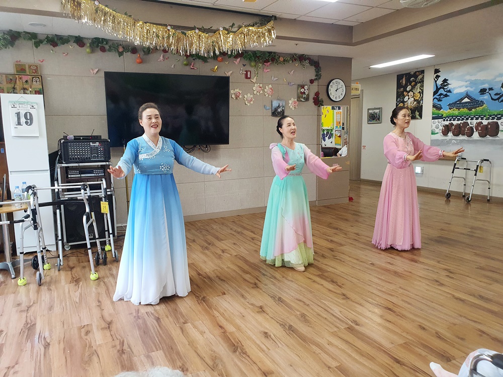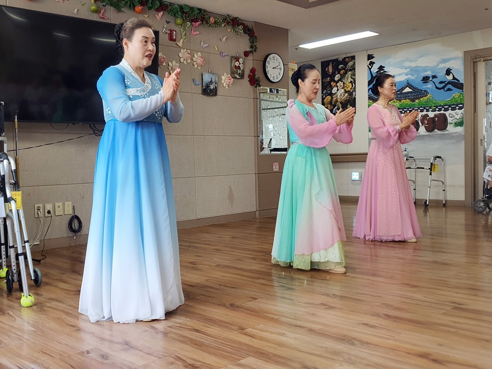 율동과 노래 손유희로 어르신들을 찾아 오시는 헤세드워크샵 찬양단은 매달 셋째주 월요일 어르신을 찾아 뵙고 즐거움과 활력을 주십니다. 매달 요양원을 방문하셔서 새로운 율동을 준비 해주시는데요 오늘도 어김없이 공연을 구상해 오셔서 즐거움을 주고 레크레이션을 따라하도록 해 주셔서 어르신 인지력도 쑥쑥 올려 주시고 계십니다 늘 어르신의 마음 안정과 몸과 마음을 건강하게 챙겨주시는 헤세드찬양단 체조와 아름다운 율동으로 공연과 인지쑥쑥 프로그램을 진행 해주십니다.