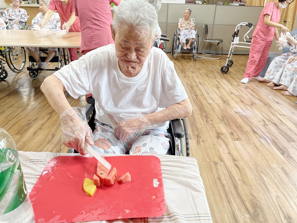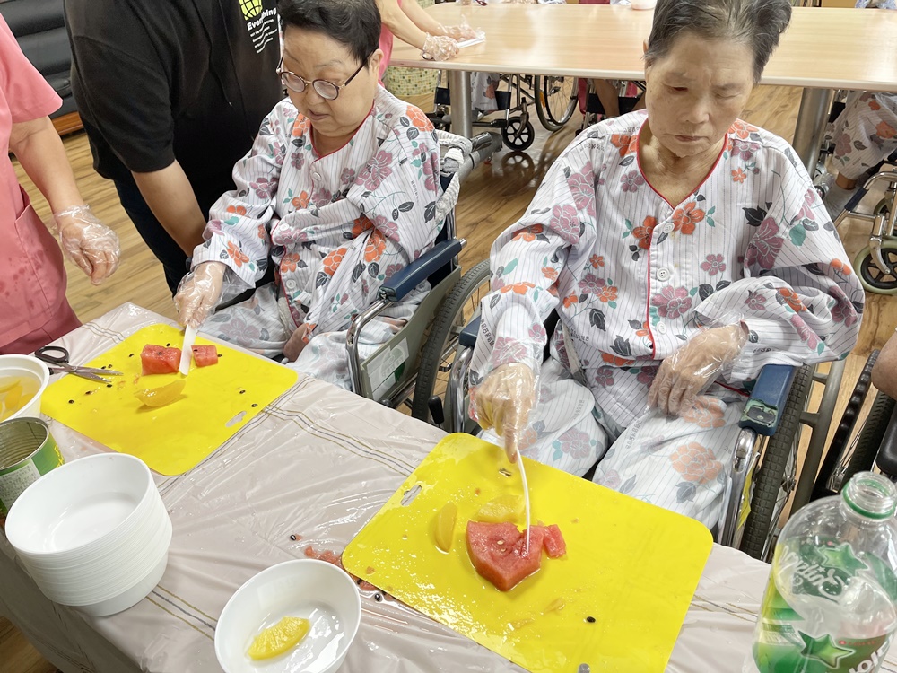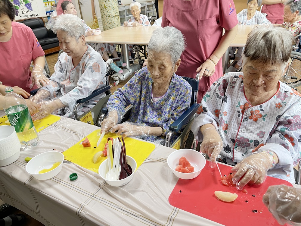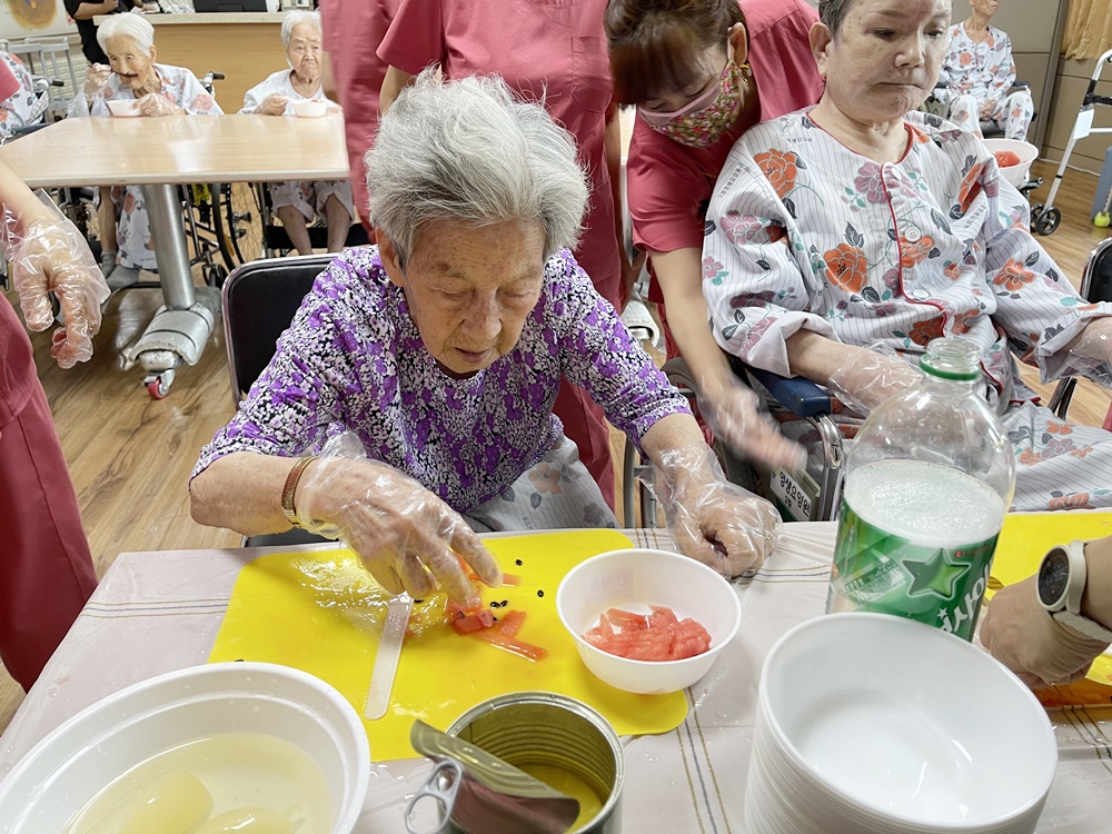 오늘은 고령영생요양원 어르신 요리시간입니다. 어르신 3분씩 모셔서 진행을 드렸으며 뒤에서 차례를 잘 기다려 주셨습니다 어르신과 활동 인사를 나누고 수박, 복숭아를 이용해 요리 시간을 가집니다. 수박을 썰이고 다듬과 멜론을 다듬으며 어르신들이 신이 나셨어요 맛있는 화채를 완성하고 즐거워 하시는 표정들 직접 만들어서 드시는 간식~~ 오늘 요리는 수박화채입니다 더운 날씨에 수분섭취는 꼭 필요하죠 수박 + 복숭아 통조림 + 후르츠 + 사이다를 이용해 달달한 화채를 만들어 에너지 보충하셨어요 차례 차례~ 천천히 ~ 다음 어르신 앉으세요 ㅋㅋ 요리를 하기 위해 재료를 드렸더니 입속에 쏙~~~ 소근육 활동 인지향상 그리고 입도 즐거운 요리시간 요리 시간 후 시간이 남아서 인절미 시집가는 동화책( 인절미를 요리하는 동화책)도 읽어드리며 간식을 맛있게 드셨습니다. " 아비야 어미야 우리는 잘 있다"~~~ 돈보다 옷보다 먹는게 최고다 ㅎㅎㅎㅎ 하십니다. 만든 화채는 어르신들 간식 잘 못씹으시는 어르신은 갈아드렸습니다. 여름에는 역시 화채야 하시며 화채를 시원하게 드셨습니다.