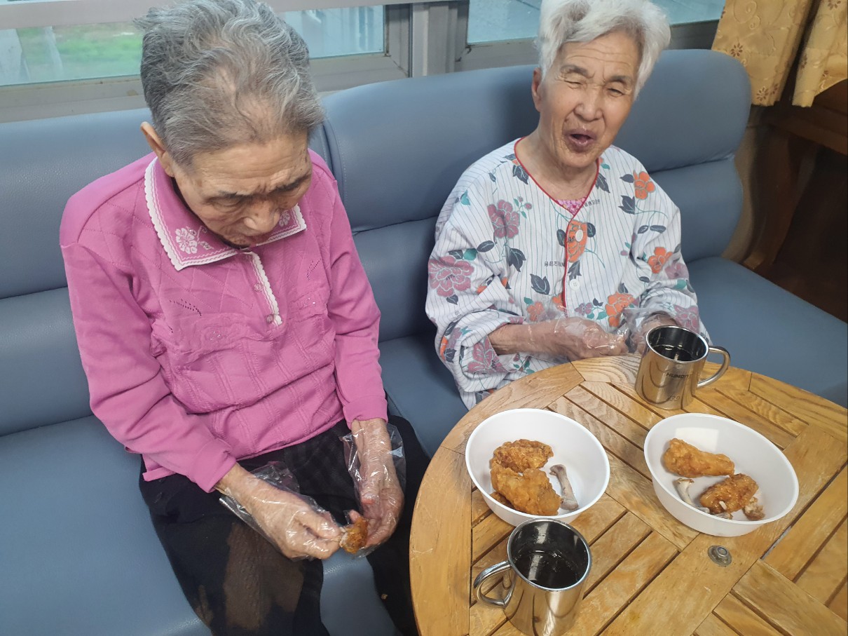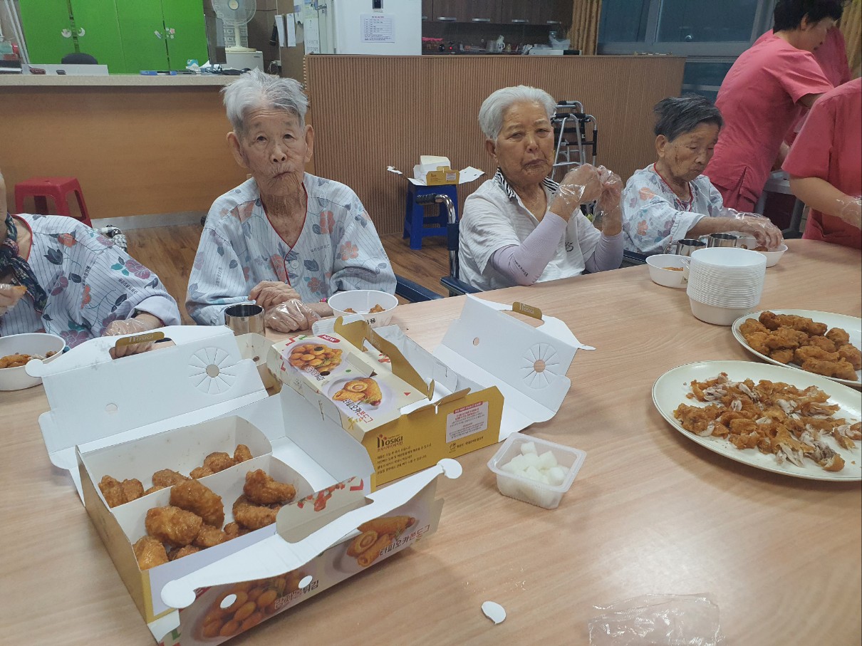 추억의 음식데이는 요양원에서 추억의 음식을 나누는 시간으로 윙봉 통닭을 시켜 나눠드시면서 추억을 뒤돌아보는 시간을 가졌습니다 초복날 어르신들에게 특별한 음식 치아가 없으셔도 잘 드시는 통닭으로 추억 시간을 가졌으며 복날에 대한 이야기를 들려 드리고 복날은 절기도 명절도 아니며 잡절로 건강을 챙기기 위한 날임을 알려드림 어르신들 통닭을 너무 맛나게 드셨음