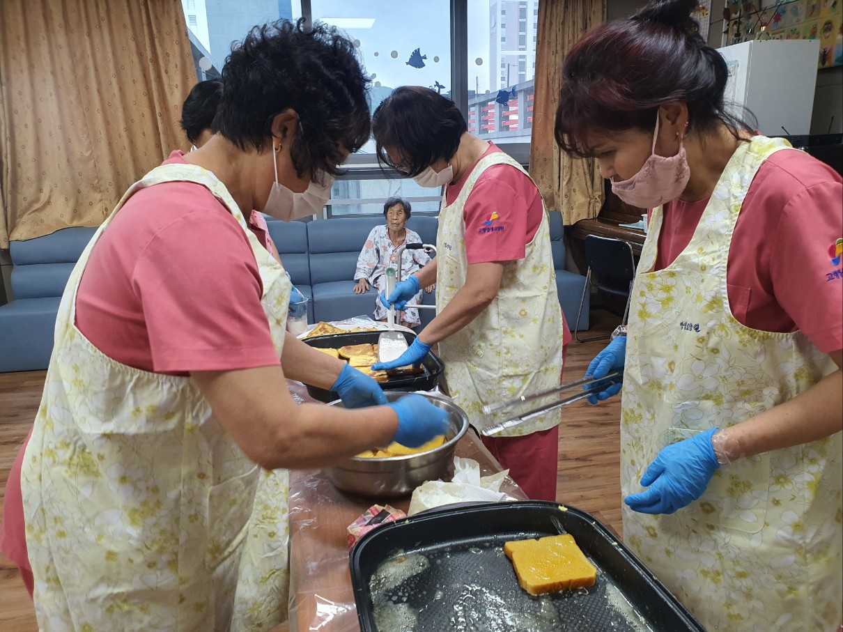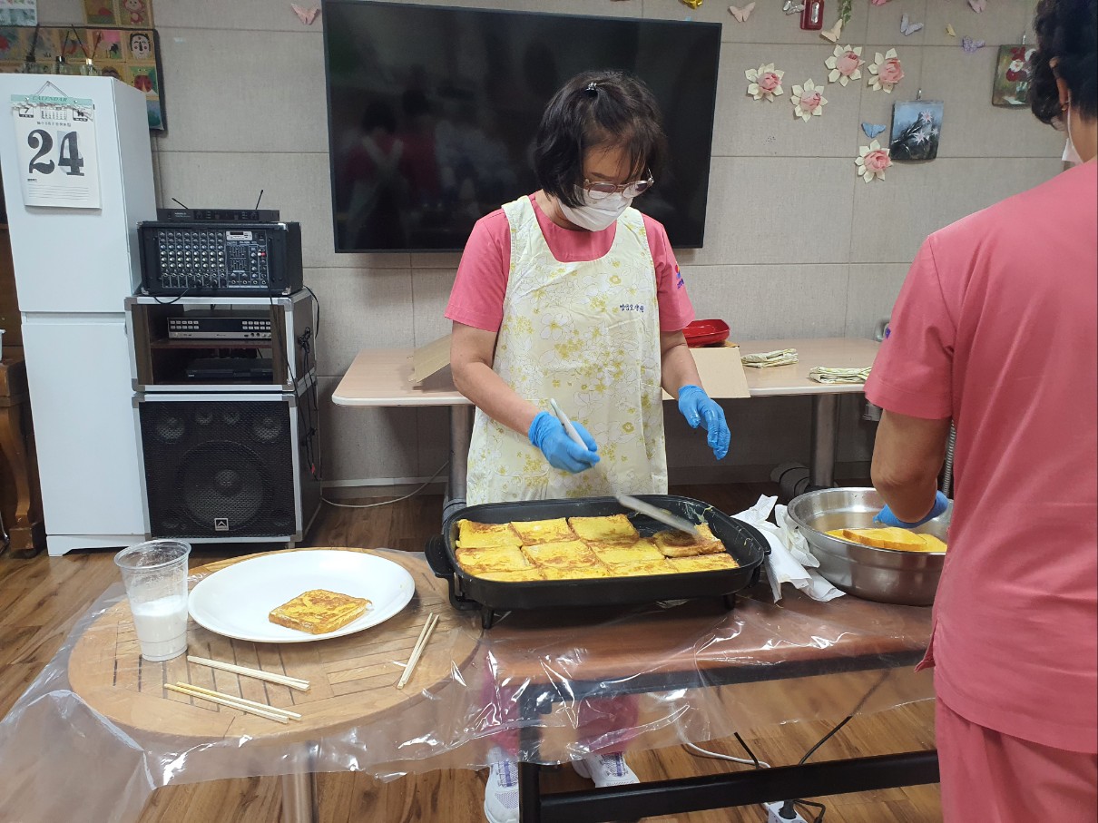 비가 내리는 날 어르신들을 위해 프로그램을 변경드려 요리 시간을 가졌습니다 비오는날은 파전, 김치전이 생각 나는 날입니다 어르신들은 드실 수 있는 음식을 잘 선택해서 진행 드려야하는데 두부전을 하려다 살짝 달달한 계란 토스트가 어르신들이 드시기 좋고 또 계란을 보호자께서 후원해 주셔서 계란을 듬뿍 넣고 달달한 토스트를 만드는 시간을 가졌습니다 섭취가 가능한 어르신들과 비오는날 맛있게 먹었습니다 불을 사용하는 요리라 오늘은 어르신들 요리하시는 장면을 보시며 눈으로 즐기고 입으로 즐기는 시간을 가졌습니다