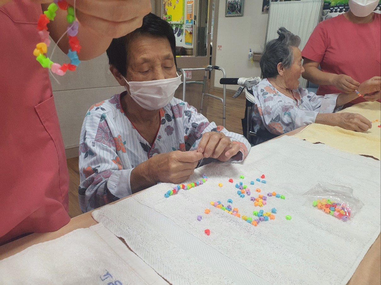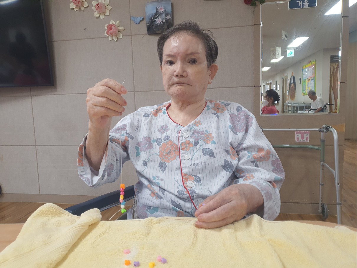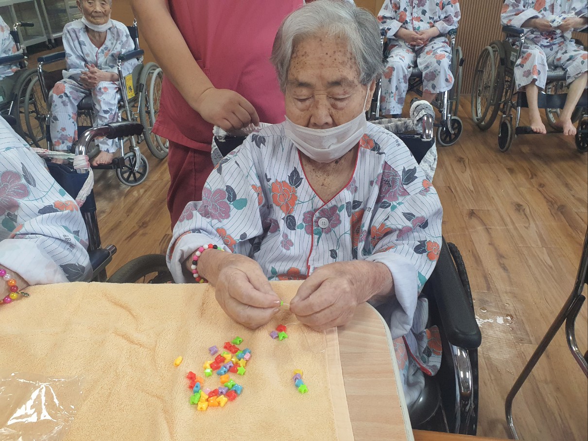 작은 구멍속에 실을 끼워 넣으시면서 집중력 있는 프로그램을 진행하셨으며 만든 팔찌와 마스크걸이에 만족해 하시며 몸에 치장도 하셨습니다 나 이런 여자야~~ 멋진 포즈로 찰칵