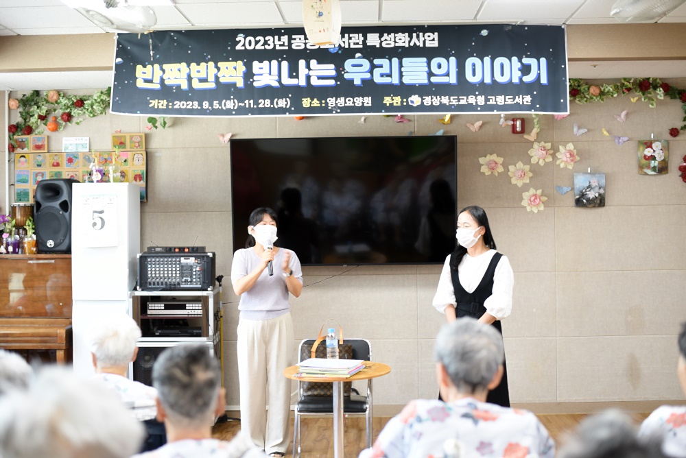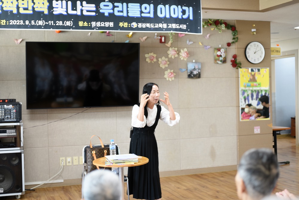 경상북도교육청 고령도서관 특성화사업으로 반짝반짝 빛나는 우리들의 이야기 동화구연 수업을 12주간 진행이 됩니다. 고령도서관에서 어르신들의 인지력 향상과 일상의 지루함을 즐거운 시간으로 도움을 주셨습니다. 문지원 동화구연 강사님의 재미난 동화와 손유희도 즐거운 시간 되셨습니다.