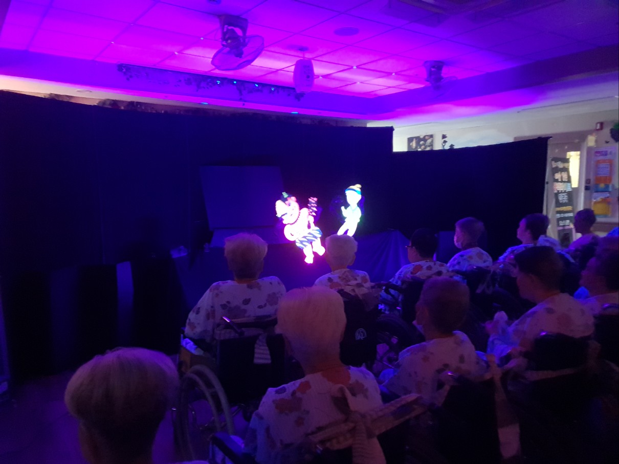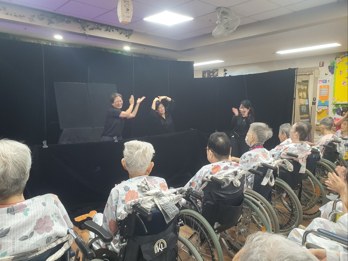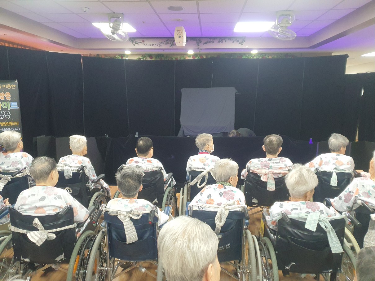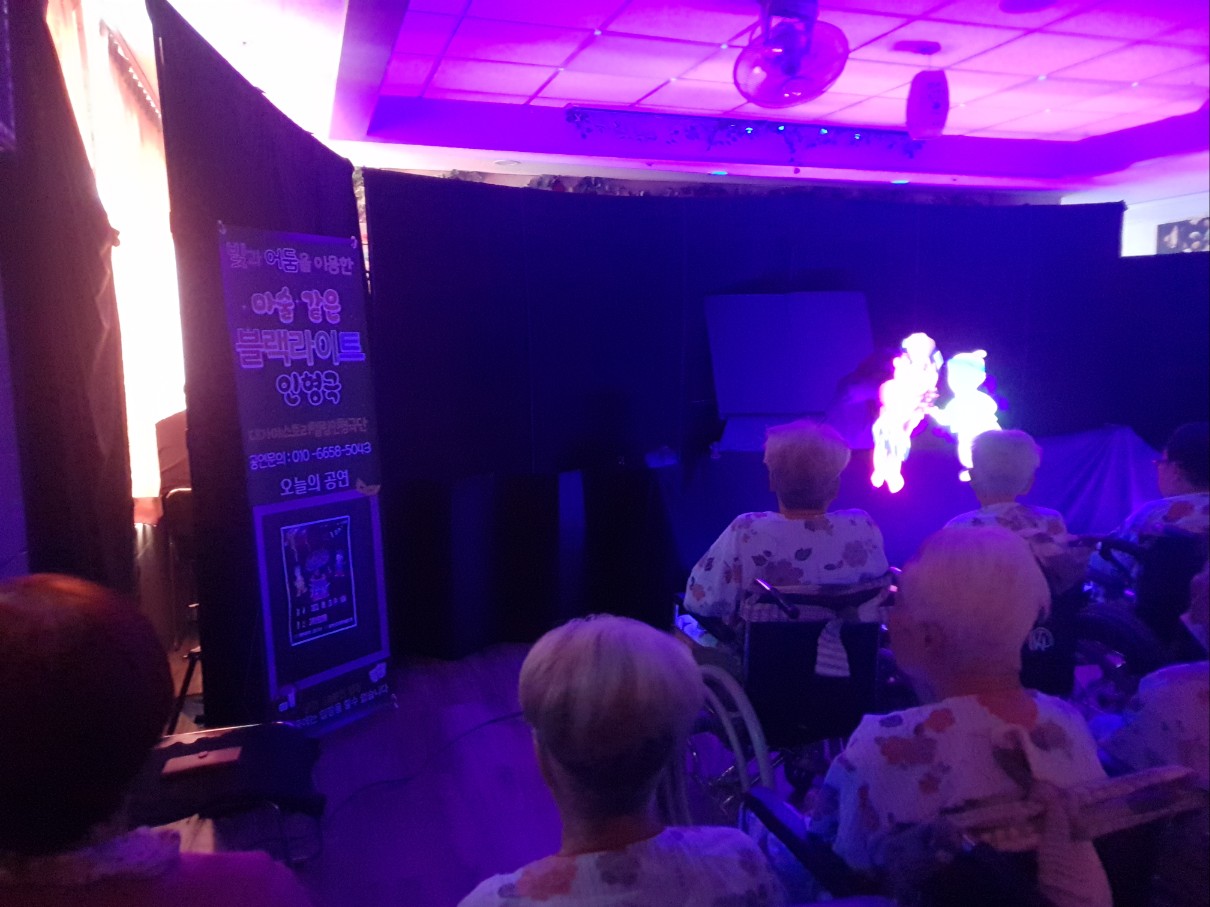 고령도서관 지원 블랙라이트 똥벼락 인형극 시간입니다. 고령군 상주 공연단으로 문화의 도시 고령군과 전국적으로 공연을 펼치고 있는 극단으로 고령도서관 지원으로 고령영생요양원을 방문해 주셨습니다. 빛과 어둠을 이용한 마술같은 공연으로 블랙라이트패널인형극 공연으로 즐거운 시간을 도움 주셨습니다. 어르신들 좋아하시는 트롯 음악과 똥벼락 내용이 어우러져 좋았습니다.