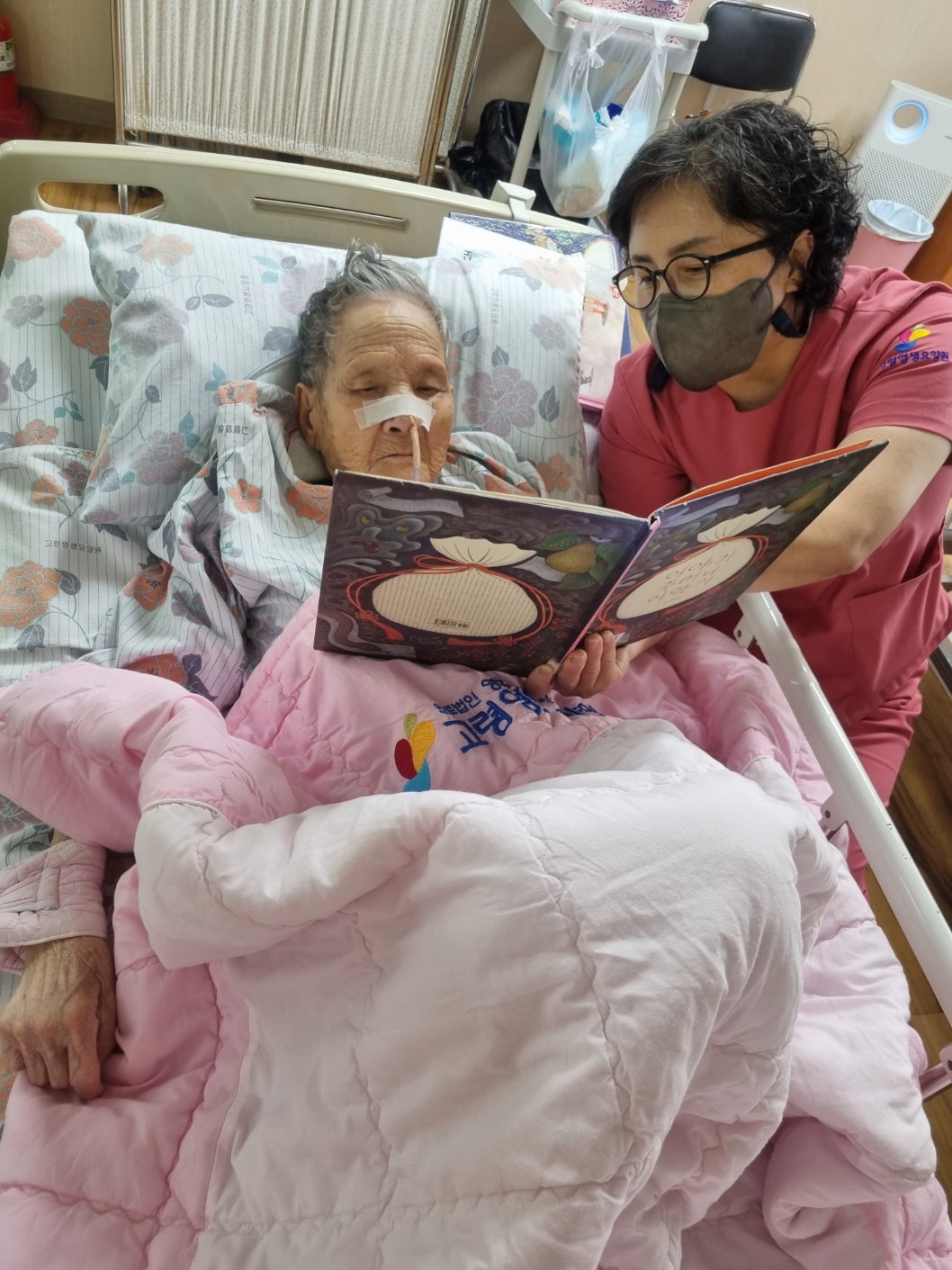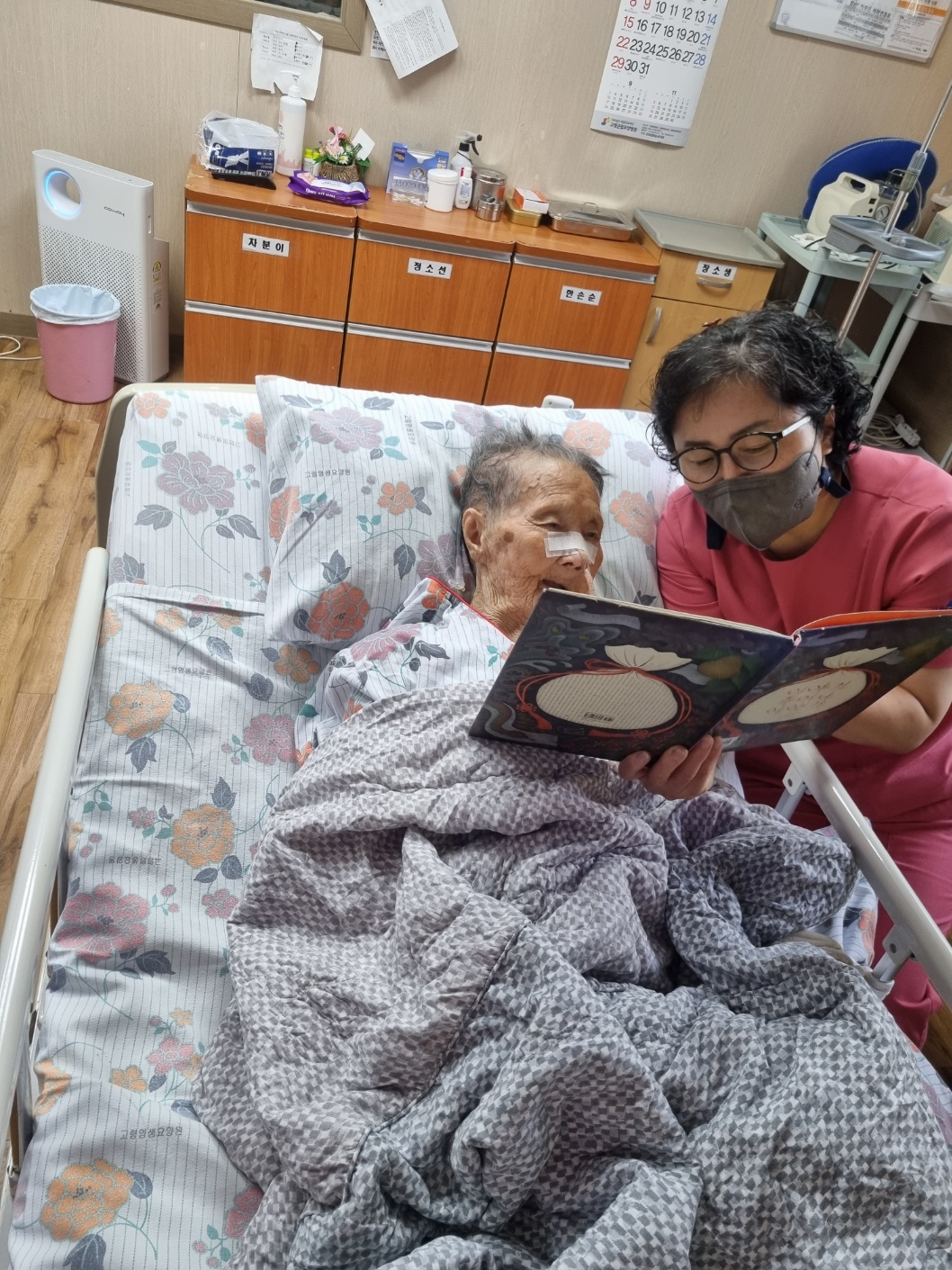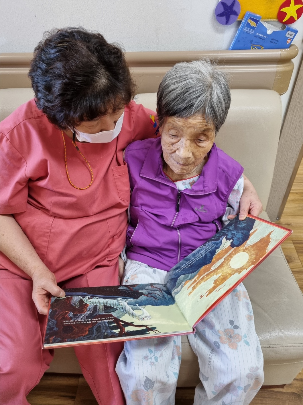 매주 목요일과 금요일은 어르신들과 책을 읽으면서 정서적 공감하는 시간으로 생활실로 찾아가 어르신들의 심리 정서적인 안정을 돕고 1:1 낱말카드 또는 사물카드로 어르신의 인지를 향상시켜 드리며 잔존기능회복에 도움을 드린다.낱말 카드 또는 사물카드, 책등으로 인지력을 향상 시키고 과거 기억을 떠올려보며 기억회상에 도움드림