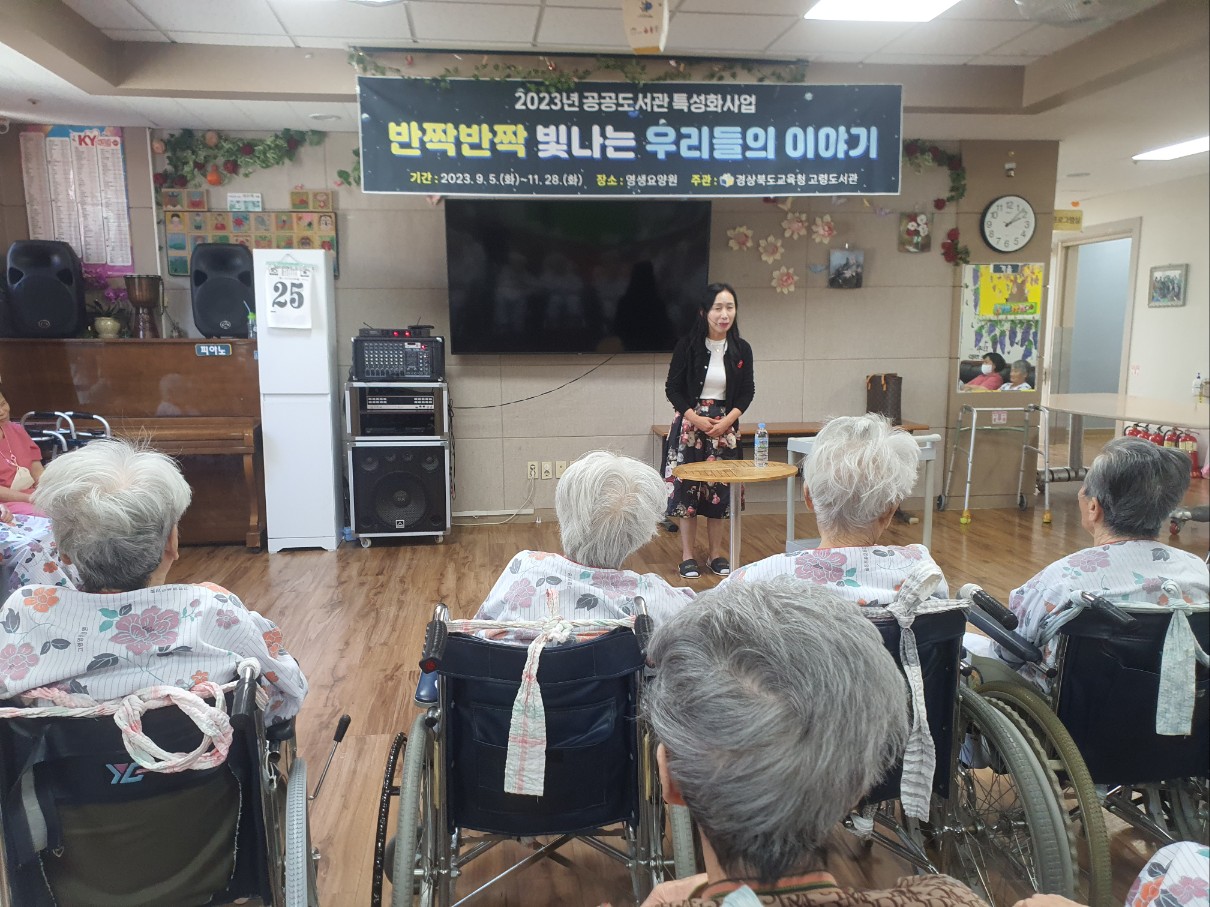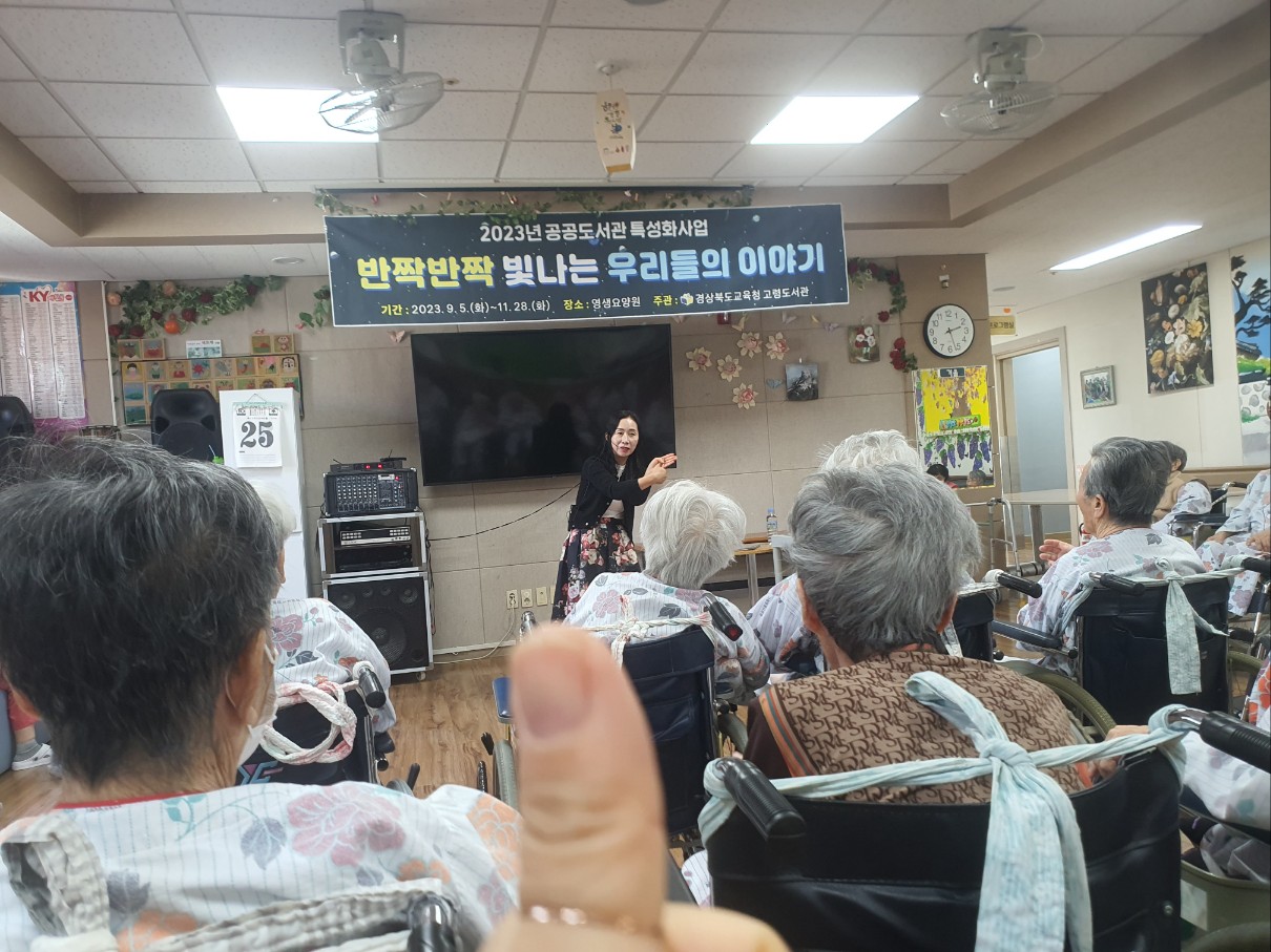 어르신들이 좋아하시는 시간 고령군 도서관에서 지원해주신 동화구연 시간입니다 문지원 강사님의 찰떡 같은 입담으로 어르신들이 즐거워 하시는 시간입니다 날이 갈수록 더 집중력도 좋으시고 행복해 하시는 시간 반짝반짝 빛나나 우리들의 이야기 시간 2023년 공공도서관 특성화사업으로 멋진 시간을 준비해주셨습니다