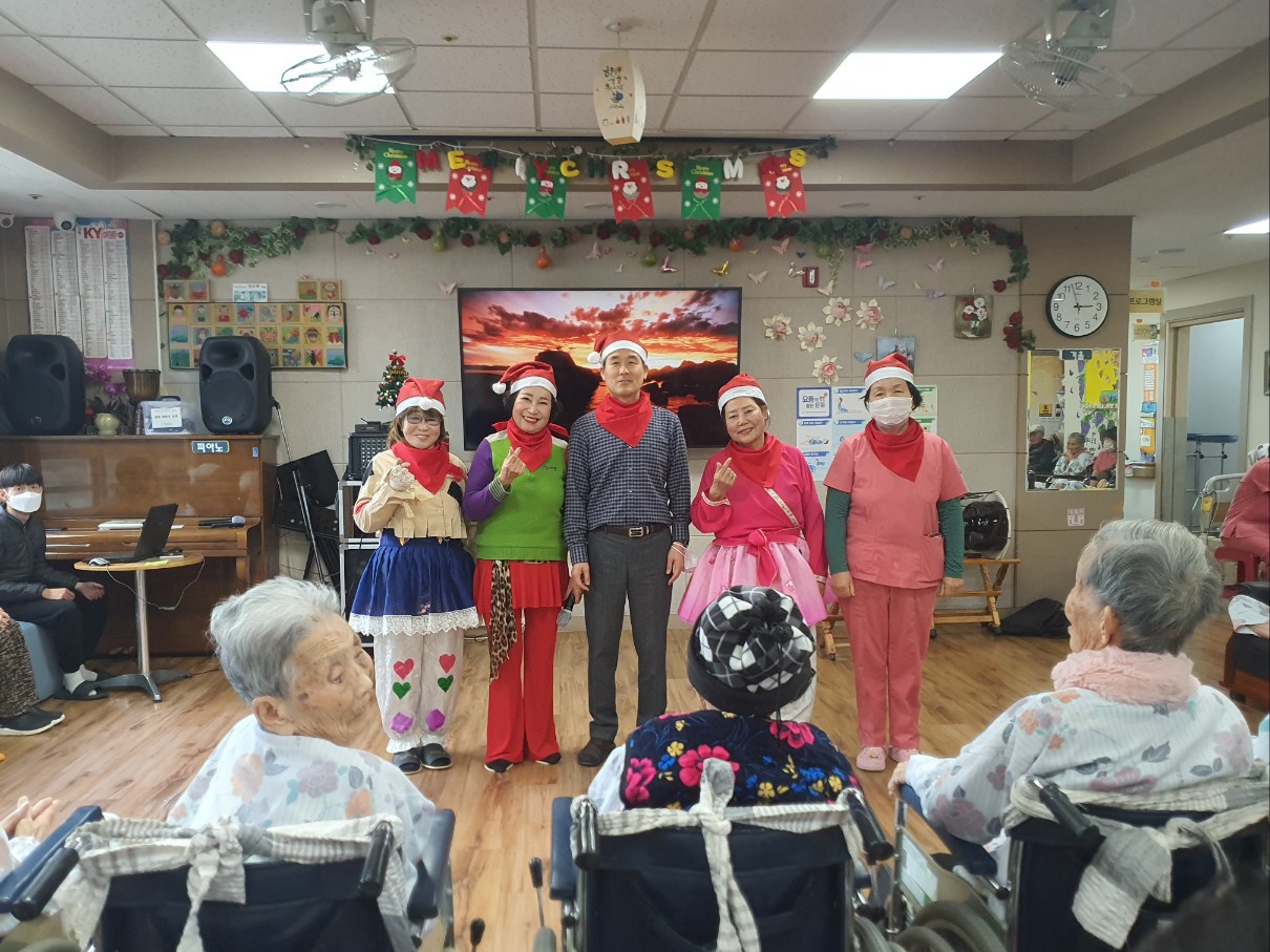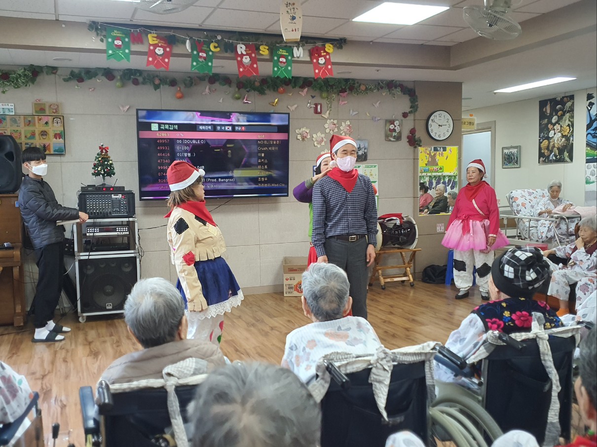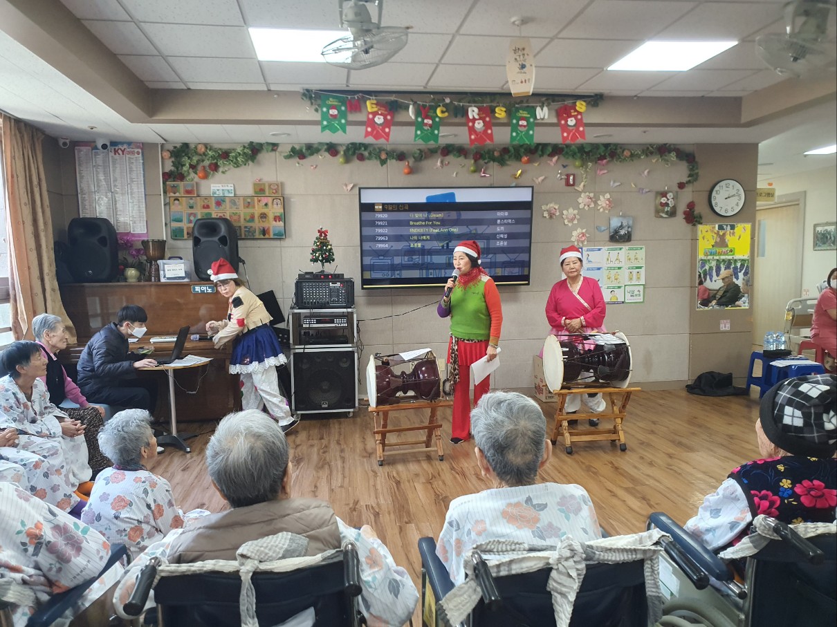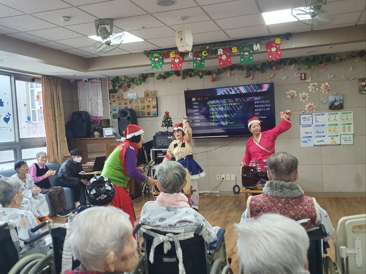 어르신들 좋아하시는 품바공연~ 크리스마스 분위기로 어르신들에게 계절감을 느끼게 해주셨습니다 노래도 작사작곡해 오셔서 ~ 신선한 즐거움을 주셨습니다