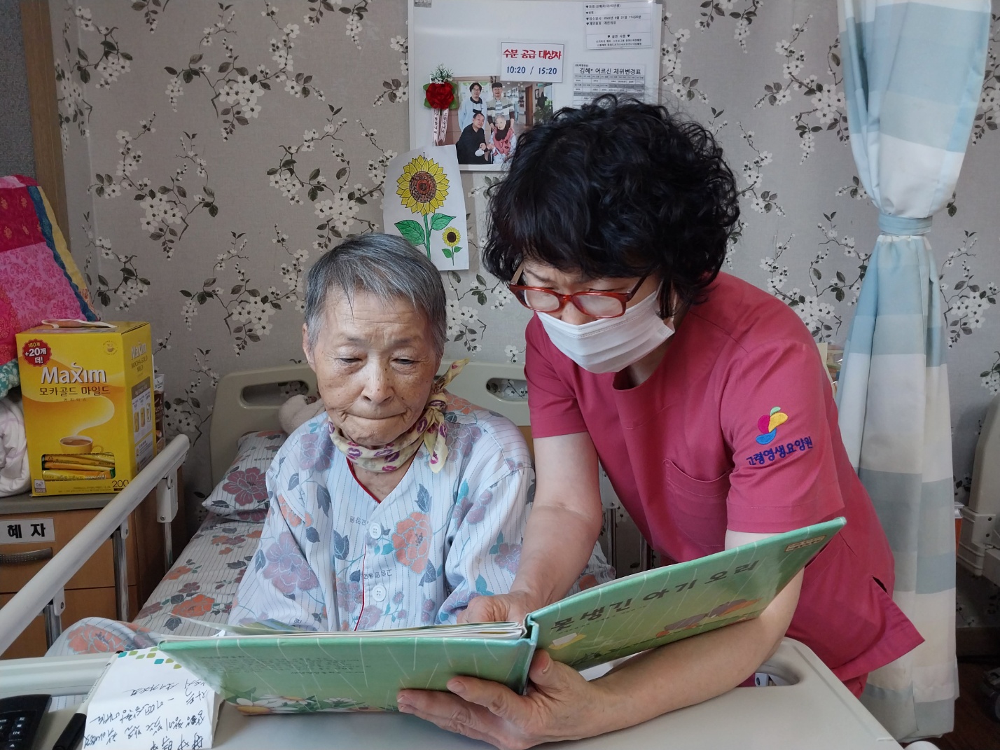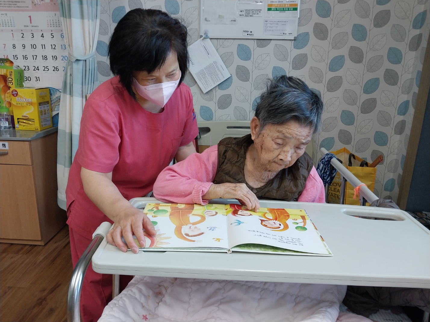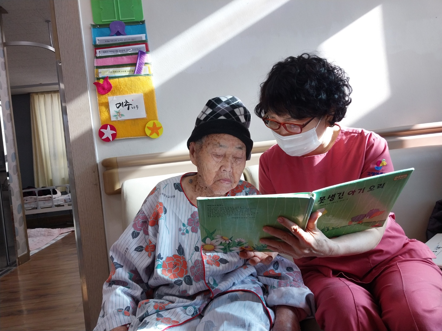 어르신들 목요일과 금요일은 목욕하시는 날로 이동 프로그램은 없으시지만 보호사 선생님들께서 어르신들과 교감하시며 책읽어드리는 날입니다 어르신들 스스로 책을 읽기도 하시고 함께 담소를 나누며 읽기도 하는 시간 늘 어르신을 가족처럼 생각하시는 보호사 선생님들의 노고에 감사드립니다.