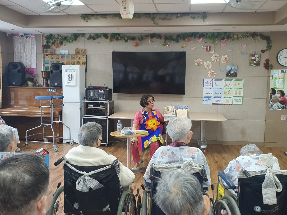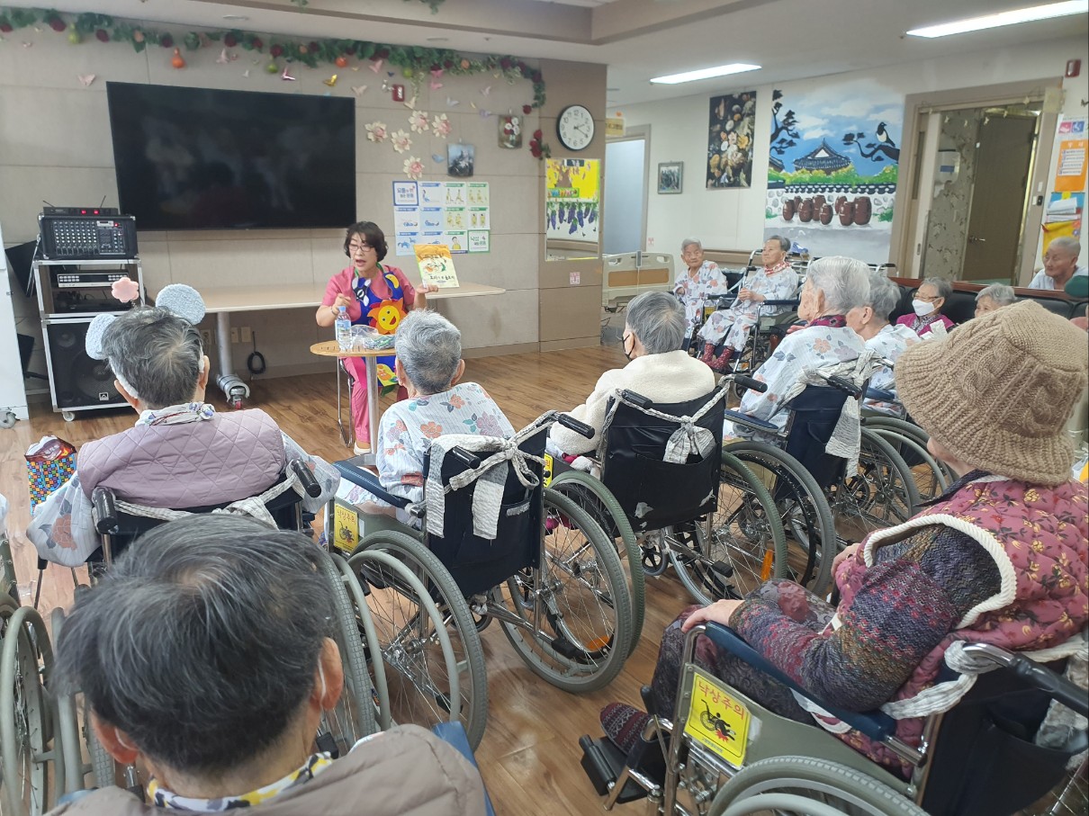 어르신들이 좋아하시는 시간으로 즐거운 동화와 운동으로 인지 쑥쑥 올라가는 시간을 가지셨습니다 망부석 이야기와 효자 이야기를 들려주셨습니다 ㅣ 고양이와 쥐 손유희도 들려주시고 전래동화로 즐거운 시간 들려주셨습니다 어르신들 즐거워 하셨습니다 |
