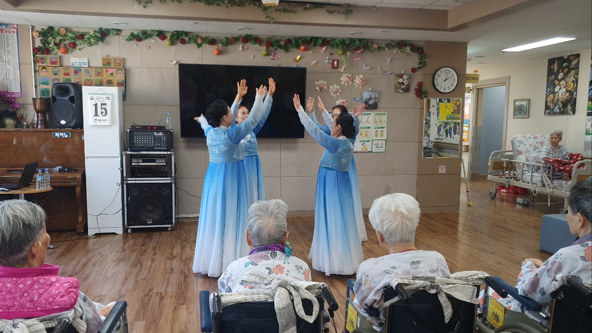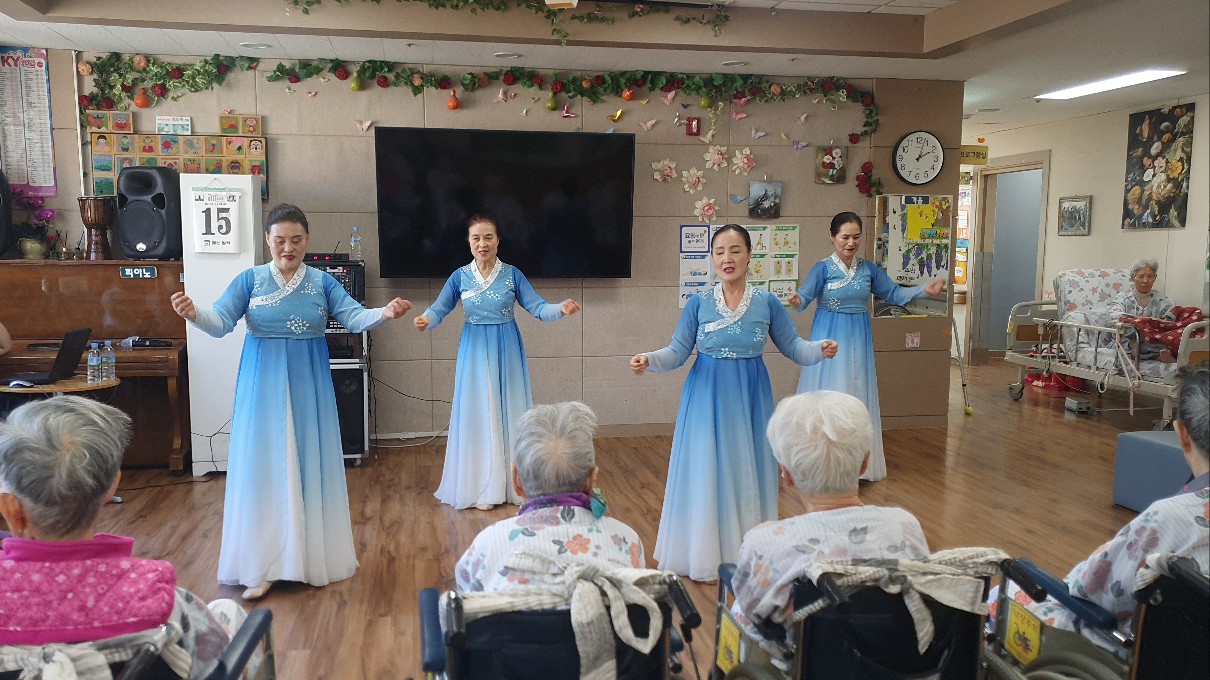 멋진 의상 입고 율동과 노래 손유희로 어르신들을 찾아 오시는 헤세드워크샵 찬양단은 매달 셋째주 월요일 어르신을 찾아 뵙고 즐거움과 활력을 주십니다. 매달 요양원을 방문하셔서 새로운 율동을 준비 해주시는데요 오늘도 어김없이 공연을 구상해 오셔서 즐거움을 주고 레크레이션을 따라하도록 해 주셔서 어르신 인지력도 쑥쑥 올려 주시고 계십니다 늘 어르신의 마음 안정과 몸과 마음을 건강하게 챙겨주시는 헤세드찬양단 감사합니다.