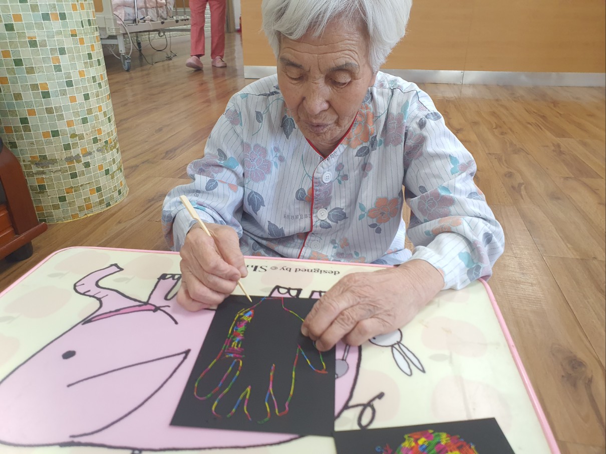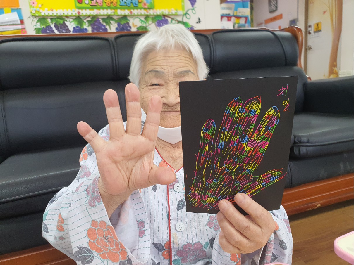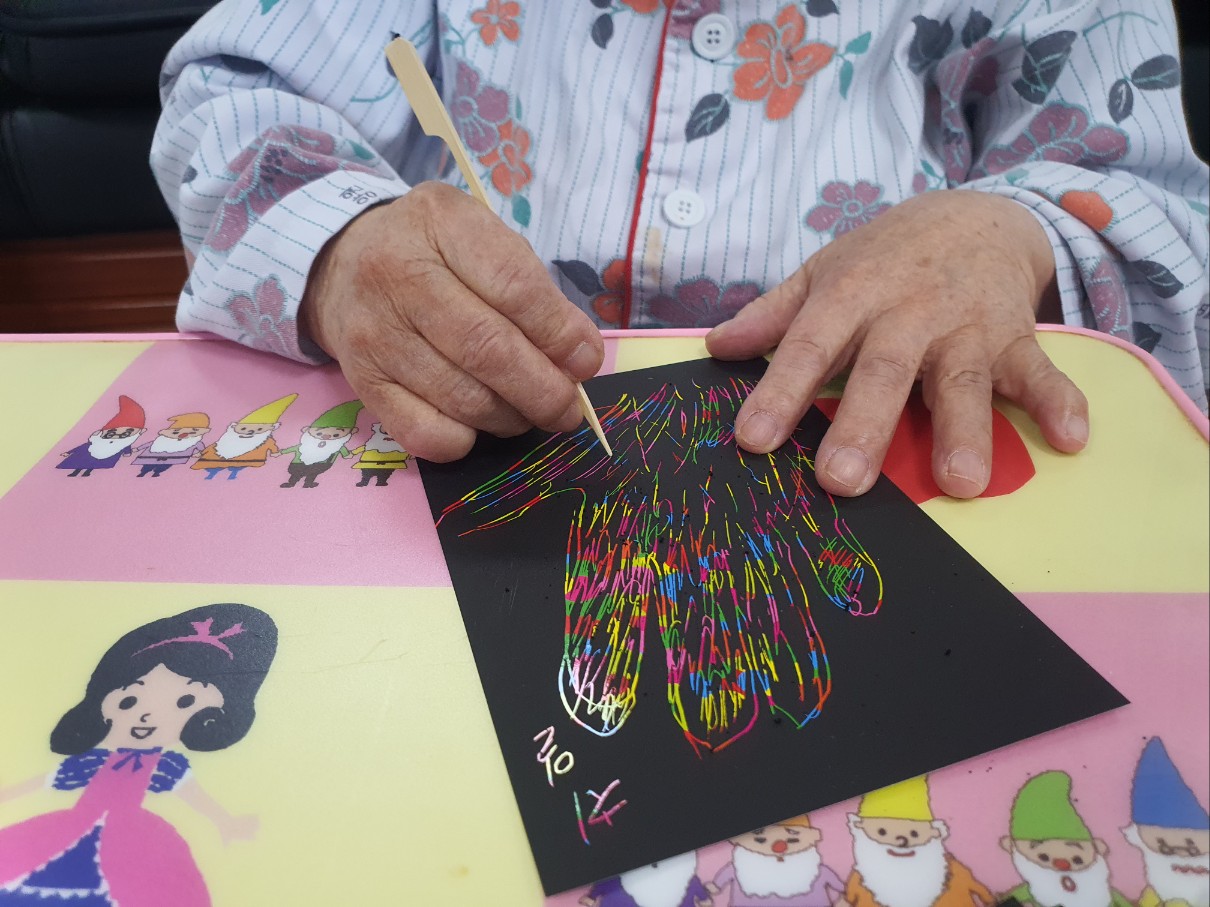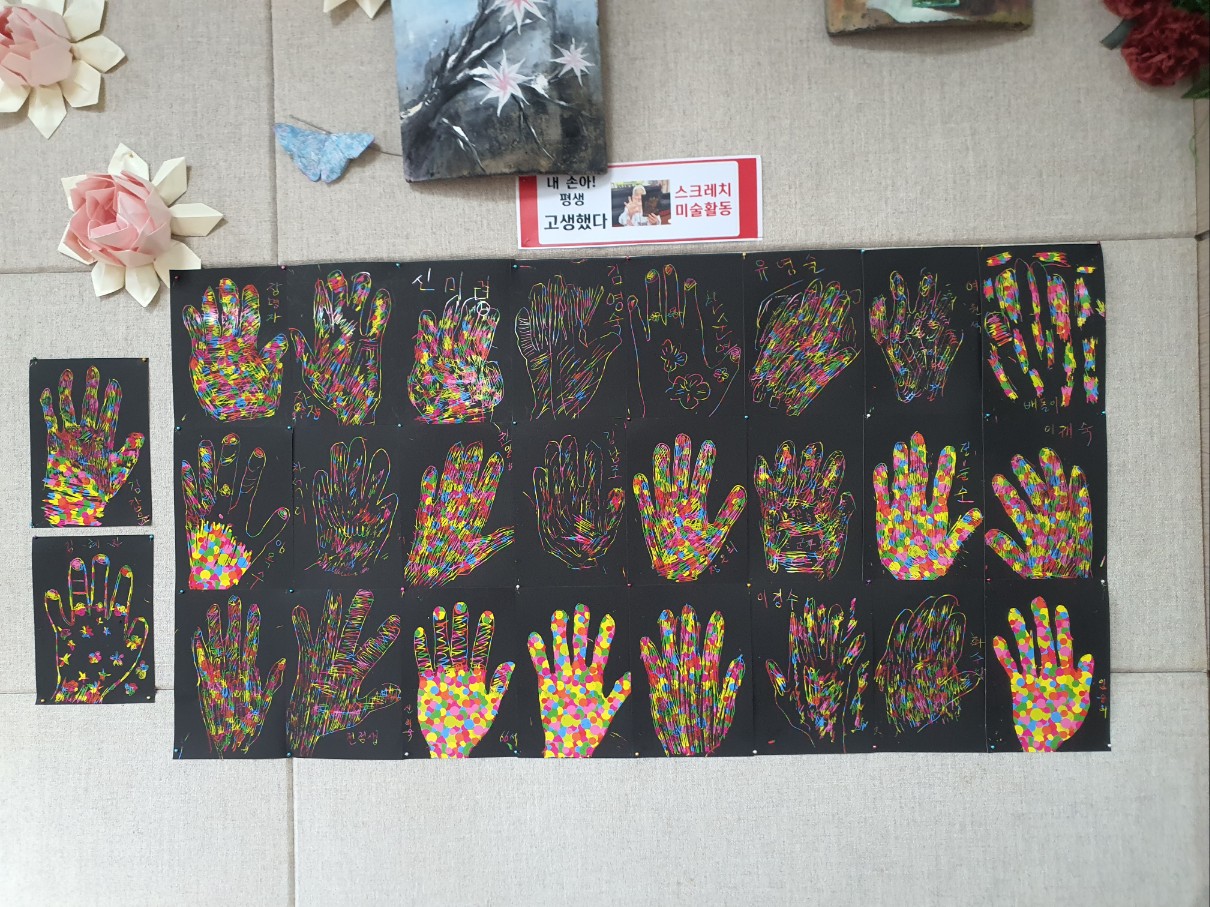 어르신이 지금까지 고생하신 손을 올려 꾸며보는 시간 스크레치 판에 손을 열려서 따라 그린 후 손에 반지도 표현하고 도구를 이용해 문질러 주며 색감을 다양하게 표현해 봅니다. 지금 까지 살아 오시면서 고생 손을 뒤돌아 보는 시간 수고했다 내 손아 이야기 하심 벽에 작품을 전시 해드렸더니 하나의 작품으로 합쳐 쳤다고 좋아하심