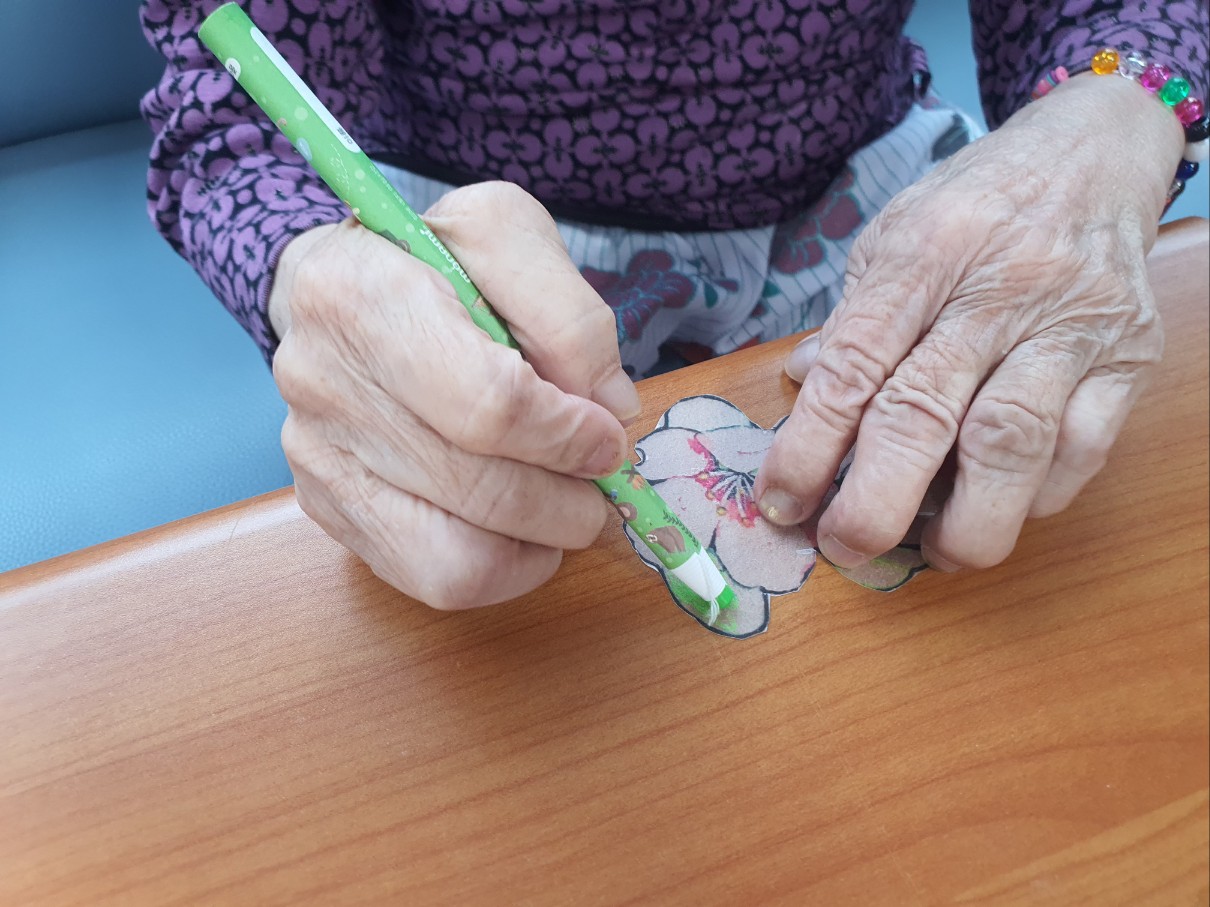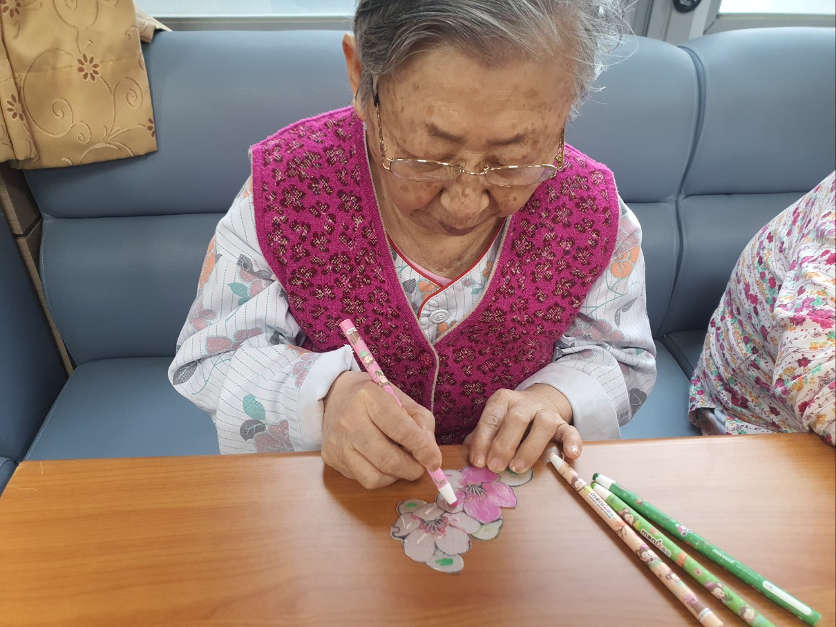슈링클스 용지에 그림을 인쇄해드리면 어르신들이 직접 색칠을 하시는 시간입니다 벚꽃 놀이는 못나가셔도 머리에 벚꽃핀 꼽으시고 즐거워 하심 어르신들 좋아하시는 색으로 색칠 하시고 슈링클스가 쪼그라 들어 작아지는 모습에 신기해 하시며 머리에 핀을 꼽아 드렸더니 이쁘다고 좋아들 하십니다. 너도 나도 머리에 벚꽃 슈링클스 핀을 꼽고 즐거워 하셨습니다. 마시멜로우 맛있게 먹고 즐거워 하심