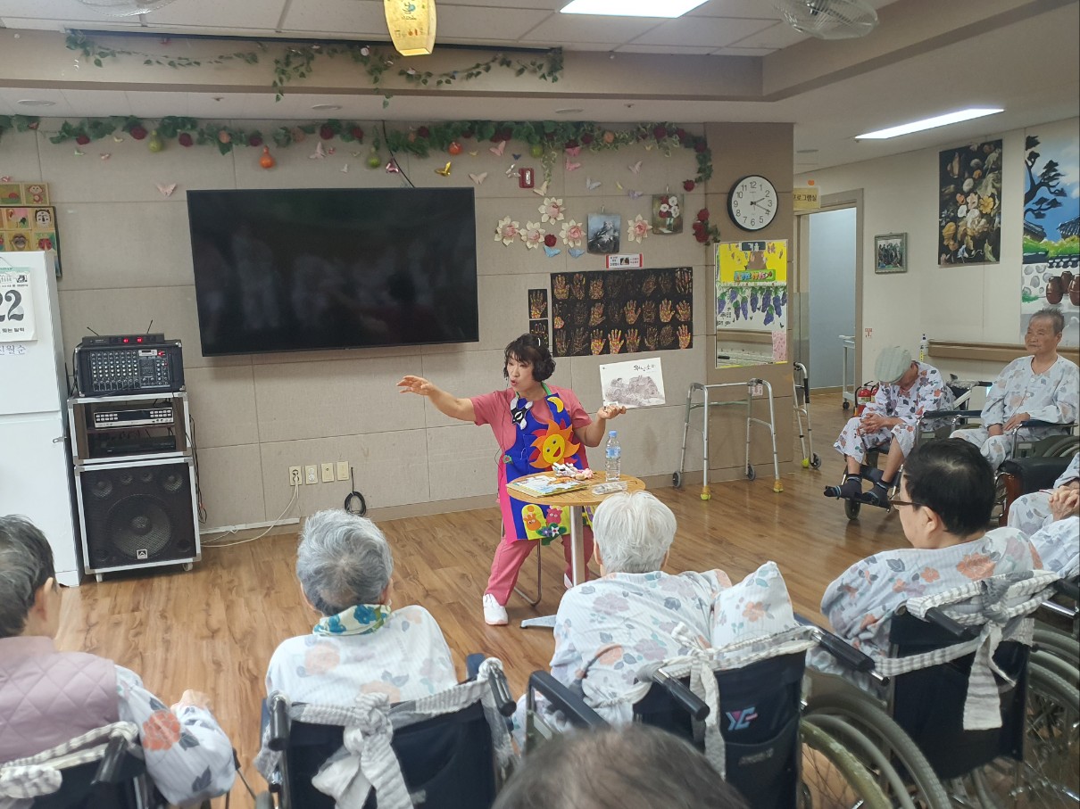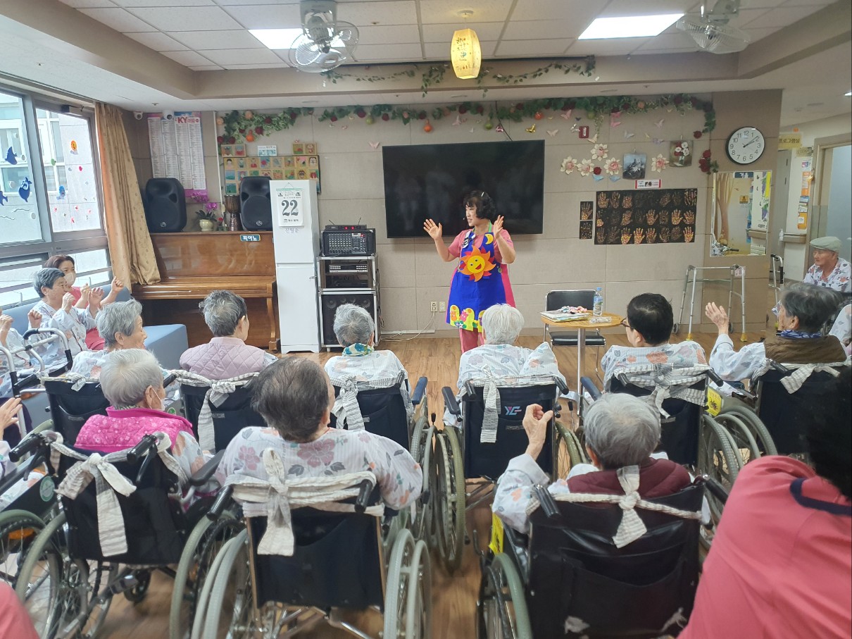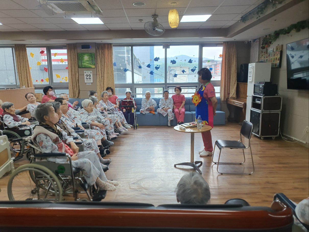 프로그램실에서 동화구연 즐거운 시간 보내셨습니다. 어르신들이 좋아하시는 시간으로 즐거운 동화와 운동으로 인지 쑥쑥 올라가는 시간을 가지셨습니다 워낭소리 이야기와 다섯 손가락 이야기로 즐거운 시간을 들려 주심