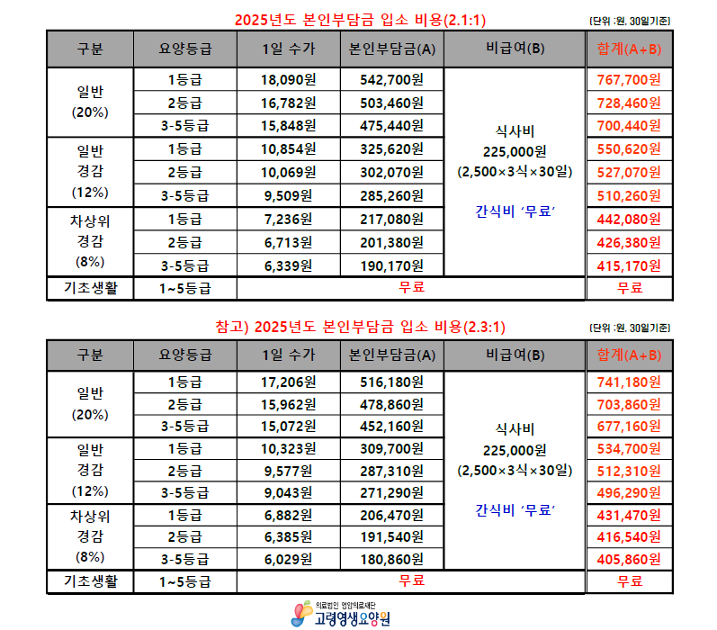 2025년 1월부터 시설 장기요양급여가 7.37% 인상 고시됐습니다. 보건복지부는 2025년 장기요양 수가 인상률을 발표, 1일당 비용이 1등급자 기준 84,240원에서 90,450원으로 6,210원 인상시켰습니다. 이번 수가 인상은 요양보호사 인력배치기준을 2.1:1로 강화 따른 것이라고 밝혔습니다. 이는 한 달 이용시 총 급여비용이 271만3,500원이고, 수급자의 본인부담 비용은 54만2,700원(비급여 제외)이 됩니다. (단 2.1:1 미흡시 2.3:1 수가체계 비용으로 하향됩니다) 또한 본원은 식자재비 인상에 따른 경영 어려움으로 인해 비급여인 식사비를 1끼당 기존 2,200원에서 2,500원으로 인상할 수 밖에 없음에 안타까운 마음으로 양해를 구하고자 합니다. 이에 따라 보호자님이 납부하는 본인부담금이 2024년도 비해 인상이 불가피하게 됐음을 안내드립니다. (월 30일 기준 최소 40,050원~최대 64,260원) 본원은 장기요양기관의 어려운 현실을 잘 극복하며 더욱 더 '정성어린 섬김과 즐거움 가득한 곳'으로 만들어 가겠습니다. |