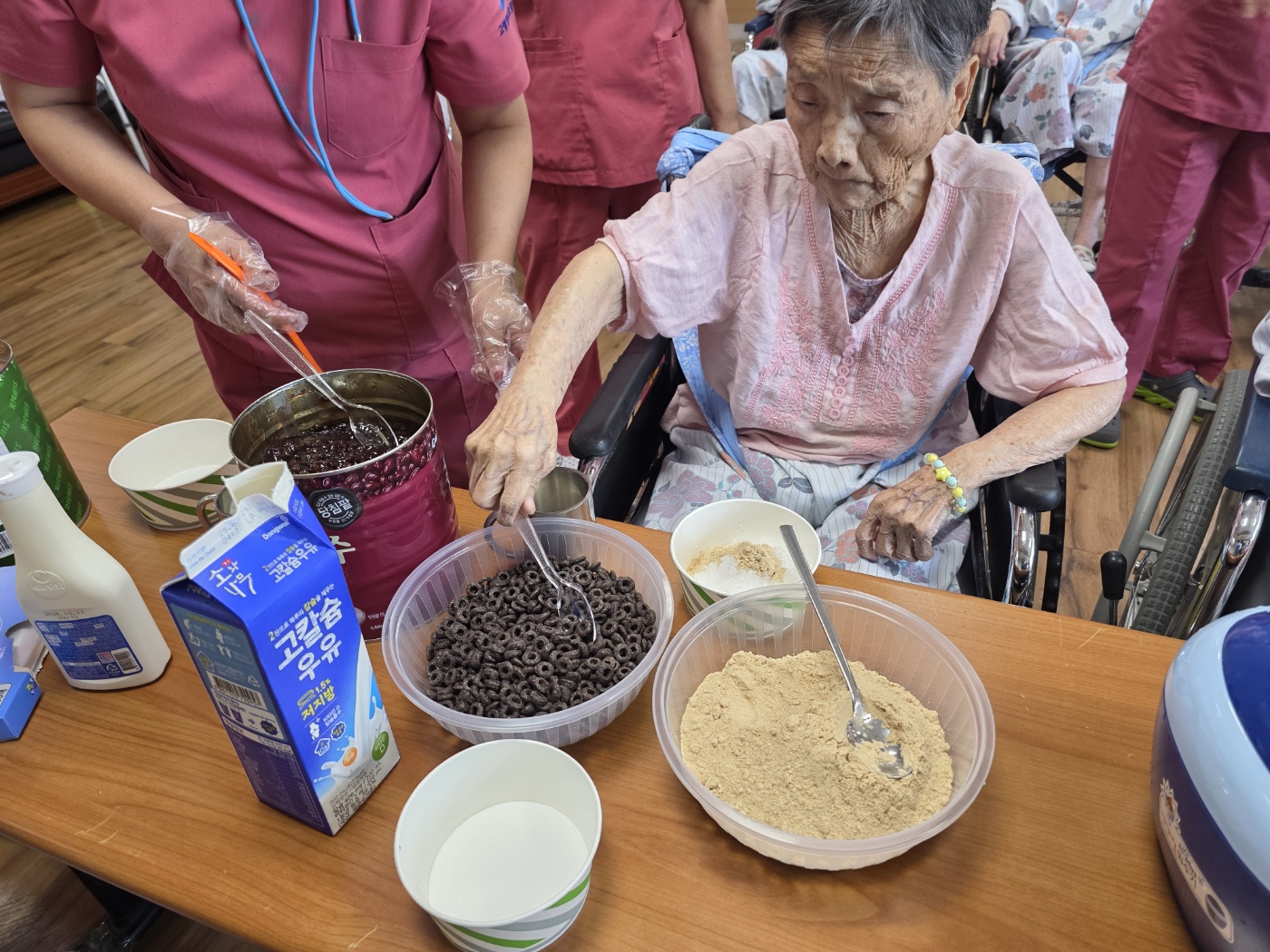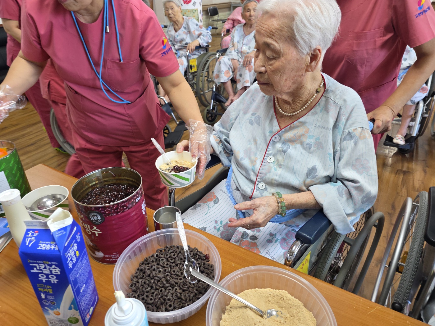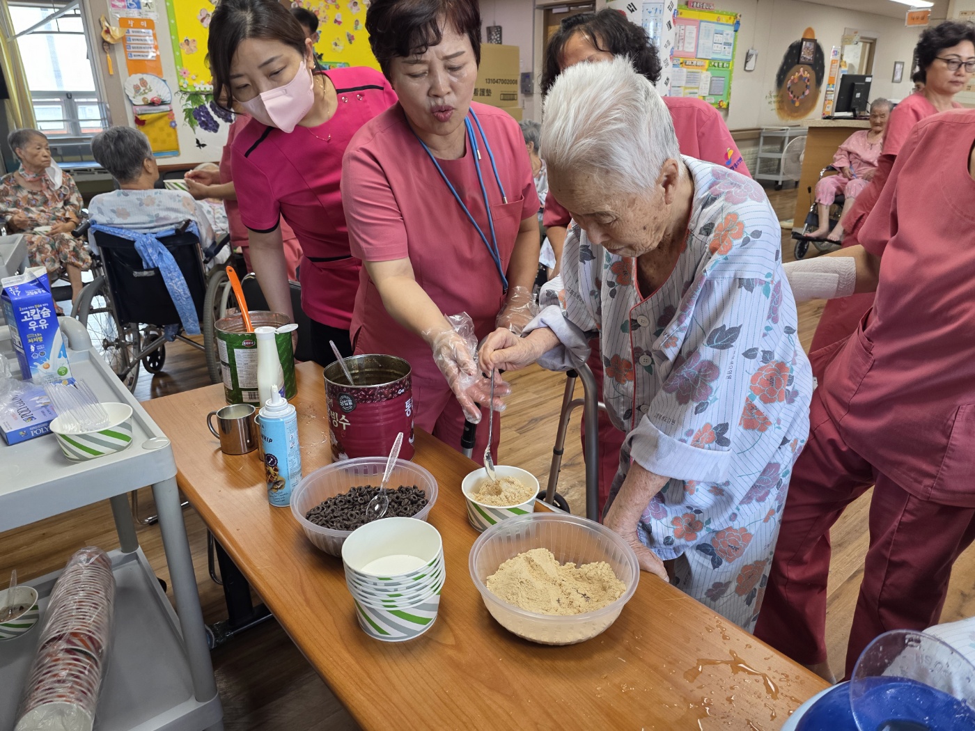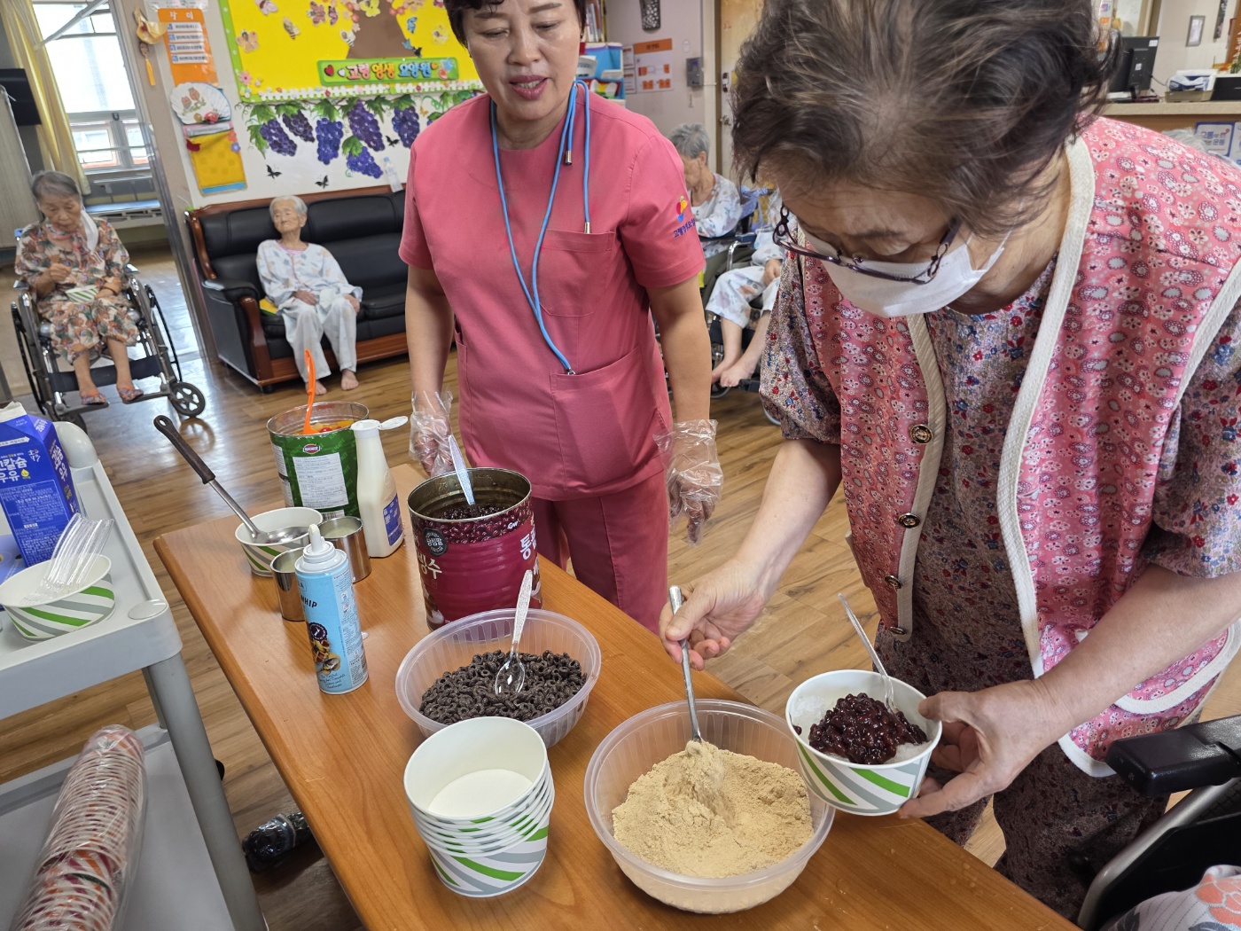 어르신들이 직접 얼음을 갈고 다양한 재료를 선택해 나만의 팥빙수를 만들어보는 시간을 통해 큰 만족감을 표현하셨습니다. 특히 본인이 좋아하는 과일이나 팥, 연유 등을 스스로 선택해 넣는 과정에서 어르신들의 주도적인 태도가 돋보였으며, 자신이 만든 빙수를 맛보며 흐뭇해하시는 모습에서 자존감 향상 효과도 확인할 수 있었습니다. 활동 중 이웃 어르신들과 서로의 빙수를 비교하며 이야기꽃을 피우고, 도와주고 권유하는 모습도 보여져 사회적 상호작용의 기회가 자연스럽게 이루어졌습니다. 평소에는 말씀이 적으신 어르신께서도 "이건 내가 갈았어"라며 적극적으로 대화에 참여하셨다는 점이 인상적이었습니다. 무더운 여름철에 시원한 간식을 직접 만들어보는 경험은 계절에 대한 인식을 높이는 데도 도움이 되었으며, 어르신들께 작은 활력과 기쁨을 안겨드린 의미 있는 시간이었습니다.