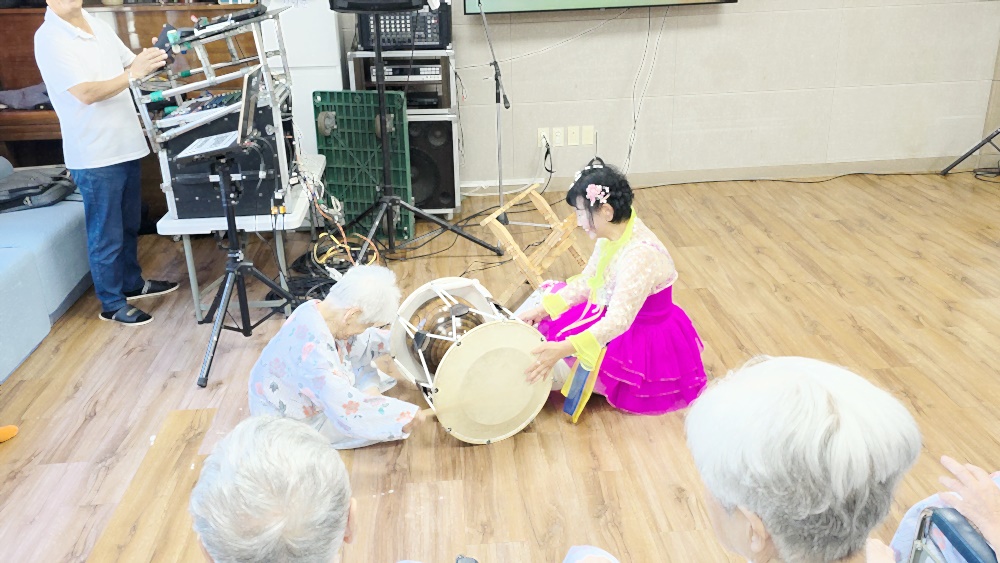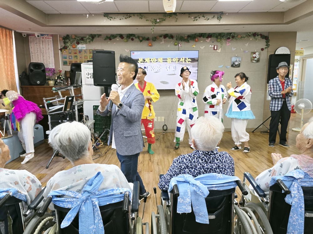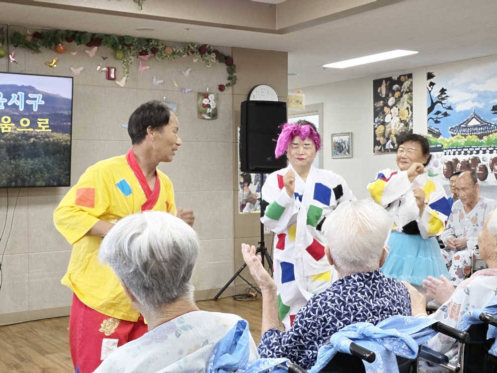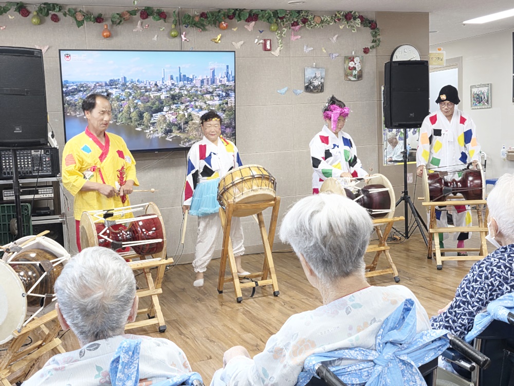 가인회와 고령 운수대통 장구 봉사단이 방문하여 어르신들께 흥겨운 문화 공연을 선사해 주셨습니다. 장구 공연, 색소폰 연주, 노래와 춤까지 다양한 볼거리와 즐길 거리가 가득한 시간이었습니다. 어르신들께서는 장단에 맞추어 손뼉을 치시고, 장구를 직접 두드리시며 적극적으로 참여하셨으며, 일부 어르신들께서는 무대로 나와 춤을 추며 흥을 나누는 모습도 보였습니다. 이러한 활동을 통해 어르신들의 정서적 안정과 활력 증진에 큰 도움이 되었으며, 자연스러운 신체 움직임과 사회적 교류의 기회를 제공할 수 있었습니다. 특히 평소 말씀이 적으시던 어르신도 리듬에 맞춰 미소 지으시고 몸을 움직이시는 모습이 인상 깊었습니다. 전반적으로 어르신들이 매우 만족해하시며 다음 공연에 대한 기대감을 표현해 주셨고, 일상에 활력을 불어넣는 소중한 문화 복지 프로그램으로 자리매김하는 시간이 되었습니다 |