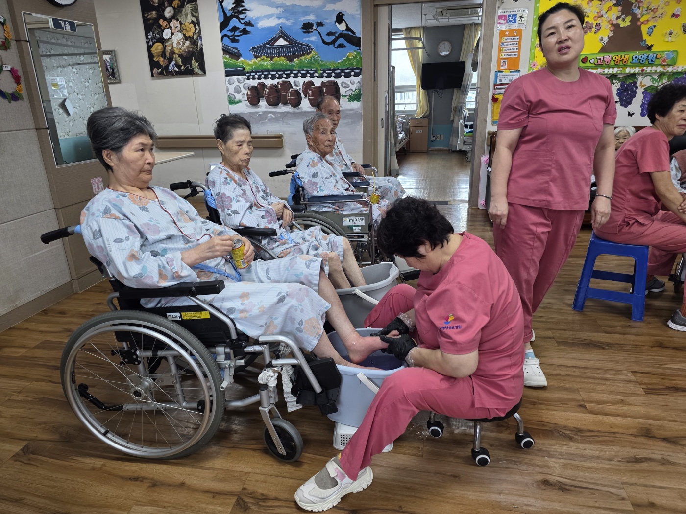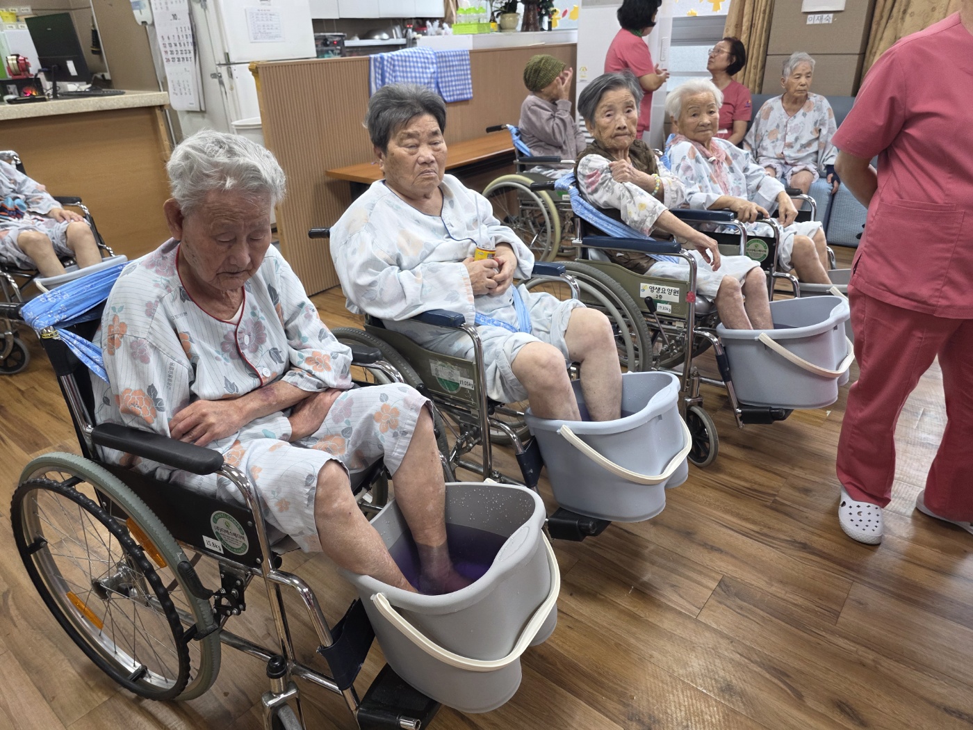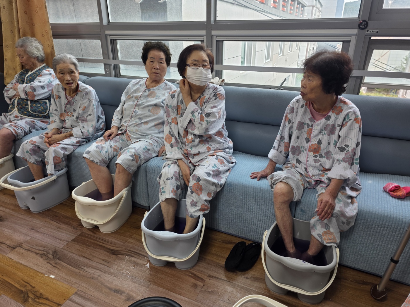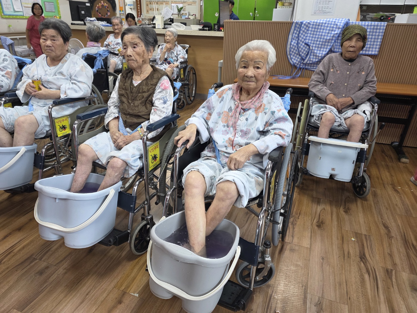 날씨가 제법 선선해진 오늘, 따뜻한 물에 발을 담그며 시원한 가을 공기를 함께 느낄 수 있는 아로마 족욕 프로그램을 진행했습니다. 아로마 오일과 입욕제를 넣어 혈액순환을 돕고 피로를 풀어드렸으며, 식혜와 사탕을 함께 나누며 즐거운 담소의 시간도 가졌습니다. 어르신들께서 “발이 따뜻하니 몸도 편안하다”, “기분이 상쾌하다”며 만족감을 표현하셨습니다. 족욕 후 얼굴에 미소가 번지고, 서로의 손을 잡고 감사 인사를 나누는 모습이 인상적이었습니다.