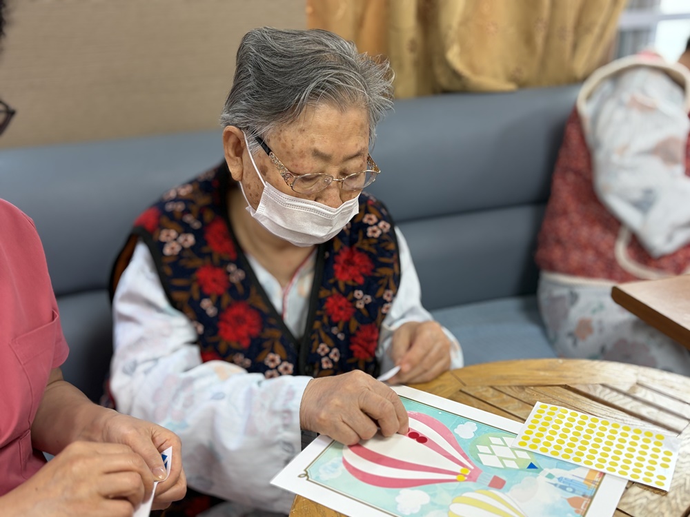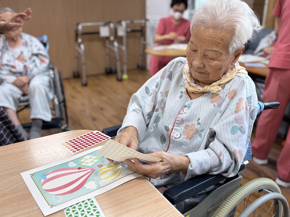 동화를 함께 읽으며 어르신들이 이야기에 공감하고 웃음을 나누는 즐거운 시간이 되었습니다. 동화 내용을 통해 따뜻한 위로와 긍정적인 메시지를 느끼셨고, 이후 진행된 독도를 표현한 모형 색칠 활동에서는 집중하며 색을 고르고 맞추는 과정에서 성취감과 만족감을 표현하셨습니다. 어르신들은 “책 읽는 시간이 참 좋다”, “색칠하니 마음이 편해진다” 등 긍정적인 반응을 보이셨으며, 인지 자극과 정서적 안정 모두에 도움이 된 프로그램이었습니다. 기구를 타고 하늘로 날아가는 모습을 스티커로 표현하심