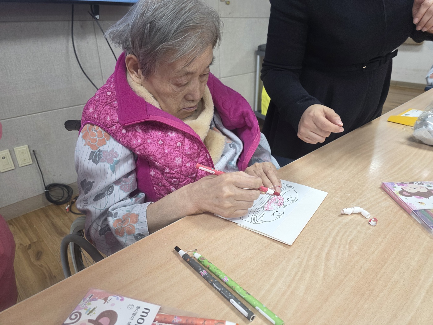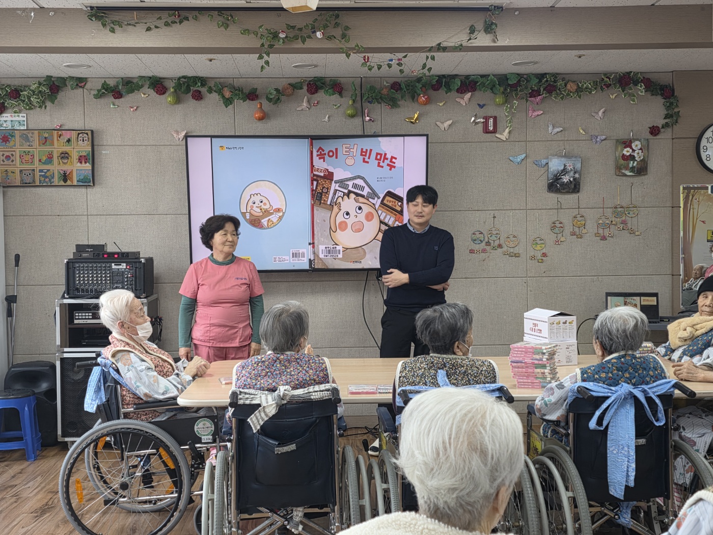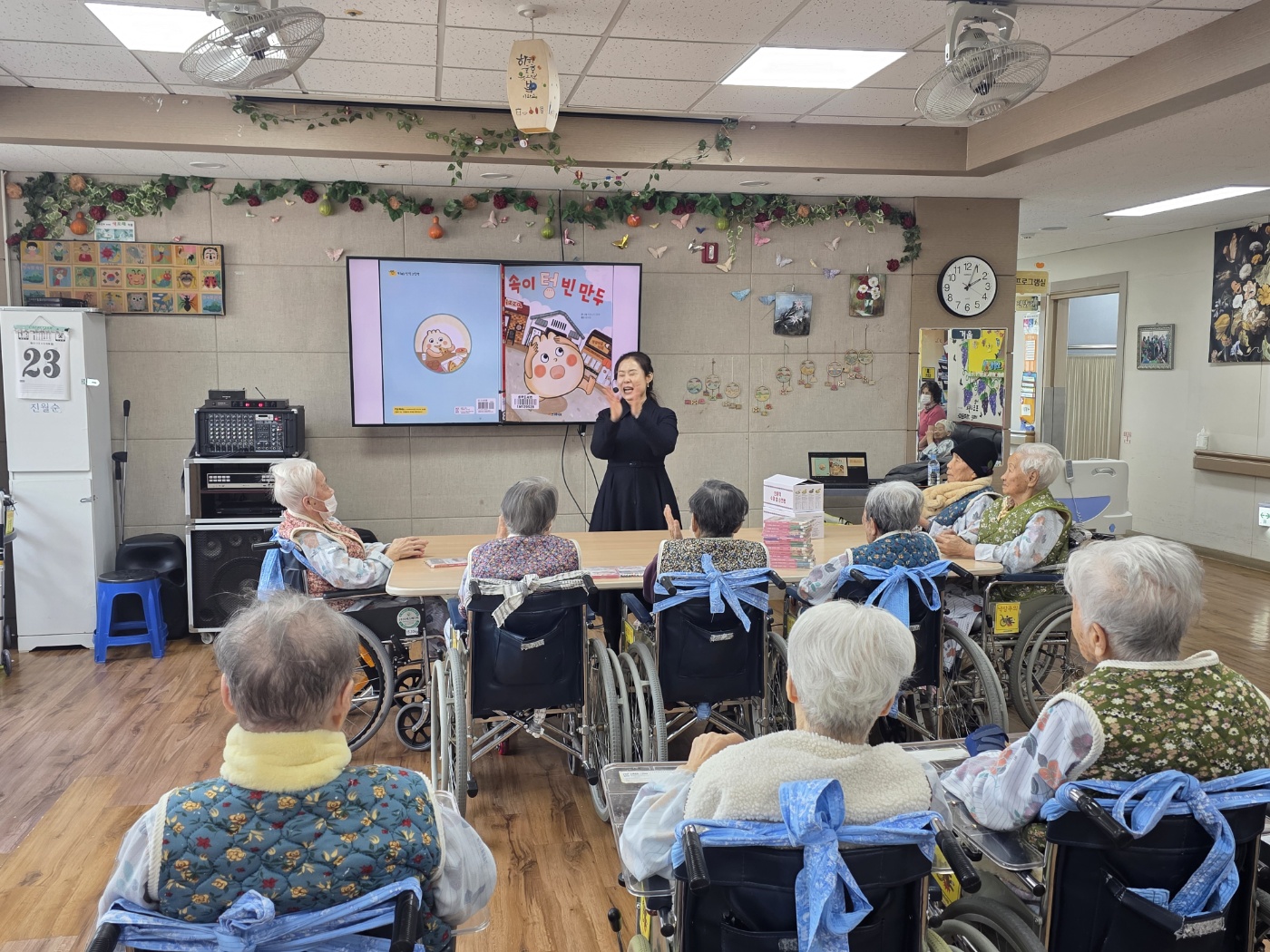 도서관 동화구연 시간에는 「속이 빈 만두」 이야기를 들려주며 프로그램을 진행하였습니다. 어르신들은 속이 빈 만두가 자신의 자리를 찾아가는 이야기 전개에 흥미를 보이시며 웃음과 반응으로 즐거워하셨습니다. 이번 시간이 마지막 수업인 만큼, 강사님께서 안흥찐빵을 준비해 오셔서 찐빵 색칠 활동을 함께 진행하였습니다. 어르신들께서 찐빵 그림을 색칠한 후 실제 찐빵을 안에 넣어 드리자 더욱 즐거워하시며 만족감을 표현하셨습니다. 마지막 수업을 맞아 감사의 마음을 전하고자 요양원에서는 고령 특산물인 소문난 떡을 전달드렸습니다. 어르신들은 수업이 마무리되는 것을 아쉬워하시며 다음 해 다시 진행될 동화구연 시간을 기대하는 모습을 보이셨습니다. 이번 프로그램은 어르신들께 즐거움과 정서적 만족을 제공한 뜻깊은 시간이었습니다. |