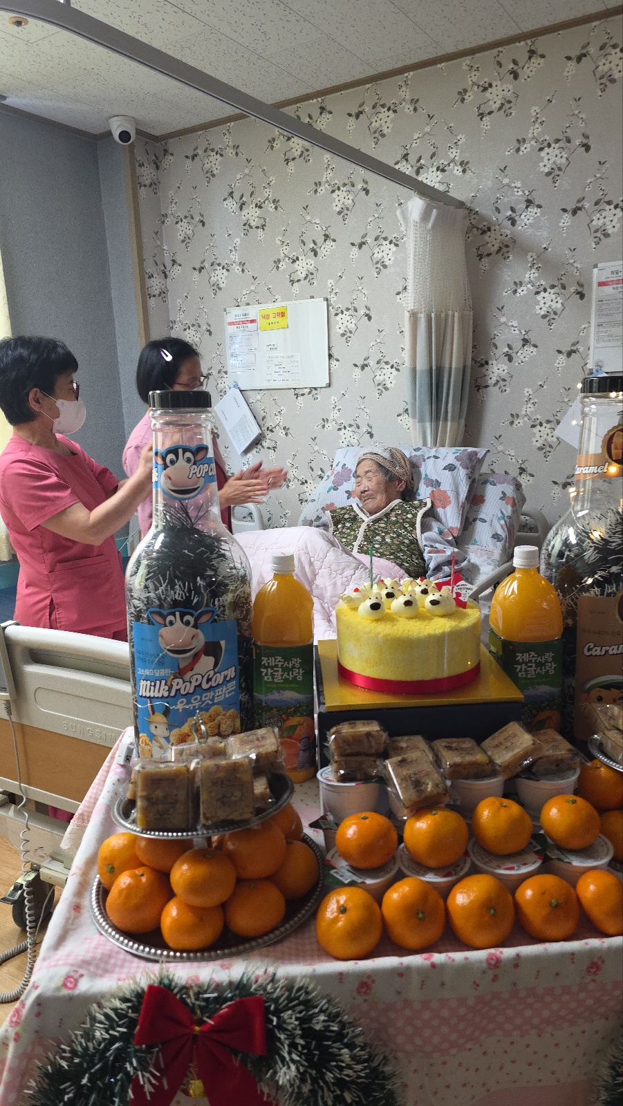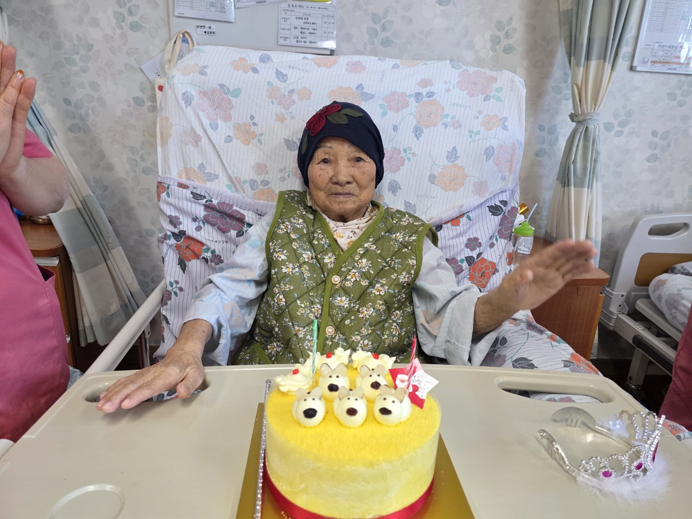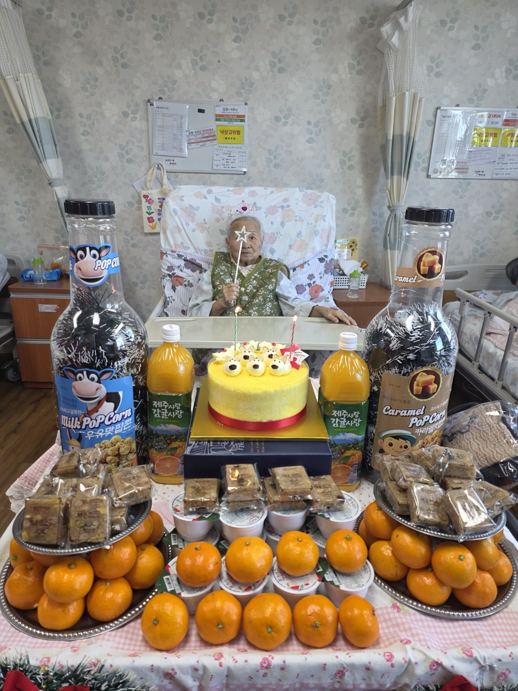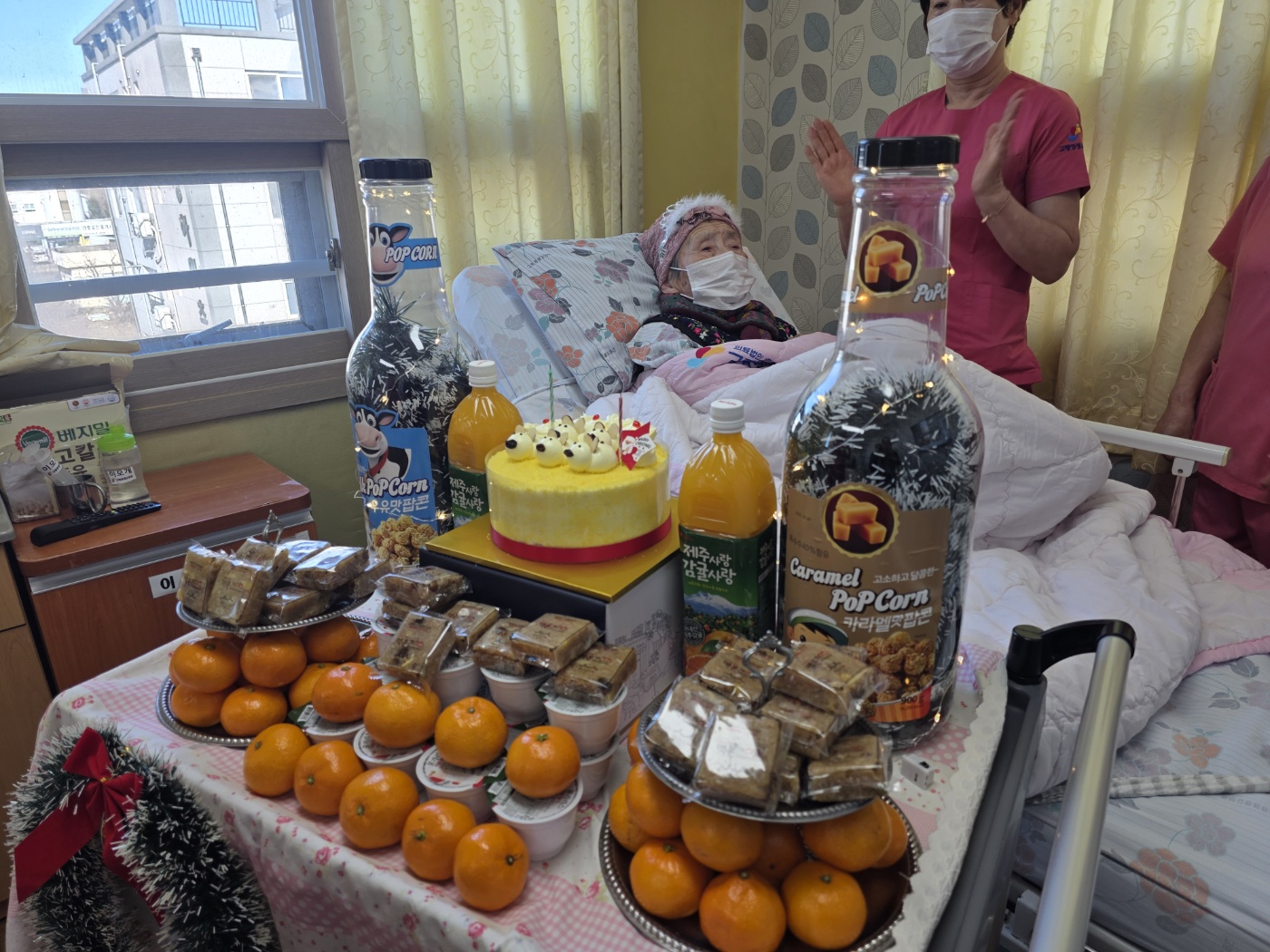 오늘 어르신의 생신을 맞아 소소하지만 정성 가득한 생신잔치를 진행하였습니다. 또한 실내에서 착용하시기 좋은 머리두건을 생신 선물로 준비해 드려 어르신들께서 더욱 기뻐하셨습니다. |
