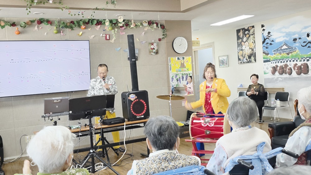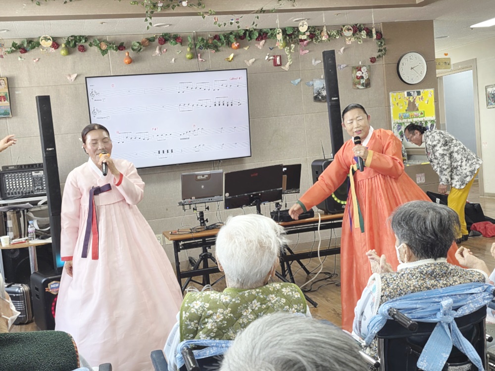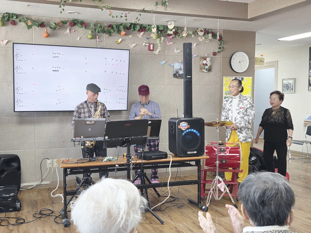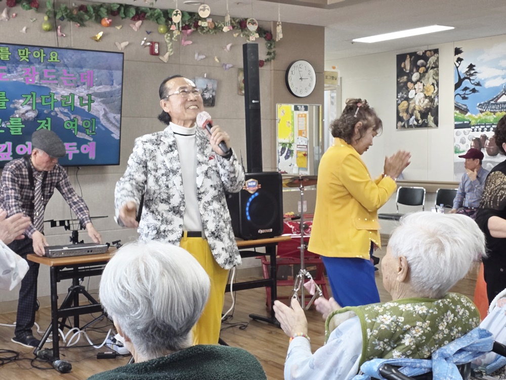 매달 어르신들의 즐거움을 위해 다사랑 & 밝사모 봉사단이 꾸준히 방문해 주시며, 대구·안동 등 먼 거리에서도 장구, 색소폰, 노래, 하모니카, 민요 등 다양한 공연을 정성껏 진행해 주고 계십니다. 다채로운 공연 구성으로 어르신들의 흥미와 참여도가 높았으며, 웃음과 박수가 끊이지 않아 정서적 안정과 활력 증진에 큰 도움이 되었습니다. 늘 변함없이 따뜻한 나눔을 실천해 주시는 봉사자분들께 깊은 감사의 마음을 전합니다. |